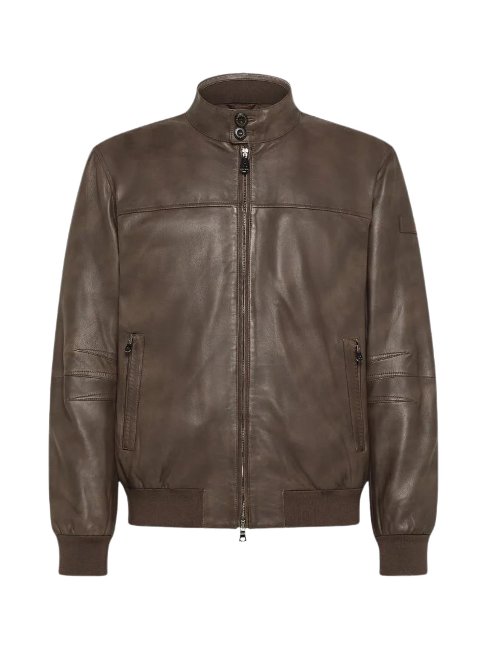 Giacca Peuterey corta in pelle con lavorazione artigianale effetto vintage, caratterizzata da zip centrale a doppio cursore, imbottitura in piuma naturale certificata, fondo e polsini in maglina; realizzata in 100% pelle color marrone cioccolato.