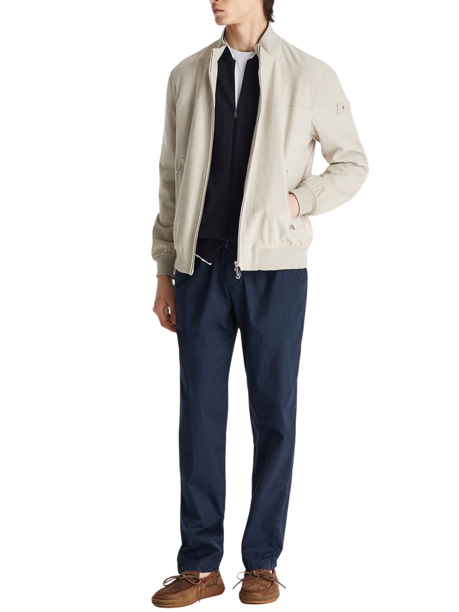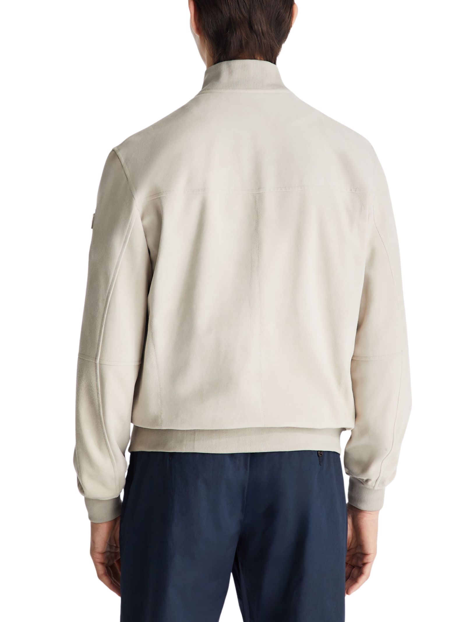 Giacca modello bomber in morbida pelle scamosciata, un classico intramontabile del guardaroba maschile. Il modello presenta collo in piedi, chiusura frontale con zip metallica a doppio cursore e tasche laterali con zip, unendo funzionalità ed eleganza. Fondo, polsini e collo in maglia elastica garantiscono comfort e vestibilità. Dal fit regolare, è un capo versatile che esprime stile raffinato e qualità artigianale. Composizione: 100% pelle.