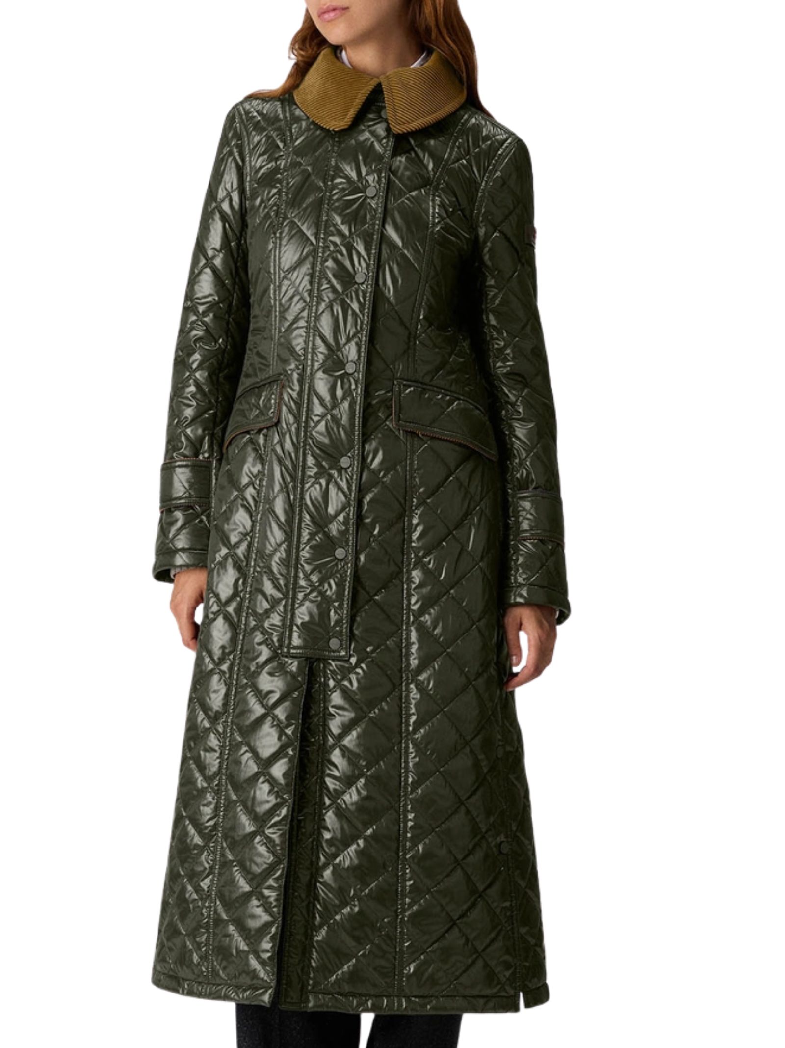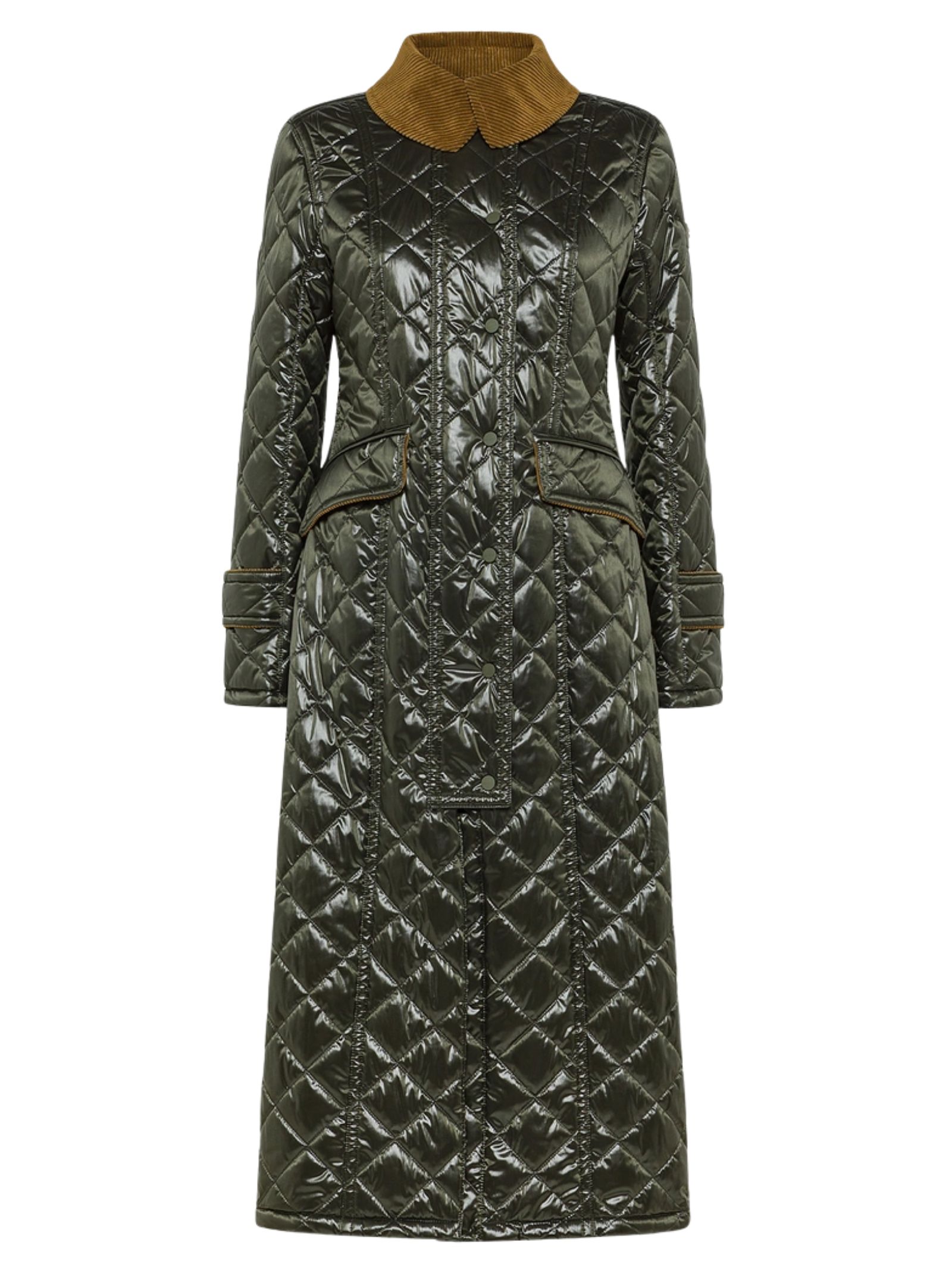 Cappotto trapuntato lungo in tela di nylon con tessuto di un effetto lucido e cangiante, unito a una mano. Colletto in velluto a costine, in contrasto colore, aggiunge una nota rétro sofisticata. La zip centrale è nascosta da una patta con bottoni. Novità di stagione della linea Countryside, che rivisita i classici britannici con una visione moderna e femminile.