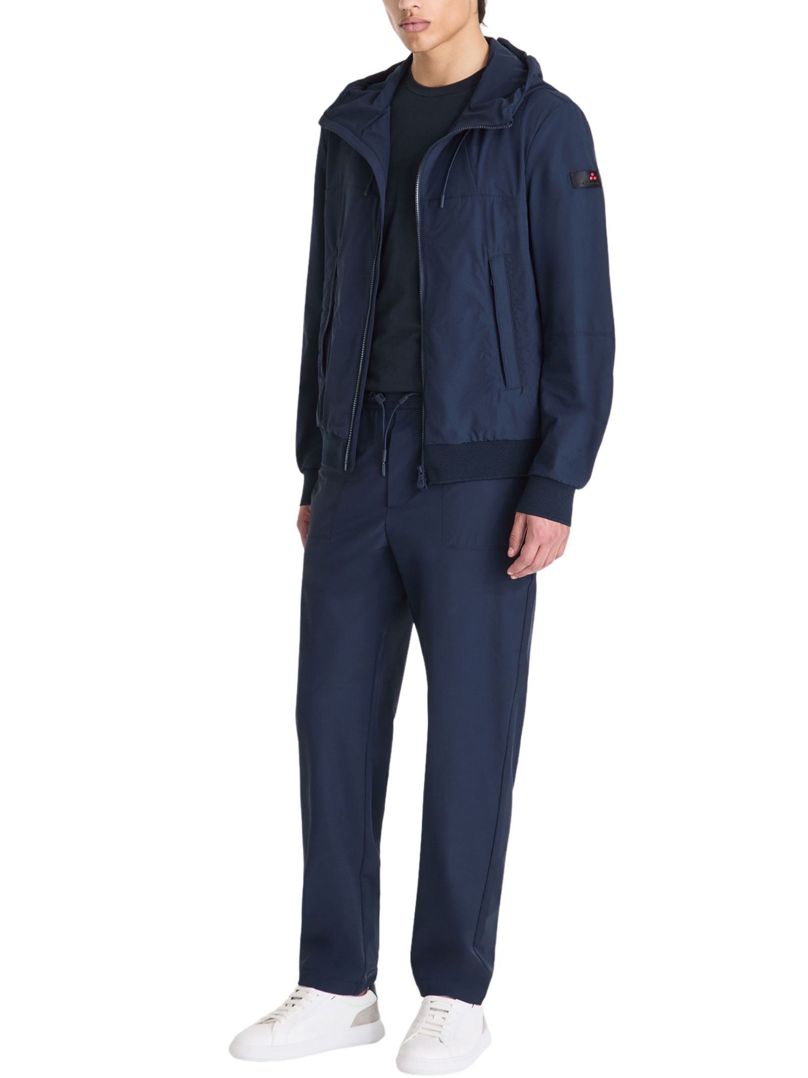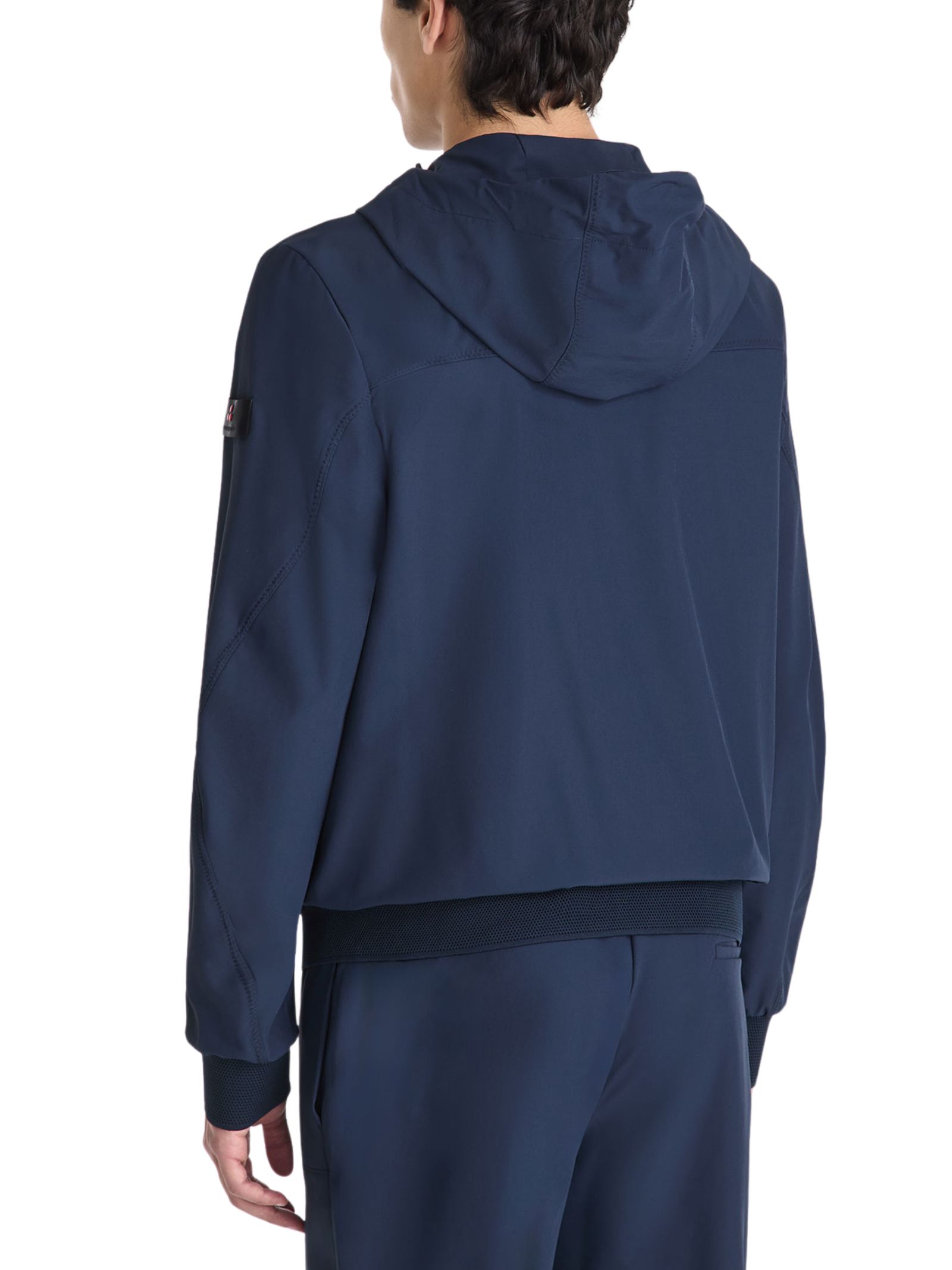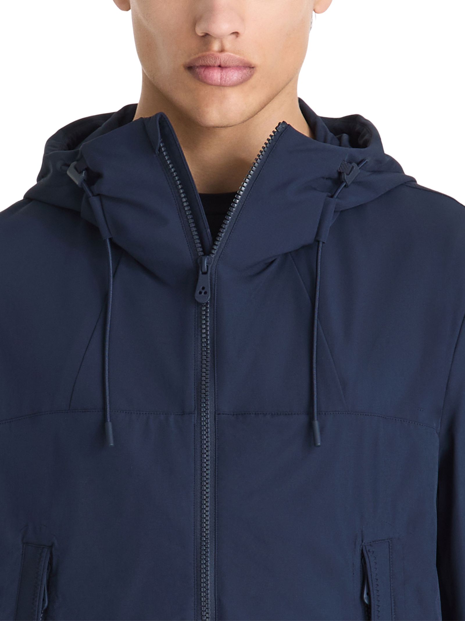 Giacca corta con cappuccio in tela tecnica di nylon stretch, caratterizzata da un aspetto opaco e leggermente mosso. Il design sportivo include cappuccio con tiranti regolabili, chiusura frontale con zip a doppio cursore, tasche laterali e fondo e polsini in maglia per maggiore comfort. Dal fit regolare, fa parte della linea Transeasonal, pensata per accompagnare i cambi di stagione. Idrorepellente e priva di PFC, unisce funzionalità, stile contemporaneo e praticità quotidiana.