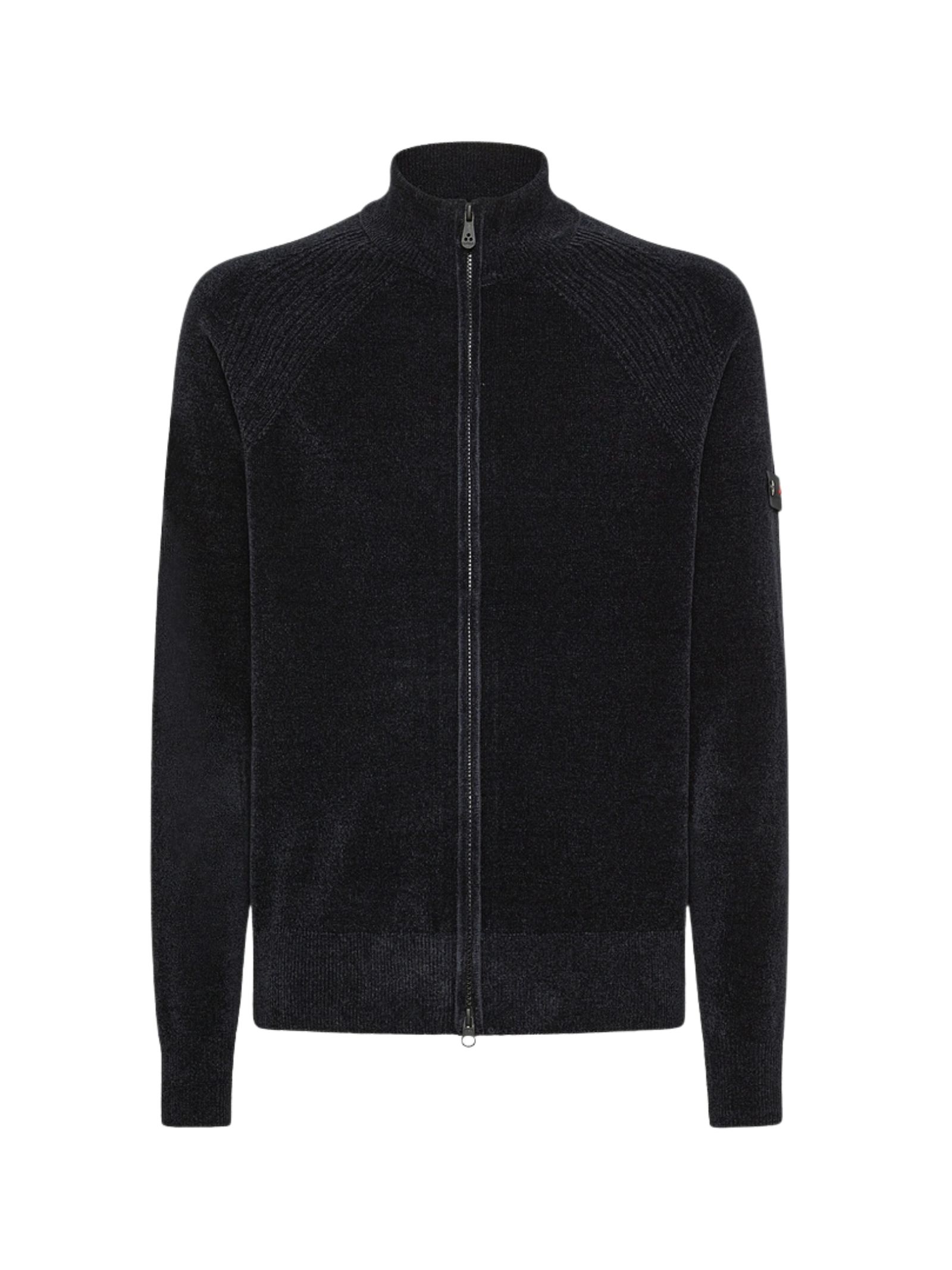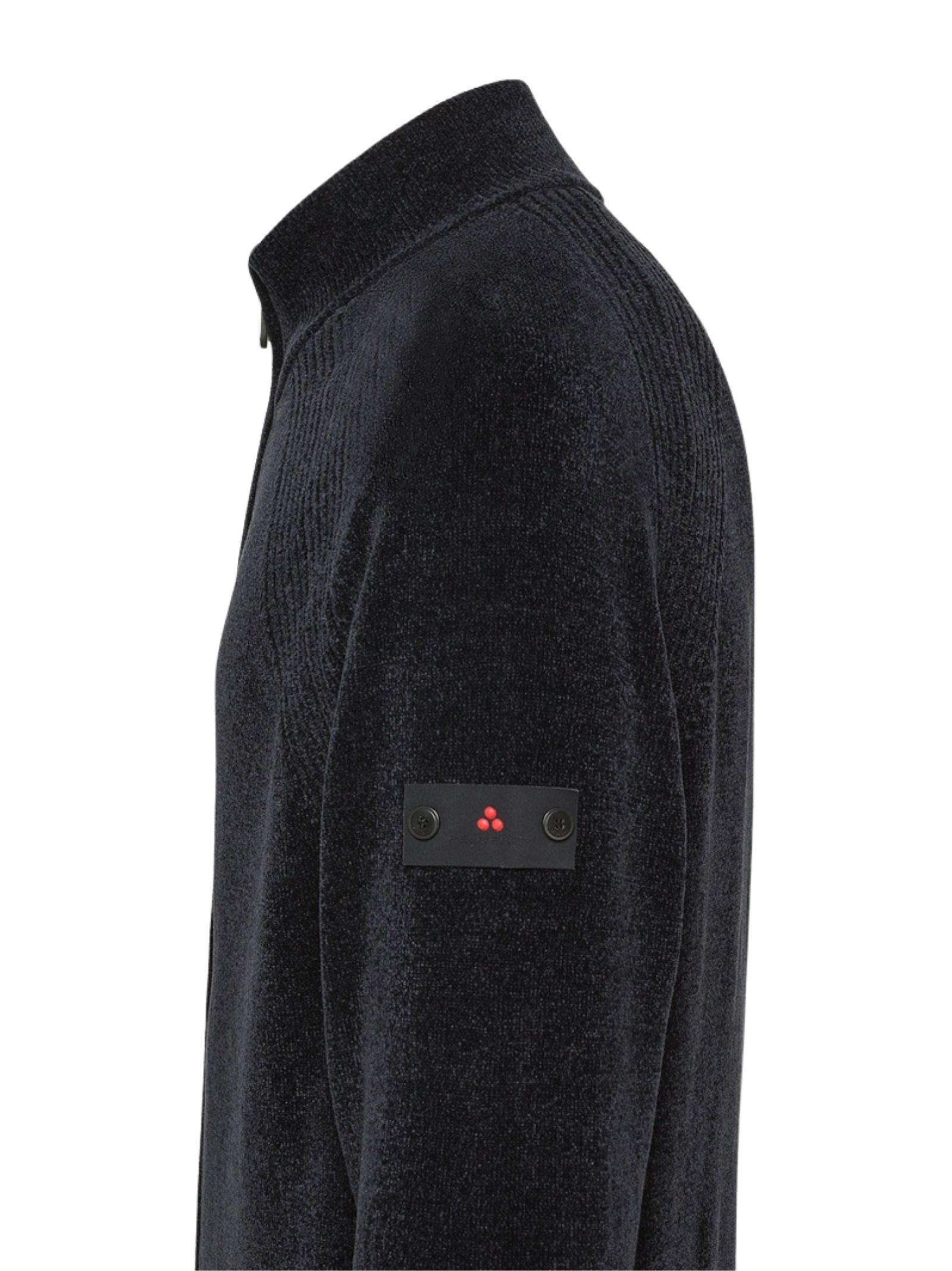 Maglia in ciniglia rasata con zip centrale a doppio cursore, morbida e luminosa, rifinita con collo, fondo e polsini a coste. Il logo Peuterey Trilogy con bottoncini è applicato in modo discreto sul braccio sinistro. Un capo basic, confortevole e versatile grazie alla texture soffice della ciniglia.
