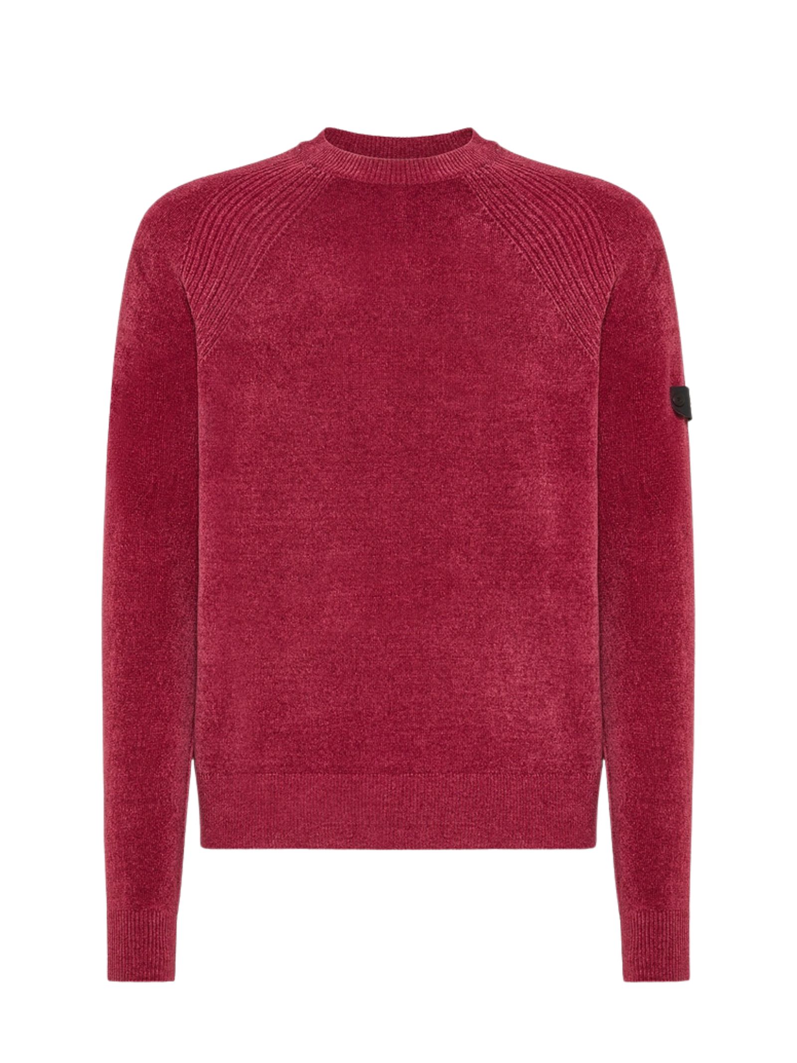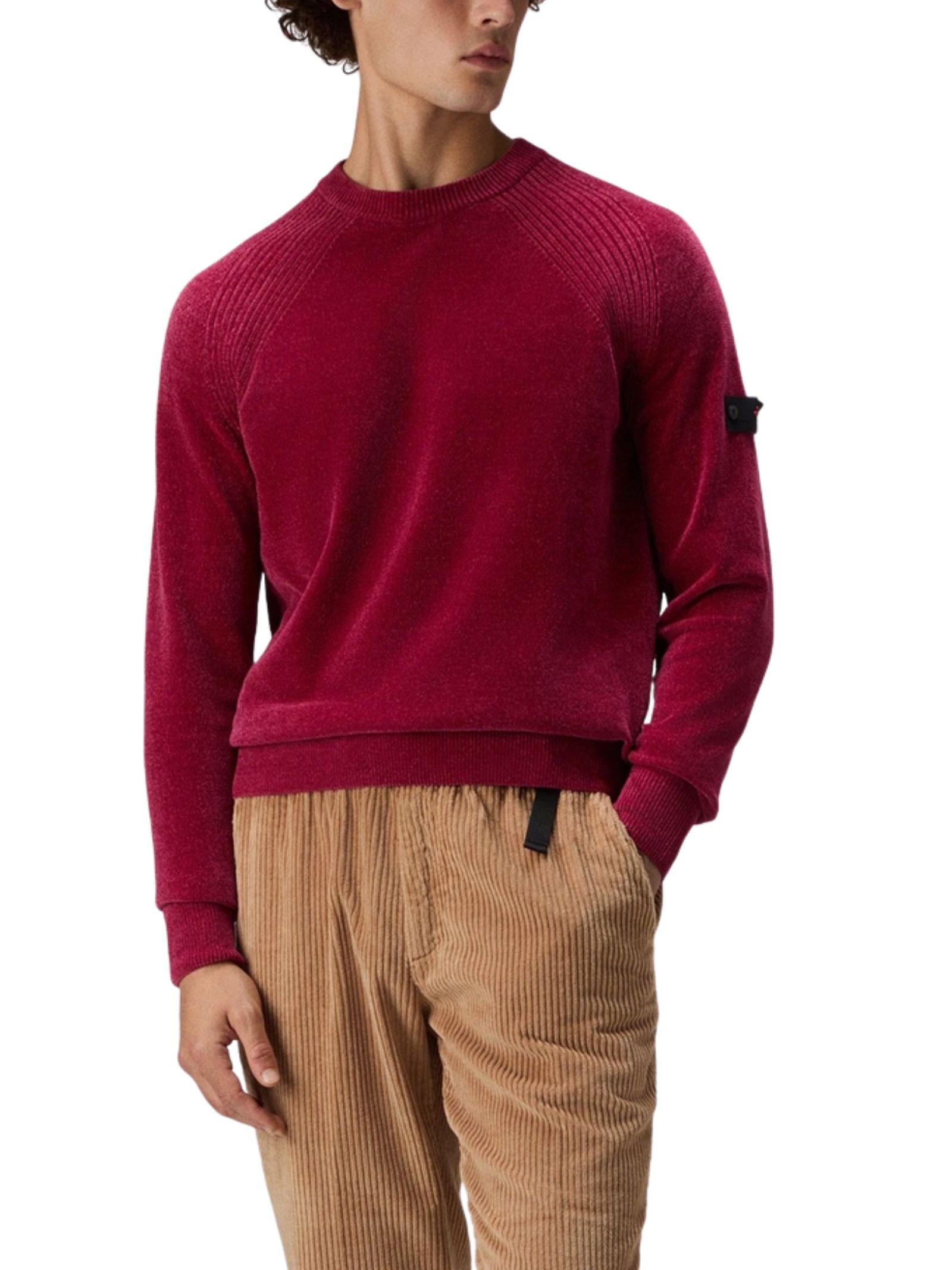 Maglia girocollo color porpora in ciniglia rasata dal tatto vellutato e avvolgente, con bordi a costine su collo, polsini e fondo; personalizzazione discreta con logo Trilogy applicato sulla manica sinistra tramite bottoncini, un capo classico e contemporaneo per un look casual ed elegante, in 82% poliestere, 15% poliamide, 3% fibra elastica.