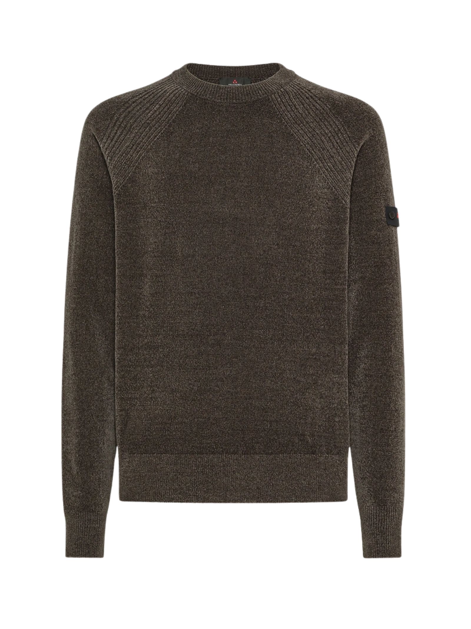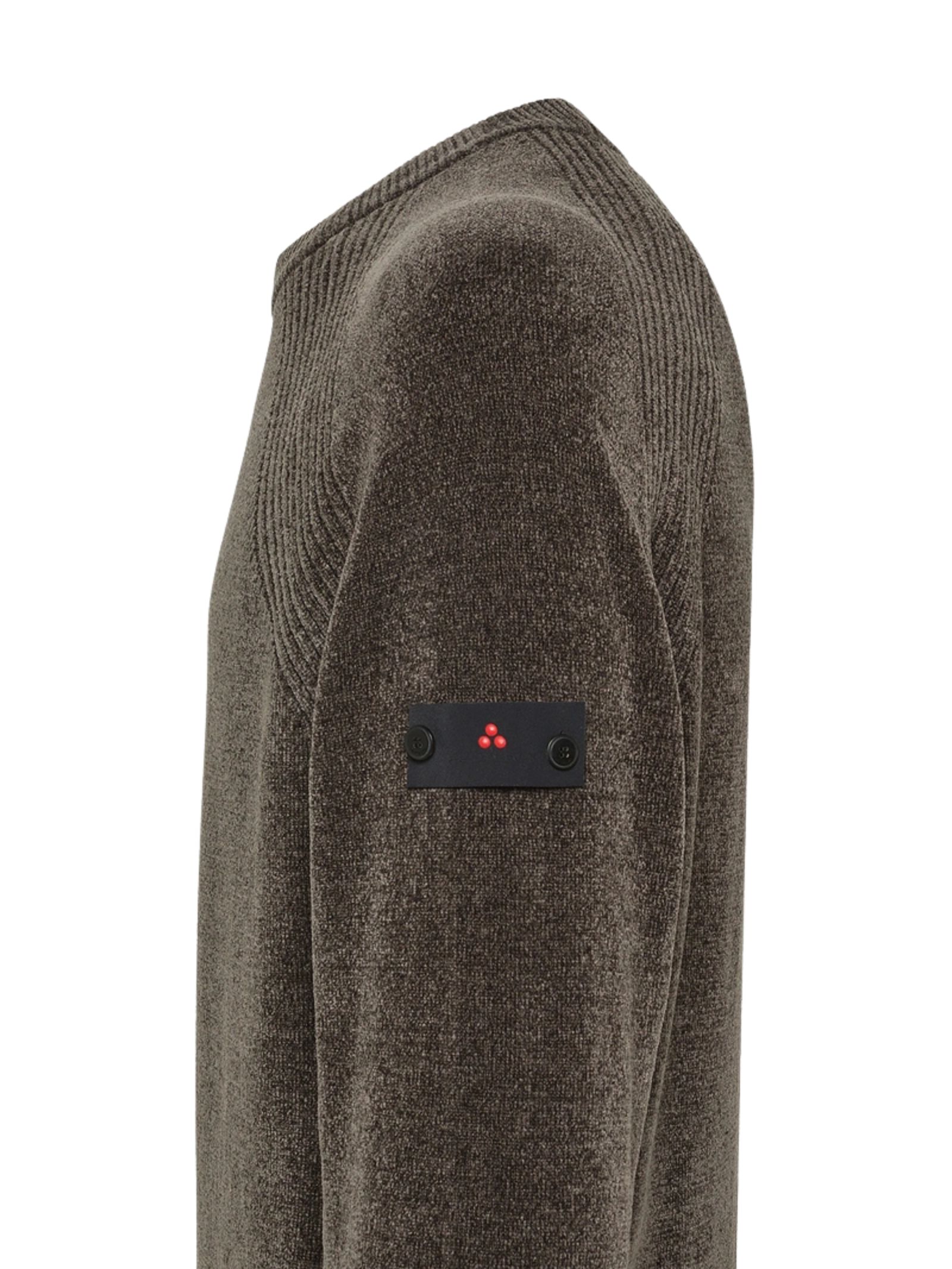 Maglia girocollo marrone in ciniglia rasata dal tatto vellutato e avvolgente, con bordi a costine su collo, polsini e fondo; personalizzazione discreta con logo Trilogy applicato sulla manica sinistra tramite bottoncini, un capo classico e contemporaneo per un look casual ed elegante, in 82% poliestere, 15% poliamide, 3% fibra elastica.