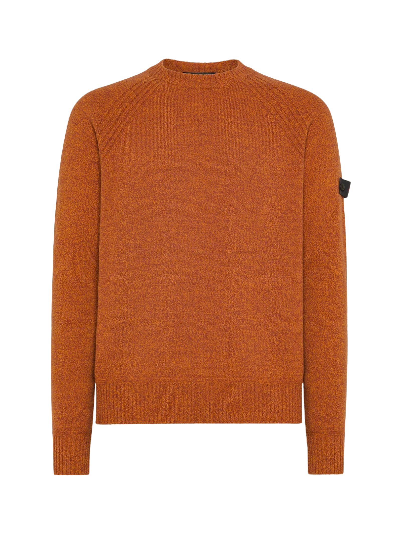Maglione girocollo arancione in misto lana moulinè con effetto melangiato, collo, polsini e fondo a coste e logo Peuterey Trilogy applicato con bottoncini sulla manica sinistra. Capo versatile e confortevole, ideale per look casual o più ricercati. 80% Lana 20% Poliamide