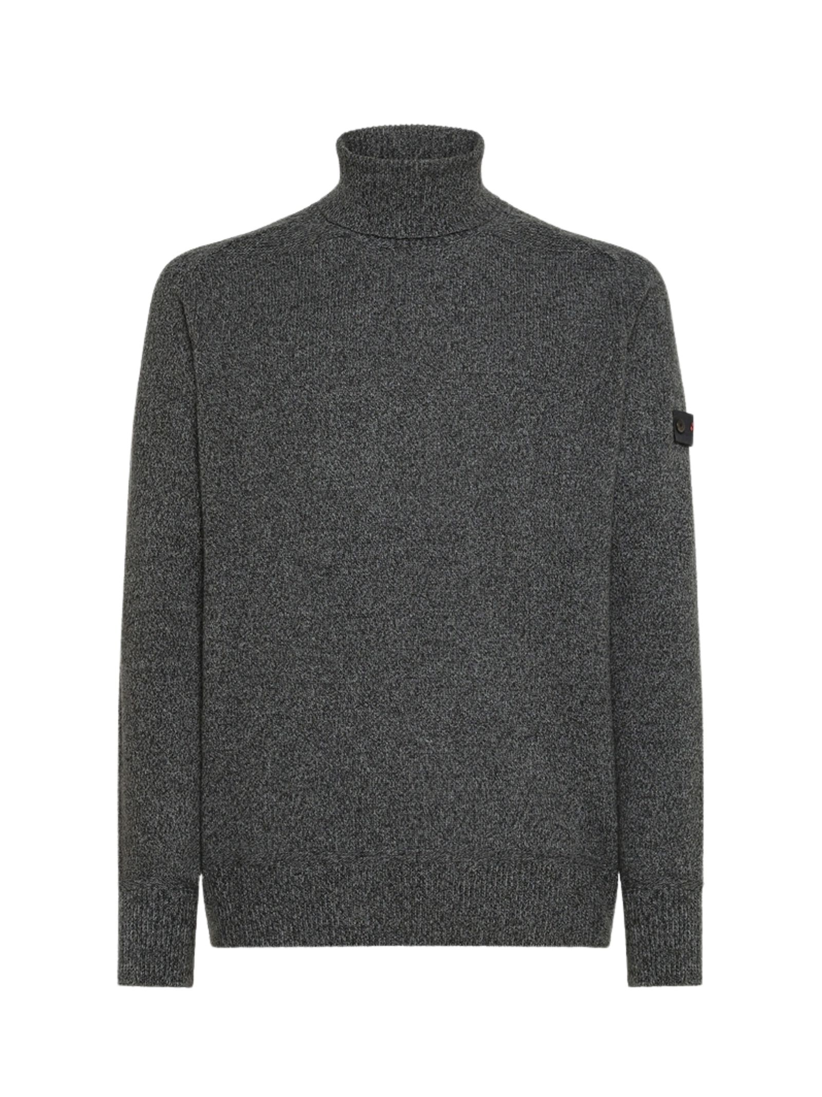 Maglione grigio scuro a collo alto in tricot misto lana mouliné con effetto melangiato, polsini, fondo e collo a coste, e logo Peuterey Trilogy con bottoncini sulla manica sinistra. Caldo, versatile e dal design senza tempo. Composizione: 80% lana, 20% poliammide.