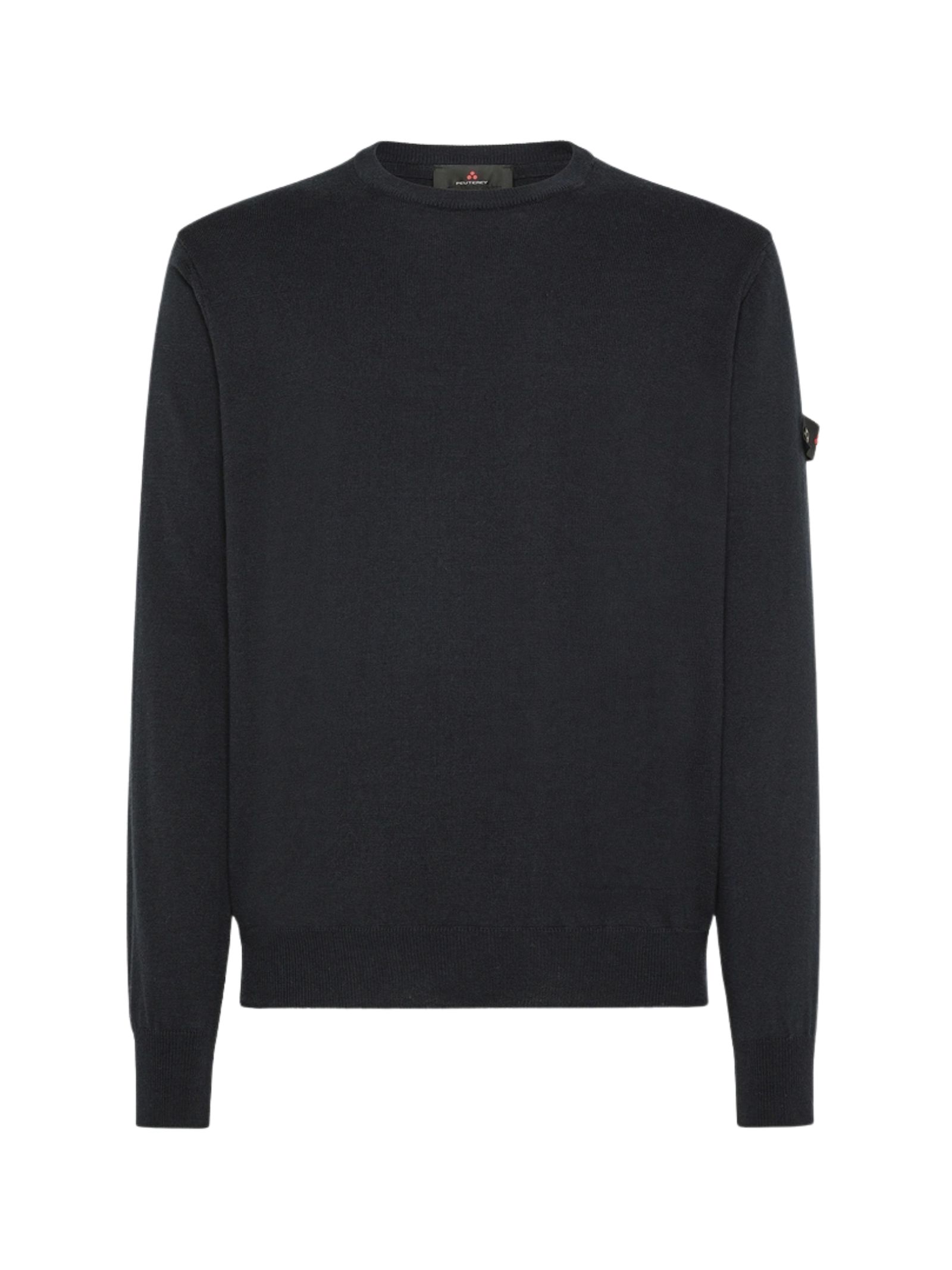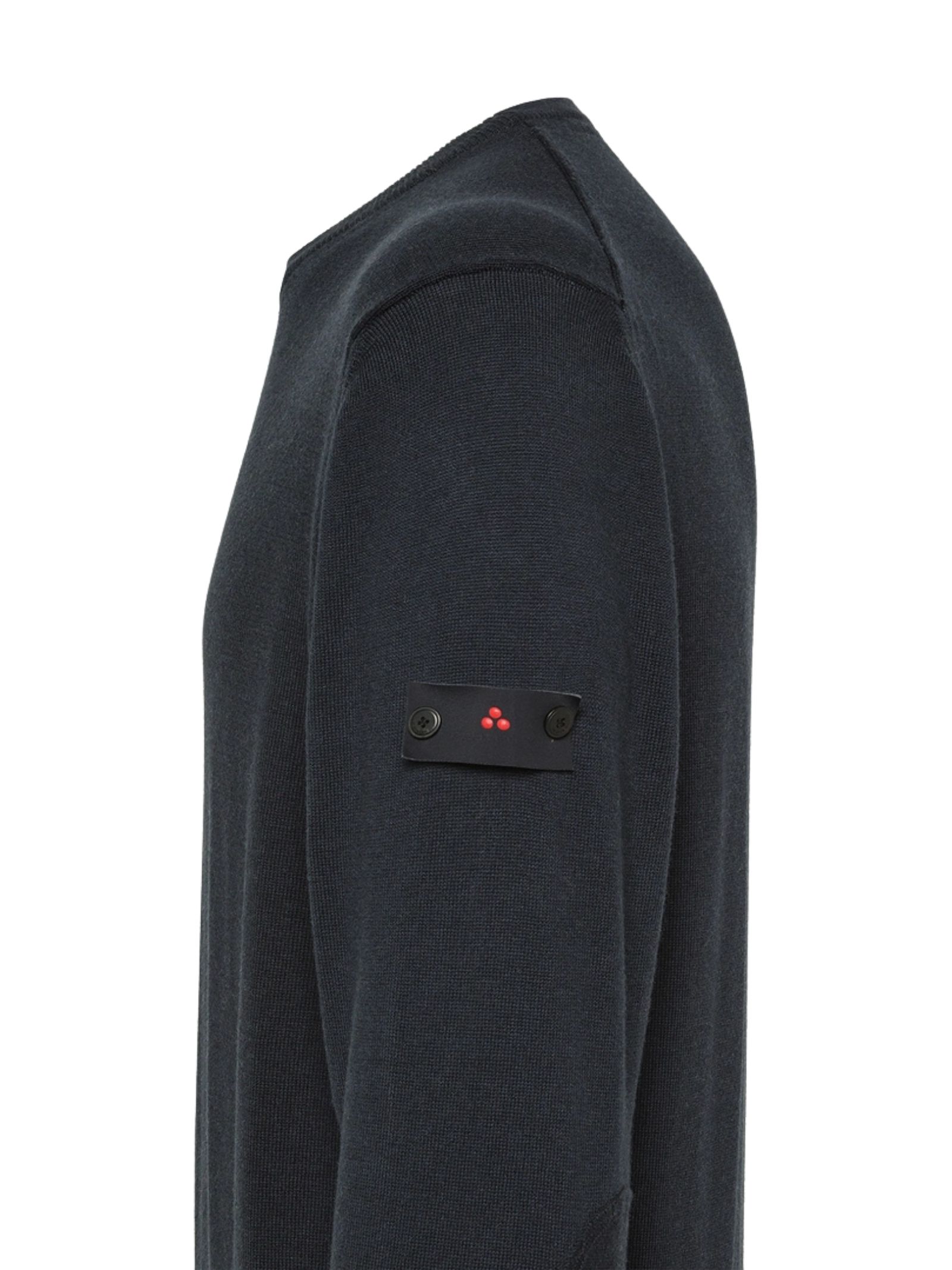 Maglione blu girocollo in tricot misto lana e cotone, dalla texture morbida e compatta. Il design essenziale è arricchito da collo, polsini e fondo a coste, mentre sul braccio sinistro è applicato il logo Peuterey Trilogy con due bottoncini. Un modello tinta unita versatile, ideale sia per look casual che più curati.