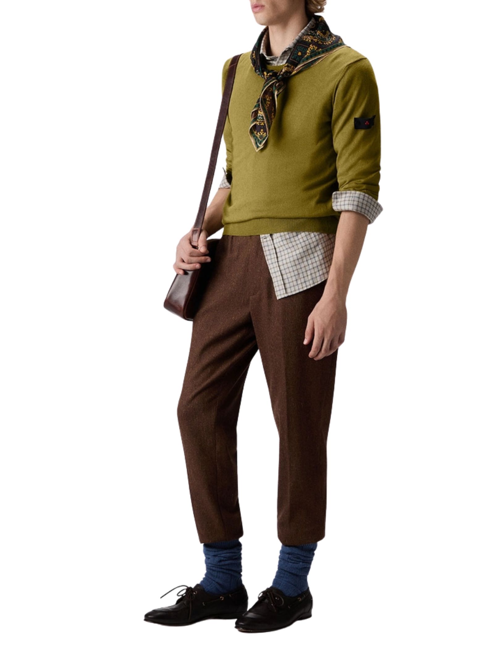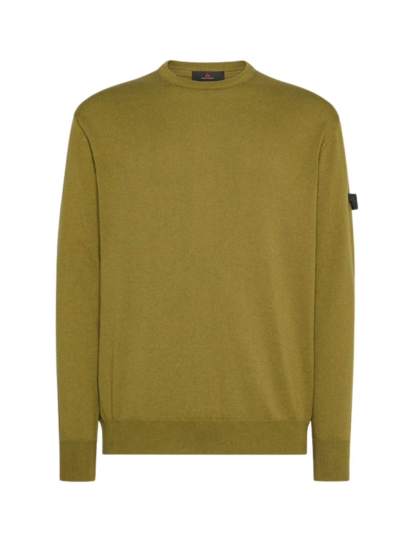 Maglione verde girocollo in tricot misto lana e cotone, dalla texture morbida e compatta. Il design essenziale è arricchito da collo, polsini e fondo a coste, mentre sul braccio sinistro è applicato il logo Peuterey Trilogy con due bottoncini. Un modello tinta unita versatile, ideale sia per look casual che più curati.