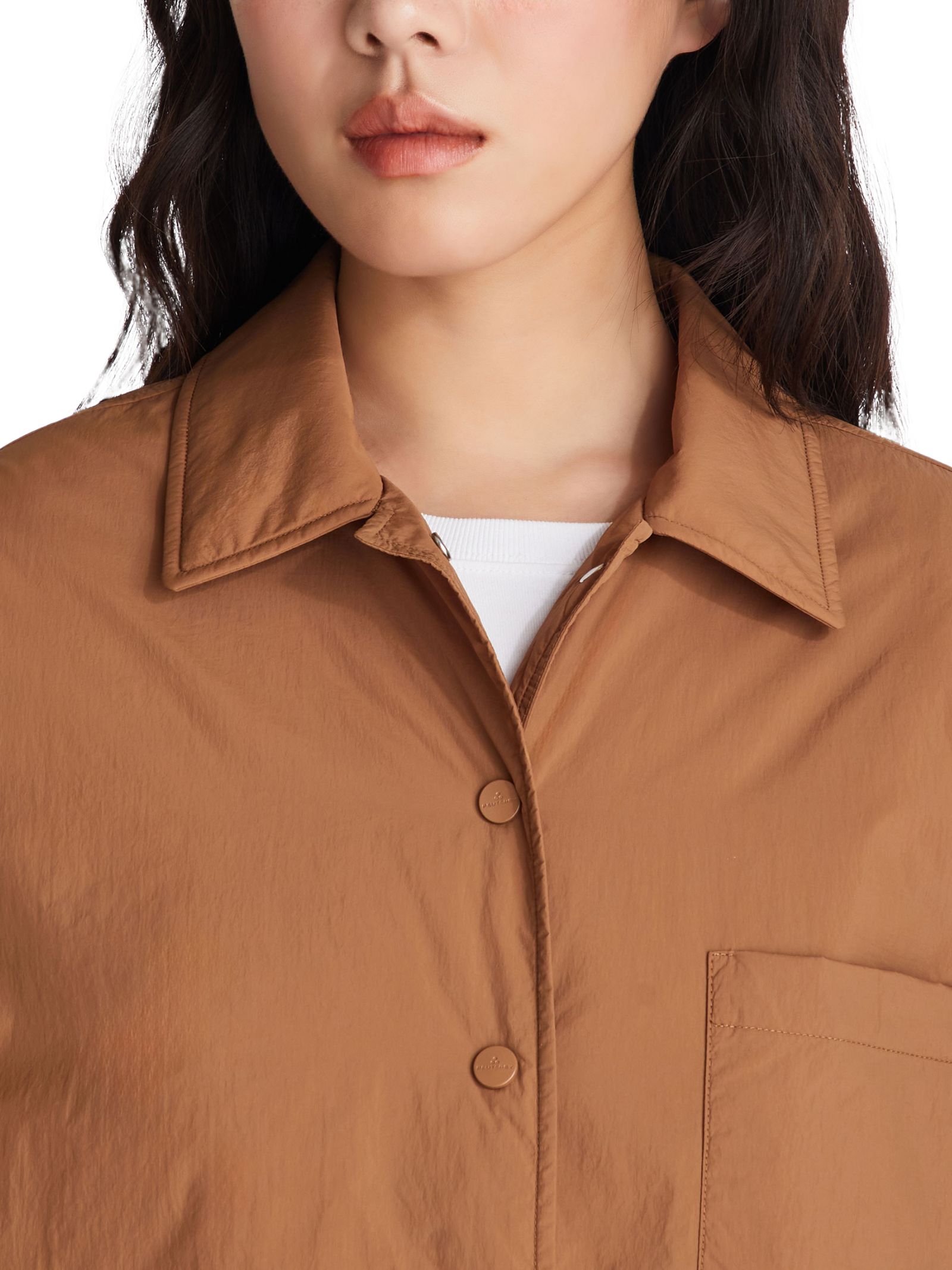 Overshirt in tela di nylon superleggera, dalla texture fluida e tecnica, leggermente imbottita con materiale sintetico. Il design essenziale presenta colletto classico, taschino sul petto, polsini e chiusura frontale con bottoni a pressione. Dal fit regolare, è un capo pratico e versatile, idrorepellente e ideale per completare look contemporanei con uno stile discreto ed elegante.