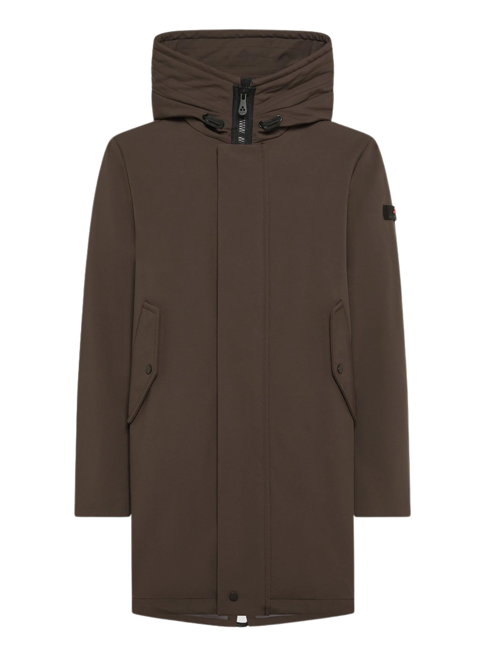 Ampio parka Peuterey in tessuto a tre strati con membrana performante e leggera e, all'interno, una tela di nylon stretch, accoppiata ad una maglina in jersey indemagliabile. Il tessuto è idrorepellente e garantisce unalta tenuta a pioggia e vento. Chiusura centrale nascosta con zip e bottoni. Tasche laterali con patta e coulisse interna, spacco centrale sul retro a coda di rondine. Il capo garantisce una prestazione termica eccezionale.