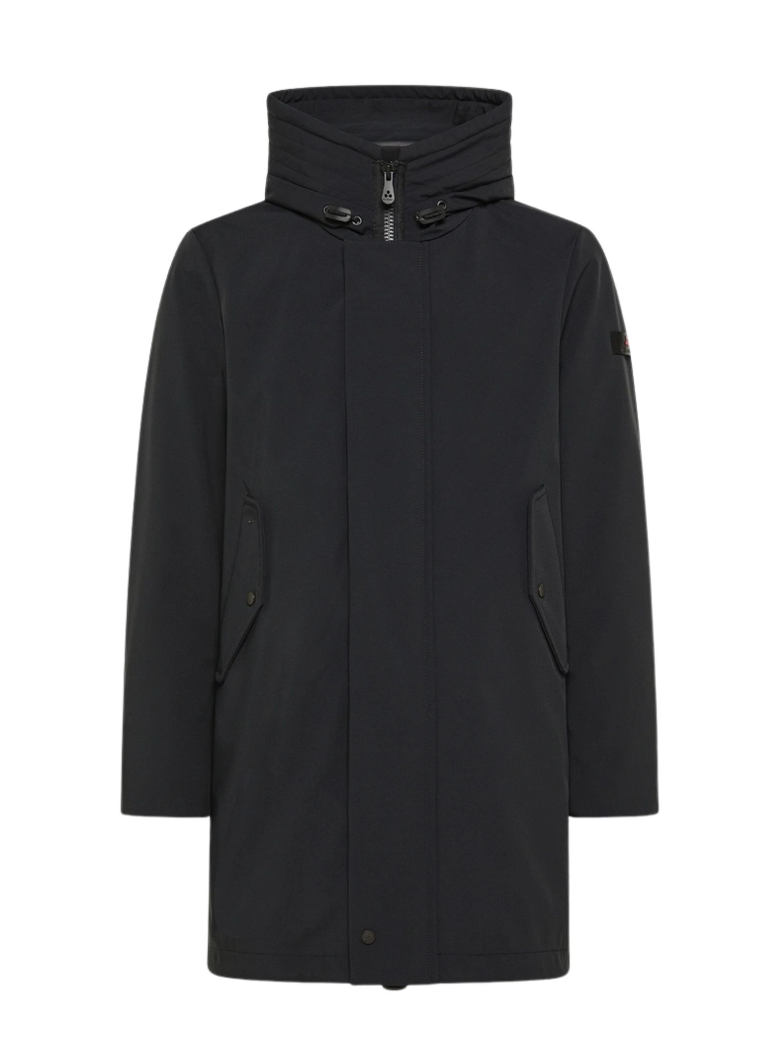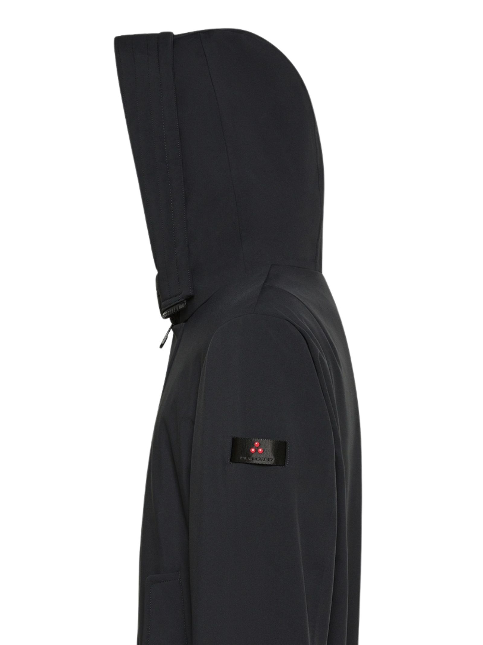 Ampio parka Peuterey in tessuto a tre strati con membrana performante e leggera e, all'interno, una tela di nylon stretch, accoppiata ad una maglina in jersey indemagliabile. Il tessuto è idrorepellente e garantisce unalta tenuta a pioggia e vento. Chiusura centrale nascosta con zip e bottoni. Tasche laterali con patta e coulisse interna, spacco centrale sul retro a coda di rondine. Il capo garantisce una prestazione termica eccezionale.