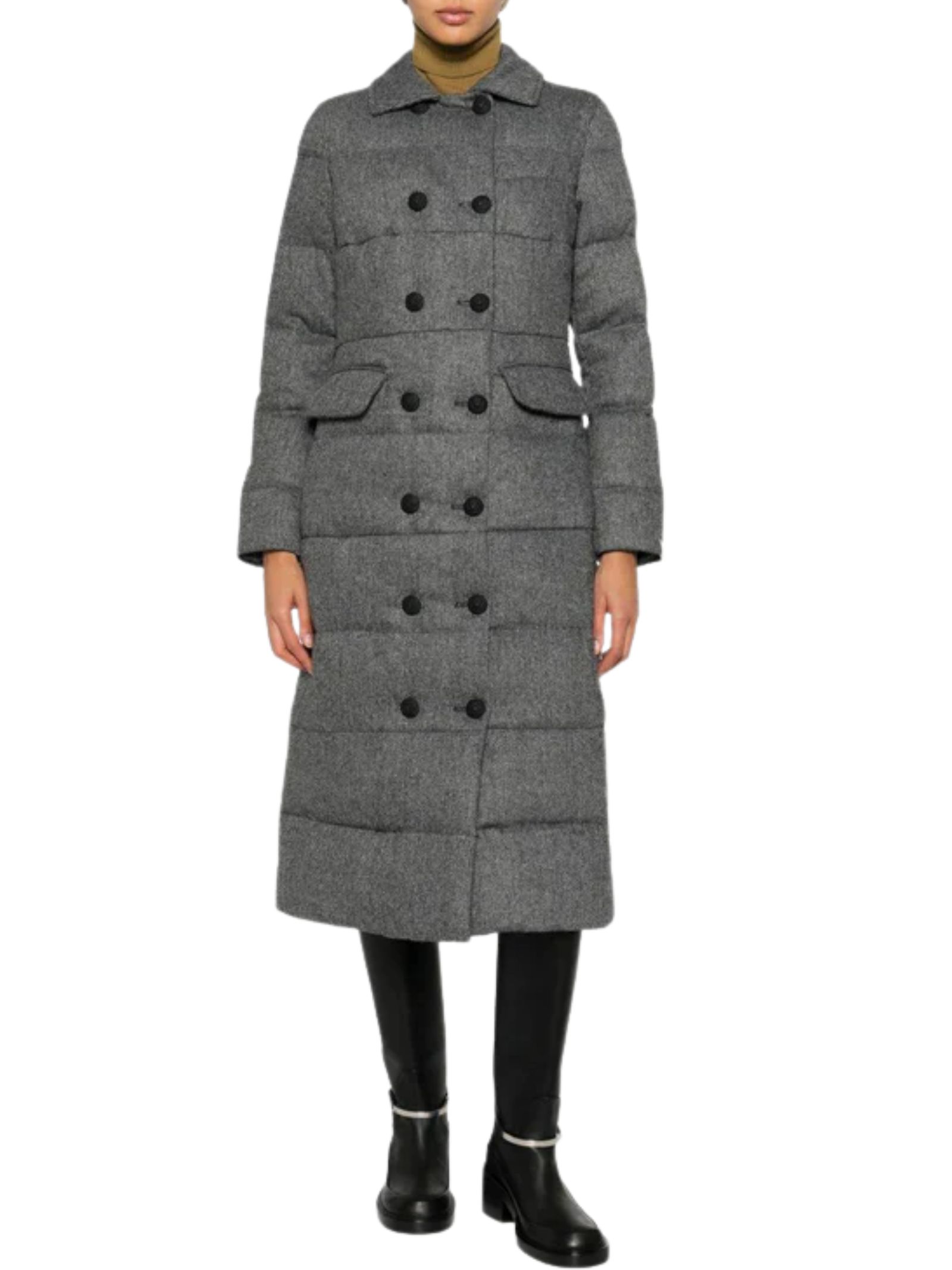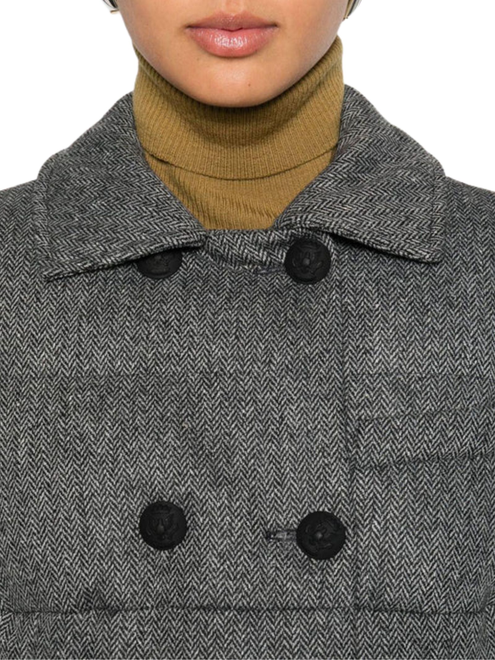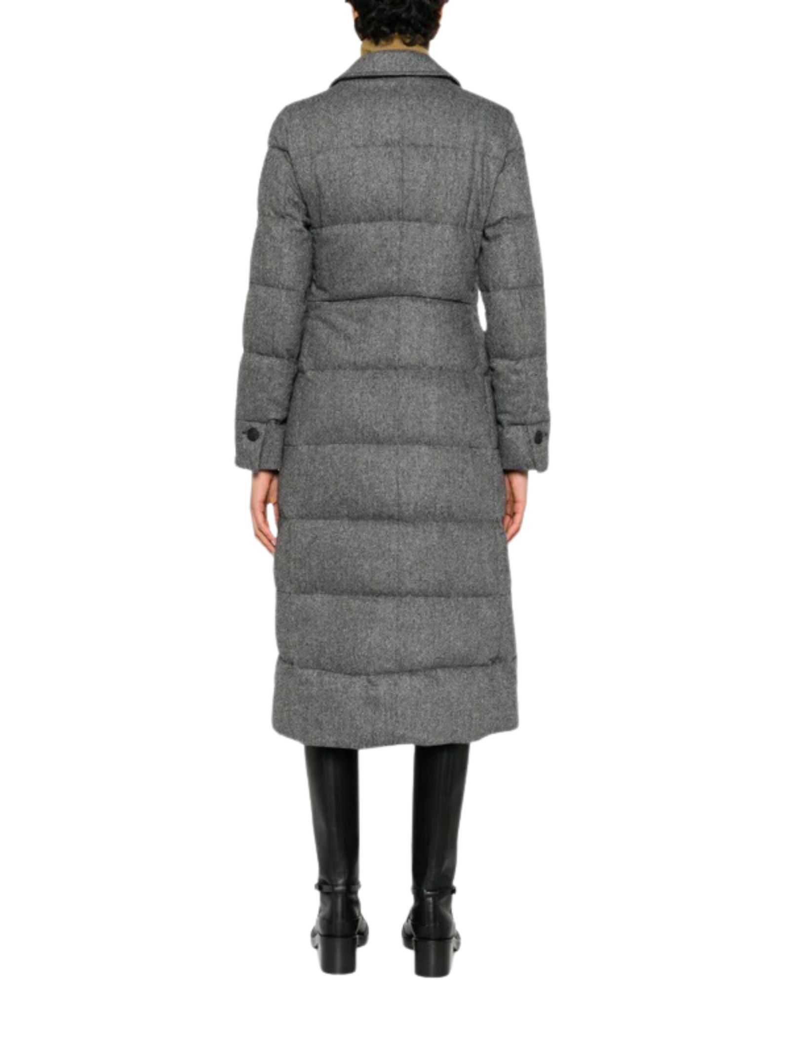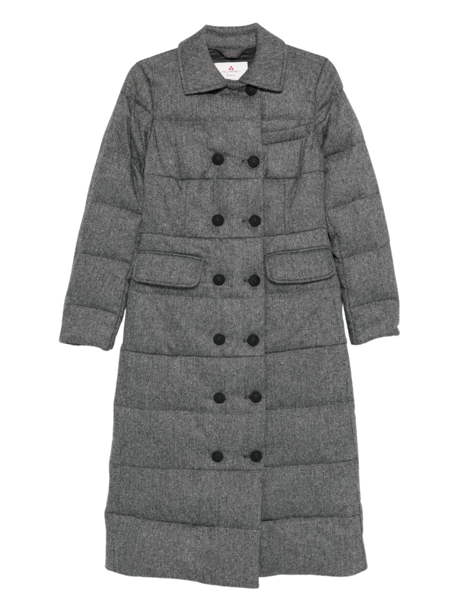 Cappotto grigio imbottito Peuterey Broadford in misto lana/seta, combina una silhouette sartoriale a doppio petto con una struttura imbottita/isolata per un look invernale caldo ed elegante. Composizione e cura: 33% Lana 29% Acrilico 28% Poliestere 6% Seta 2% Poliammide 2% Elastan