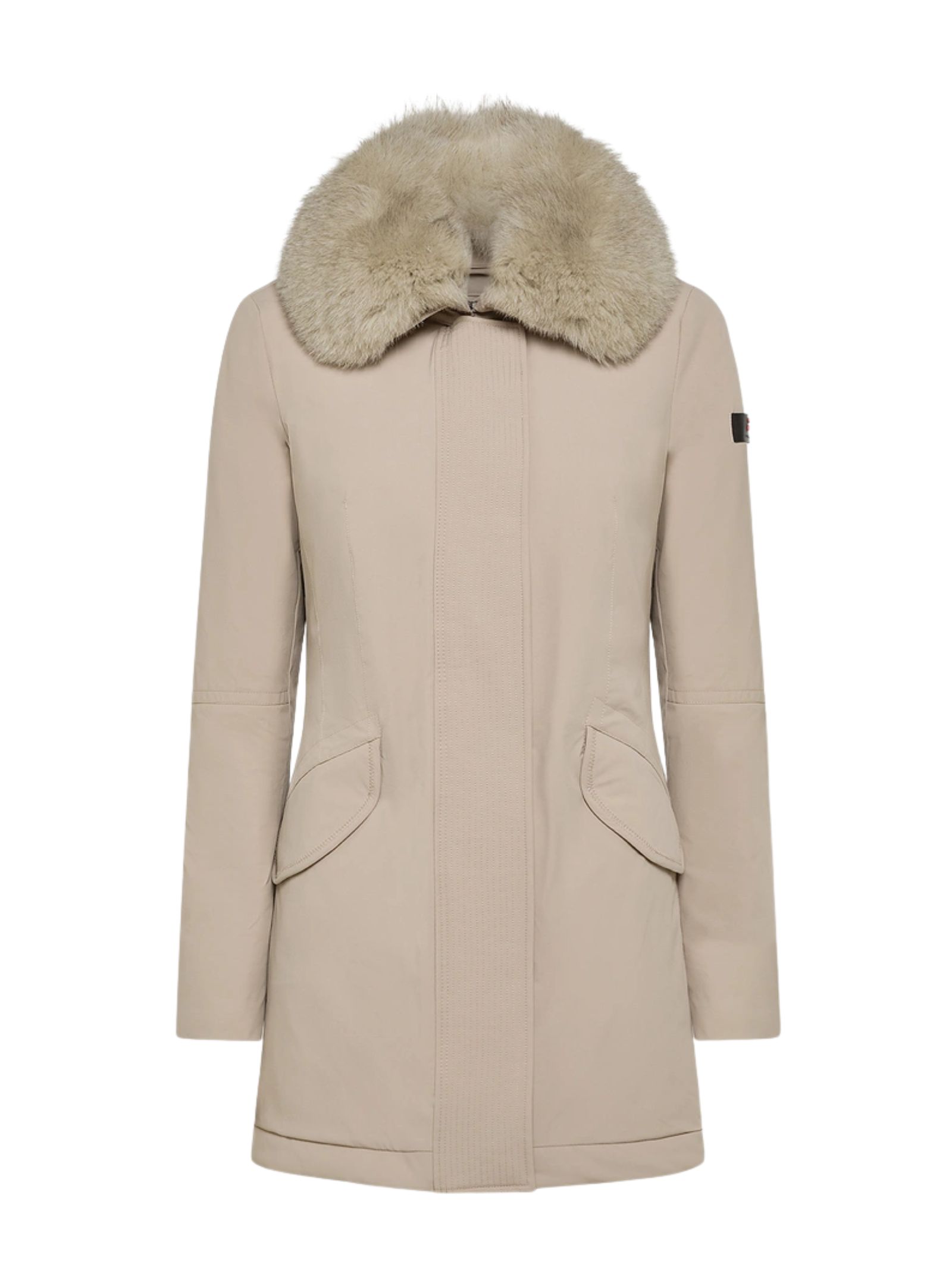 Piumino Peuterey liscio in piuma riciclata e tela di nylon stretch resistente a pioggia e vento. Il modello è impreziosito da un ampio collo in pelliccia di volpe staccabile fit asciutto (slim-fit) che valorizza la silhouette femminile. Collo a camicia, chiusura nascosta con zip a doppio cursore e bottoni.
