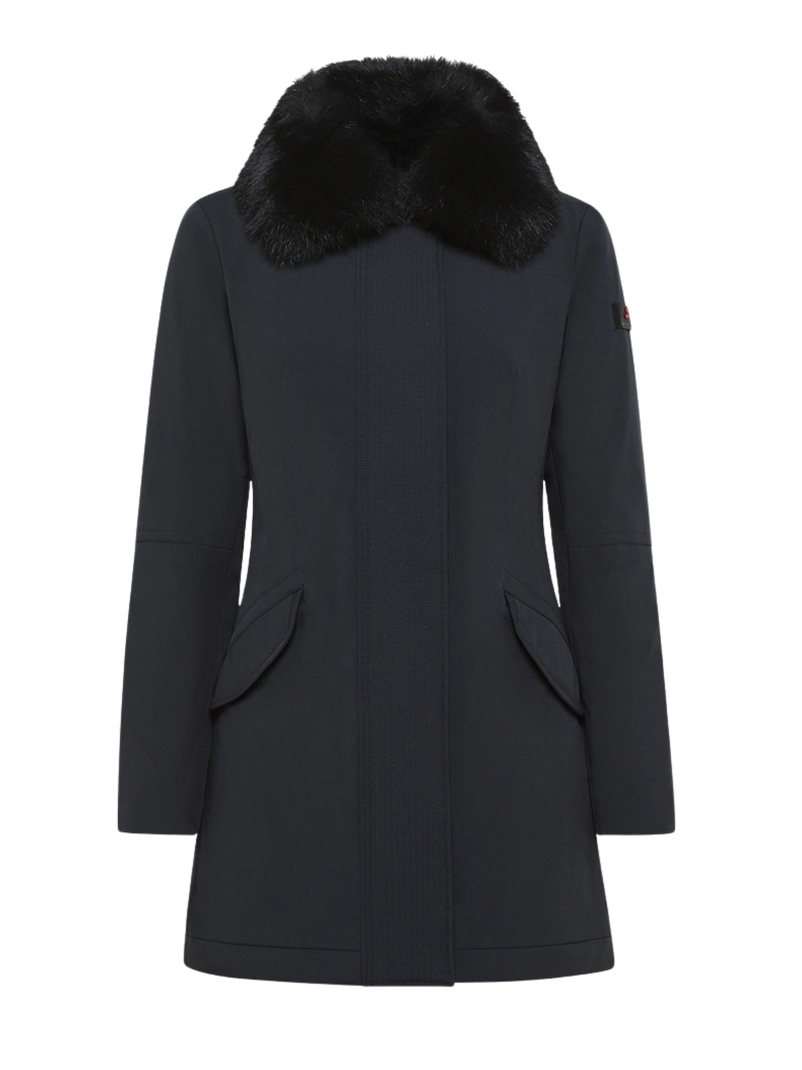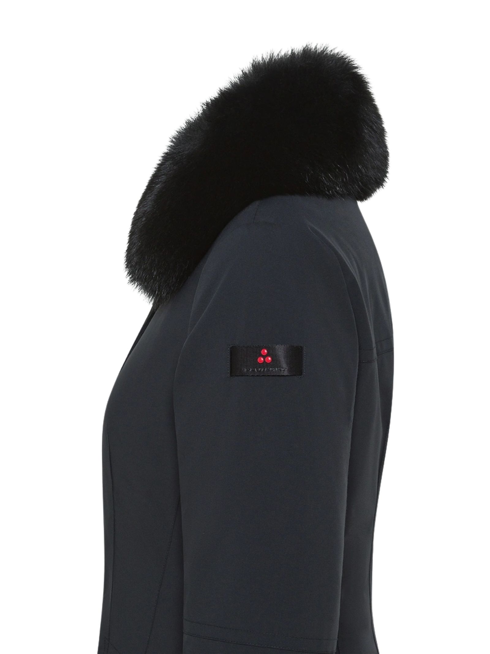 Piumino Peuterey liscio in piuma riciclata e tela di nylon stretch resistente a pioggia e vento. Il modello è impreziosito da un ampio collo in pelliccia di volpe staccabile fit asciutto (slim-fit) che valorizza la silhouette femminile. Collo a camicia, chiusura nascosta con zip a doppio cursore e bottoni.