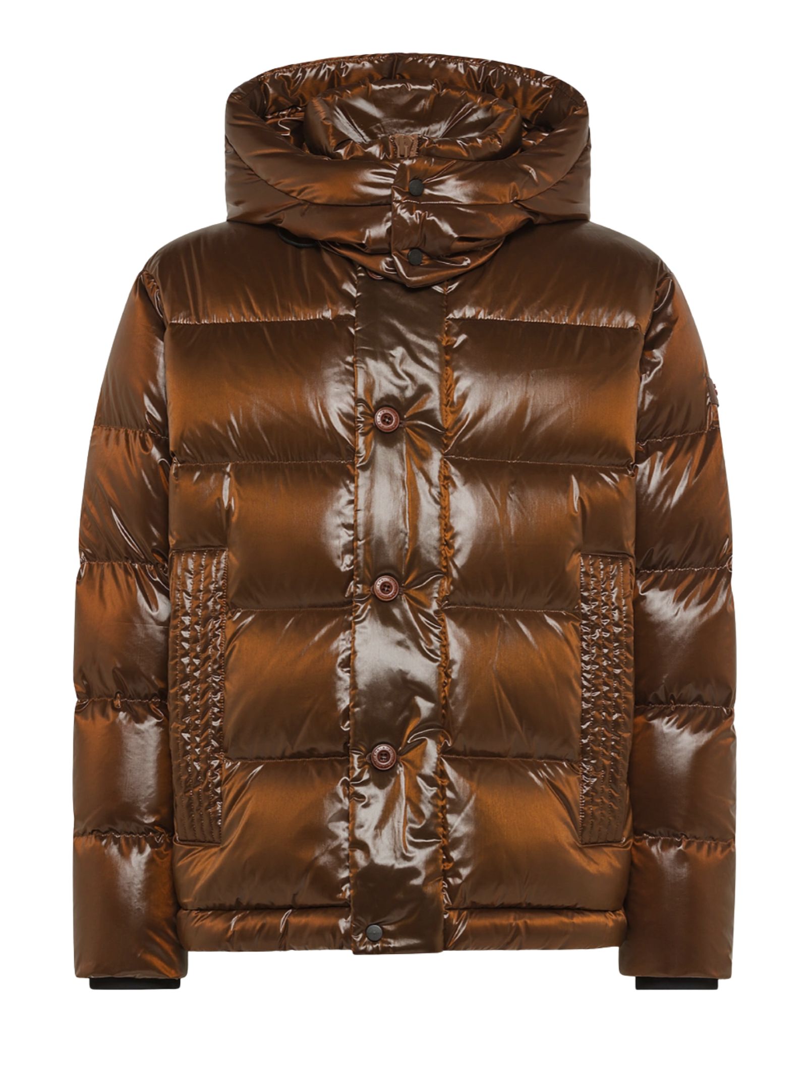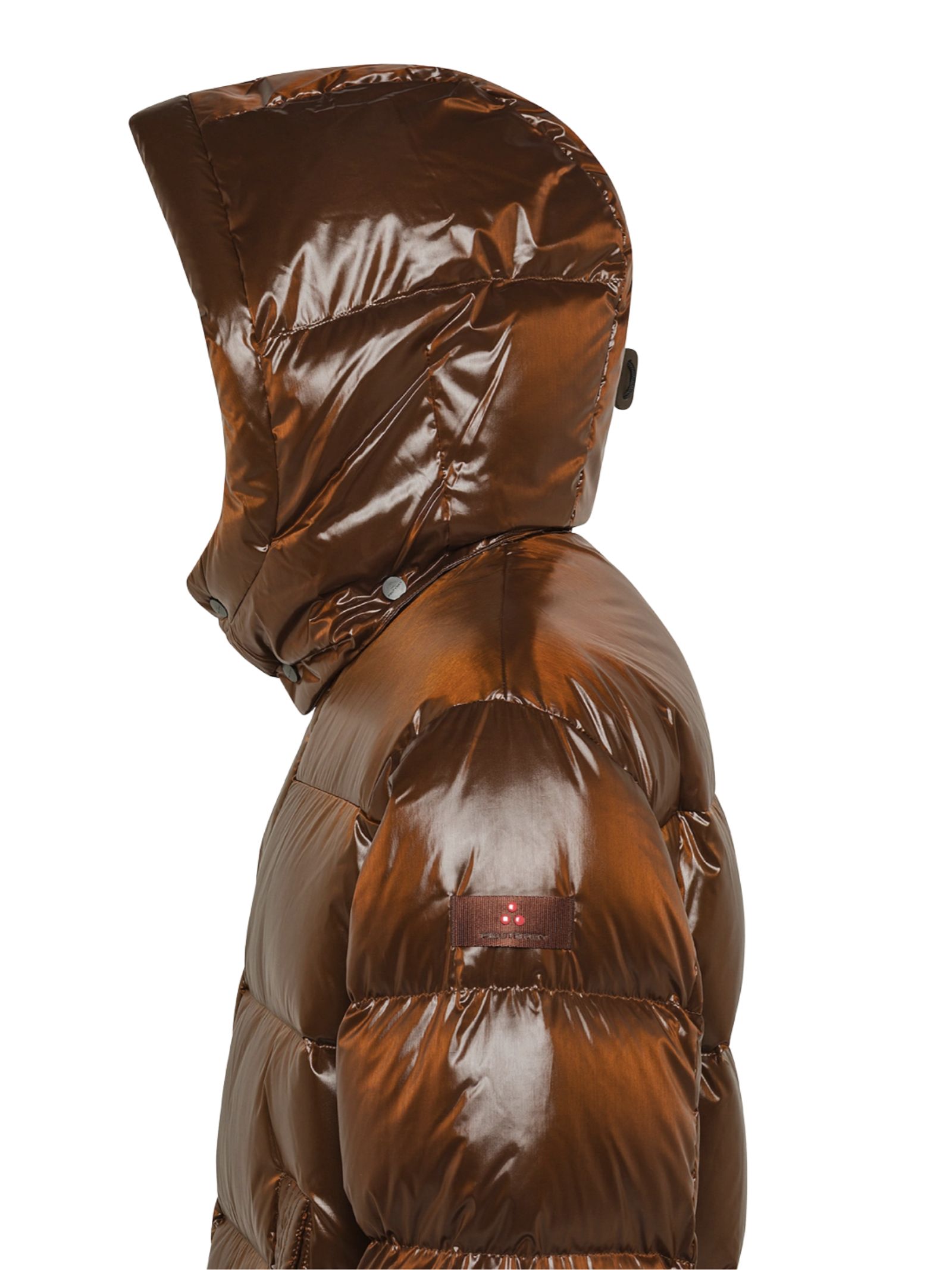 Piumino Peuterey in tela di nylon con una speciale tintura a bassa energia e un finissaggio cinzato che donano al tessuto un look lucido e cangiante, al tatto morbido e confortevole. Limbottitura in piuma naturale garantisce calore e leggerezza. Il design include zip centrale coperta da patta con bottoni, tasche a filetto e ampio cappuccio fisso con bottoni. Collo in piedi per una protezione ottimale.