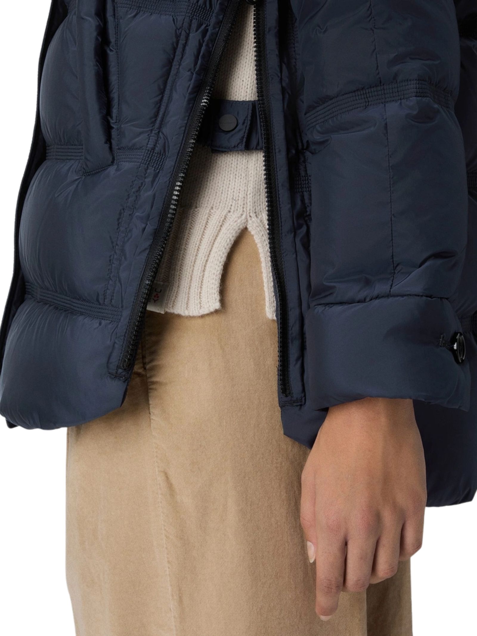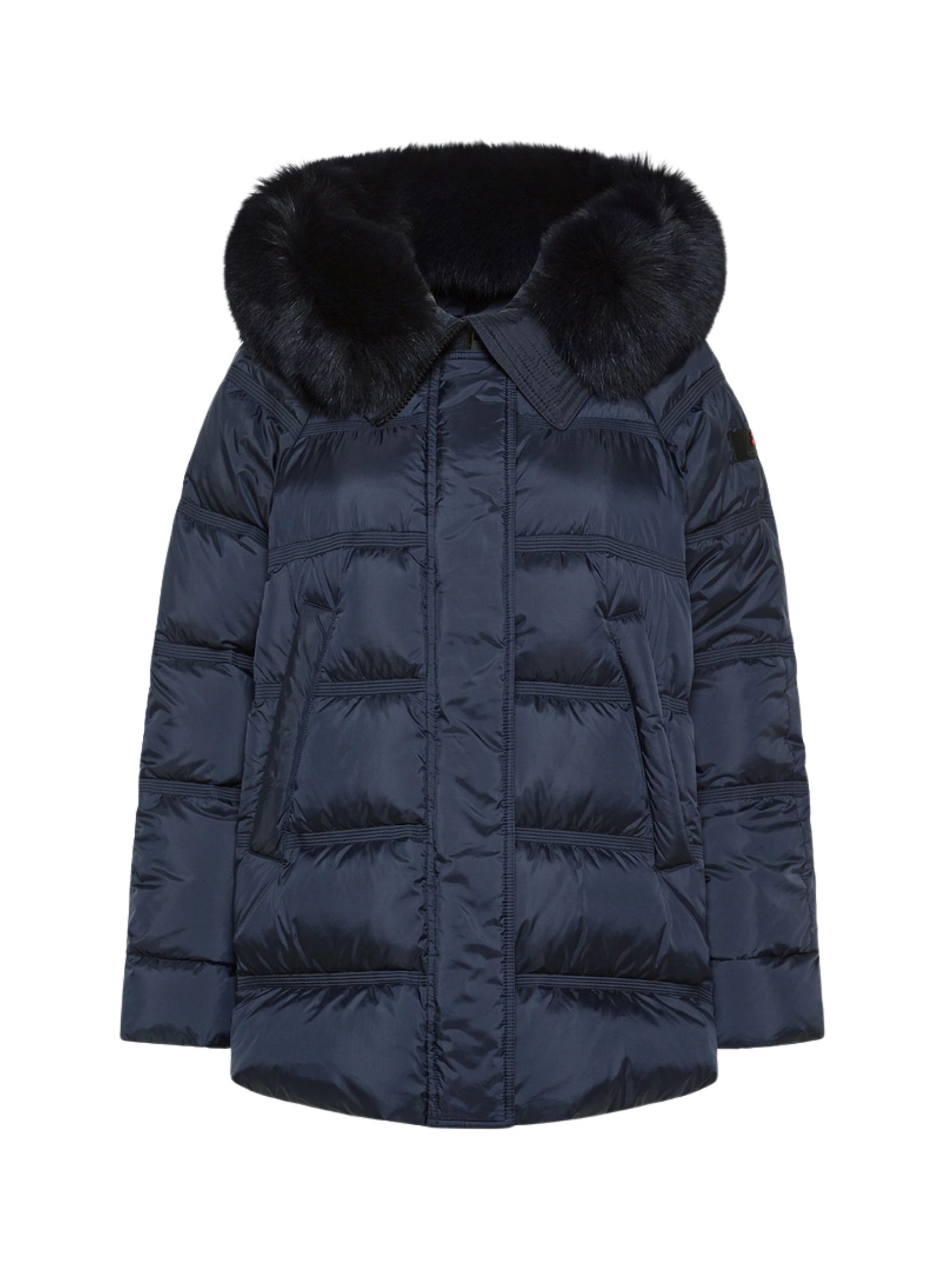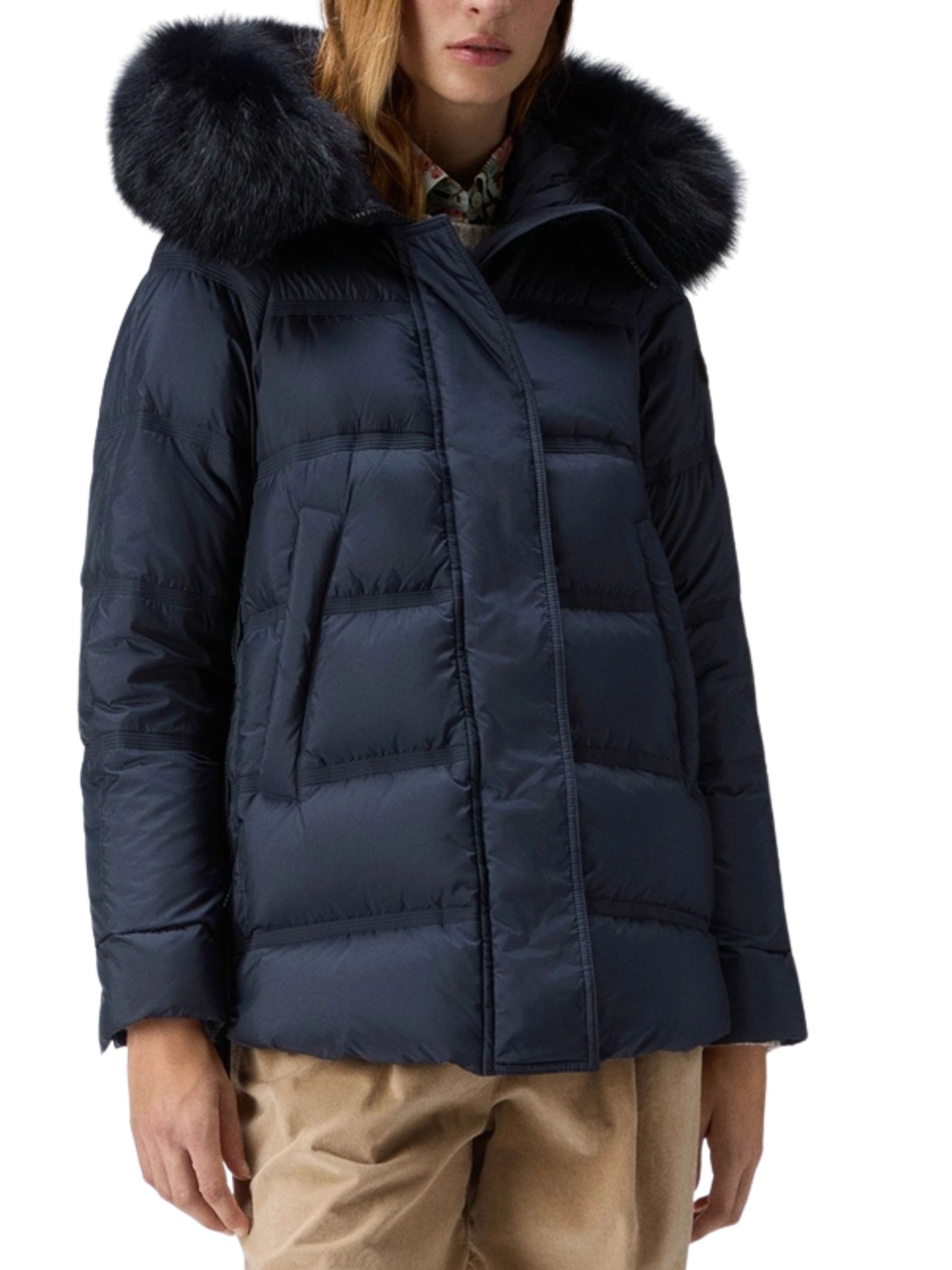 Piumino ad ampie trapunte, dalla mano morbida e dalla struttura super compatta. Limbottitura in piuma doca assicura calore elevato e leggerezza. Regolabile grazie allapertura delle zip laterali, mentre il cappuccio fisso è arricchito da un bordo in pelliccia di volpe staccabile in tono colore. Modello con tasche a filetto, chiusura con patta e bottoni che nasconde una zip a doppio cursore.