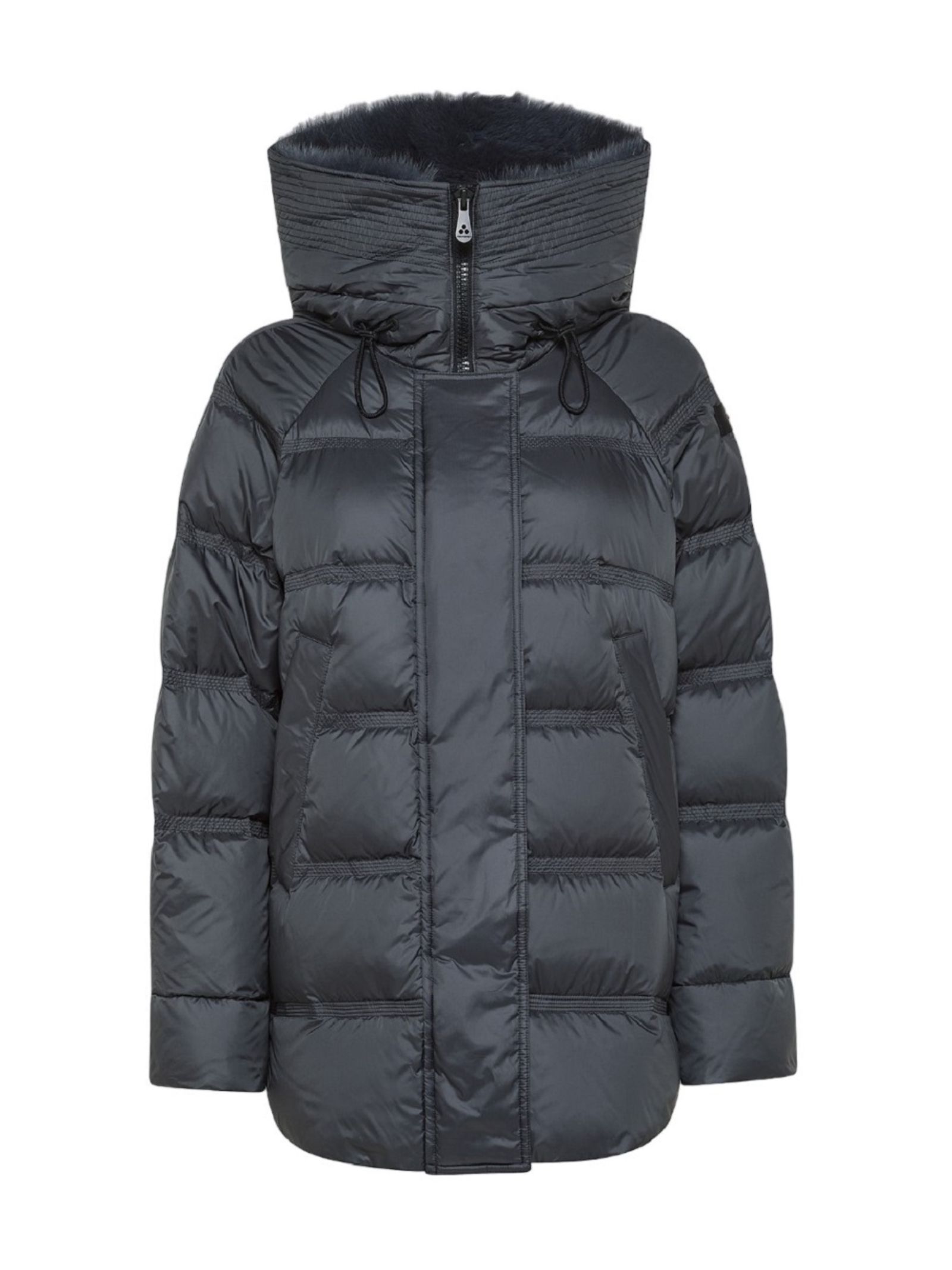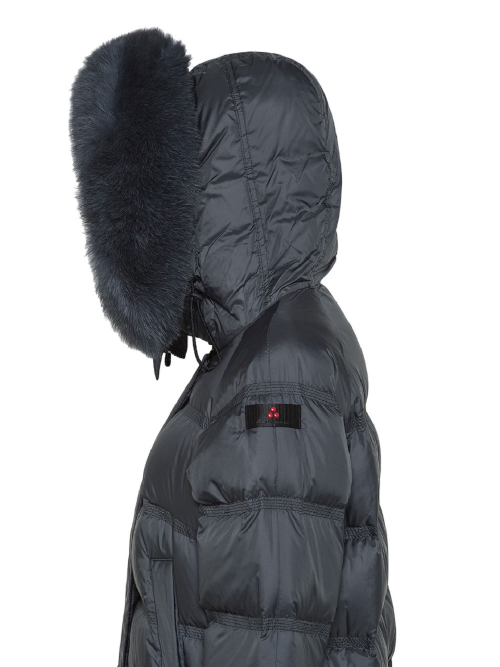 Piumino ad ampie trapunte, dalla mano morbida e dalla struttura super compatta. Limbottitura in piuma doca assicura calore elevato e leggerezza. Regolabile grazie allapertura delle zip laterali, mentre il cappuccio fisso è arricchito da un bordo in pelliccia di volpe staccabile in tono colore. Modello con tasche a filetto, chiusura con patta e bottoni che nasconde una zip a doppio cursore.