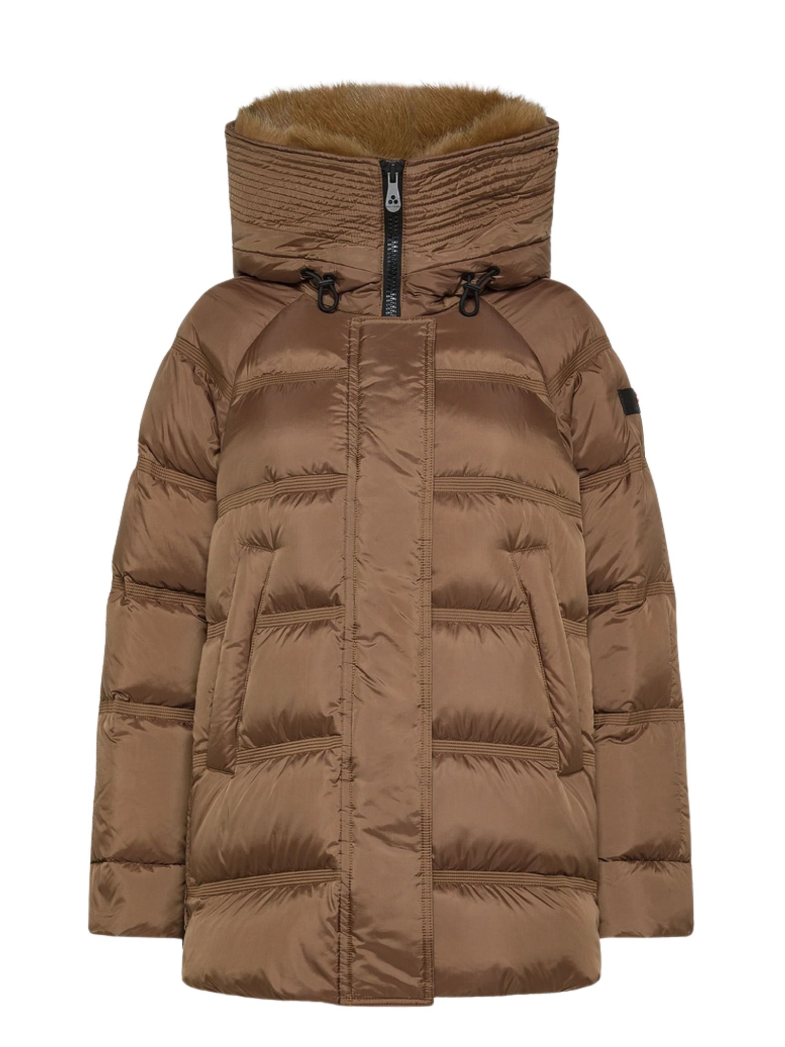 Piumino ad ampie trapunte, dalla mano morbida e dalla struttura super compatta. Limbottitura in piuma doca assicura calore elevato e leggerezza. Regolabile grazie allapertura delle zip laterali, mentre il cappuccio fisso è arricchito da un bordo in pelliccia di volpe staccabile in tono colore. Modello con tasche a filetto, chiusura con patta e bottoni che nasconde una zip a doppio cursore.