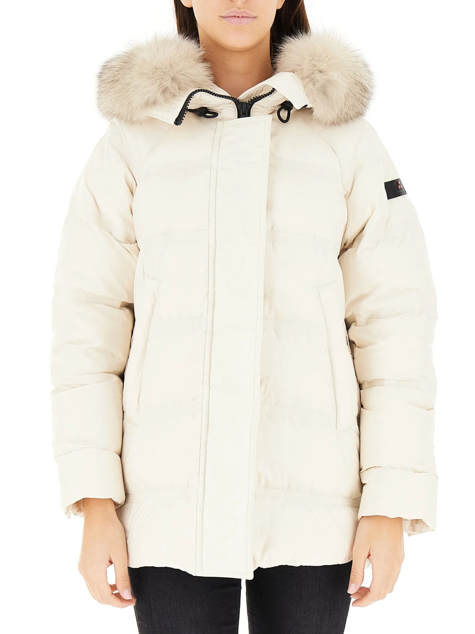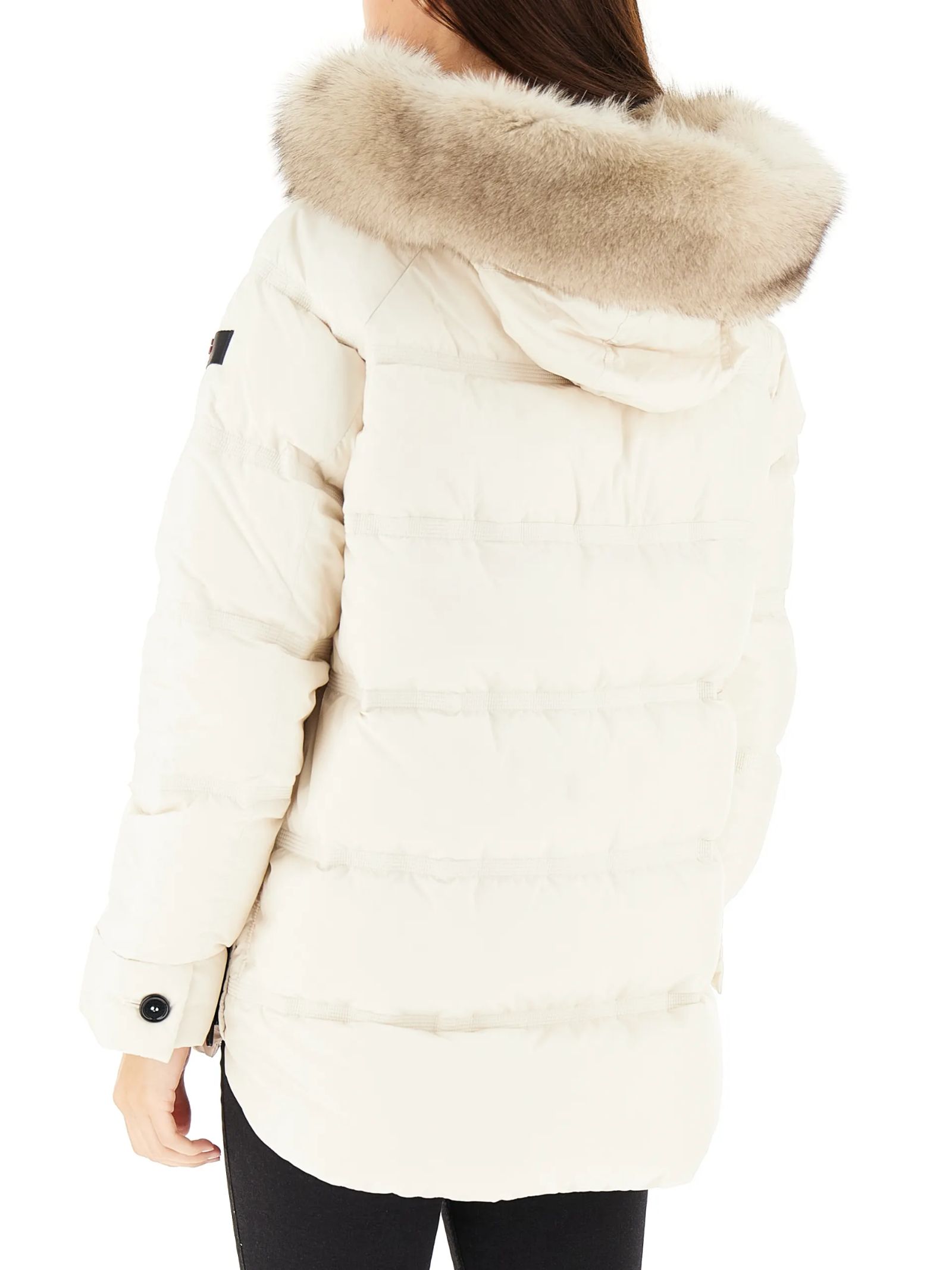 Piumino ad ampie trapunte, dalla mano morbida e dalla struttura super compatta. Limbottitura in piuma doca assicura calore elevato e leggerezza. Regolabile grazie allapertura delle zip laterali, mentre il cappuccio fisso è arricchito da un bordo in pelliccia di volpe staccabile in tono colore. Modello con tasche a filetto, chiusura con patta e bottoni che nasconde una zip a doppio cursore.
