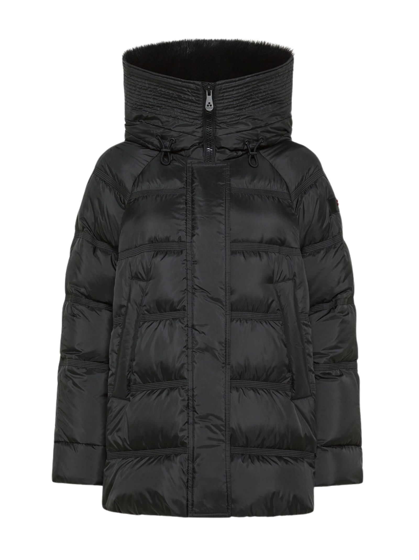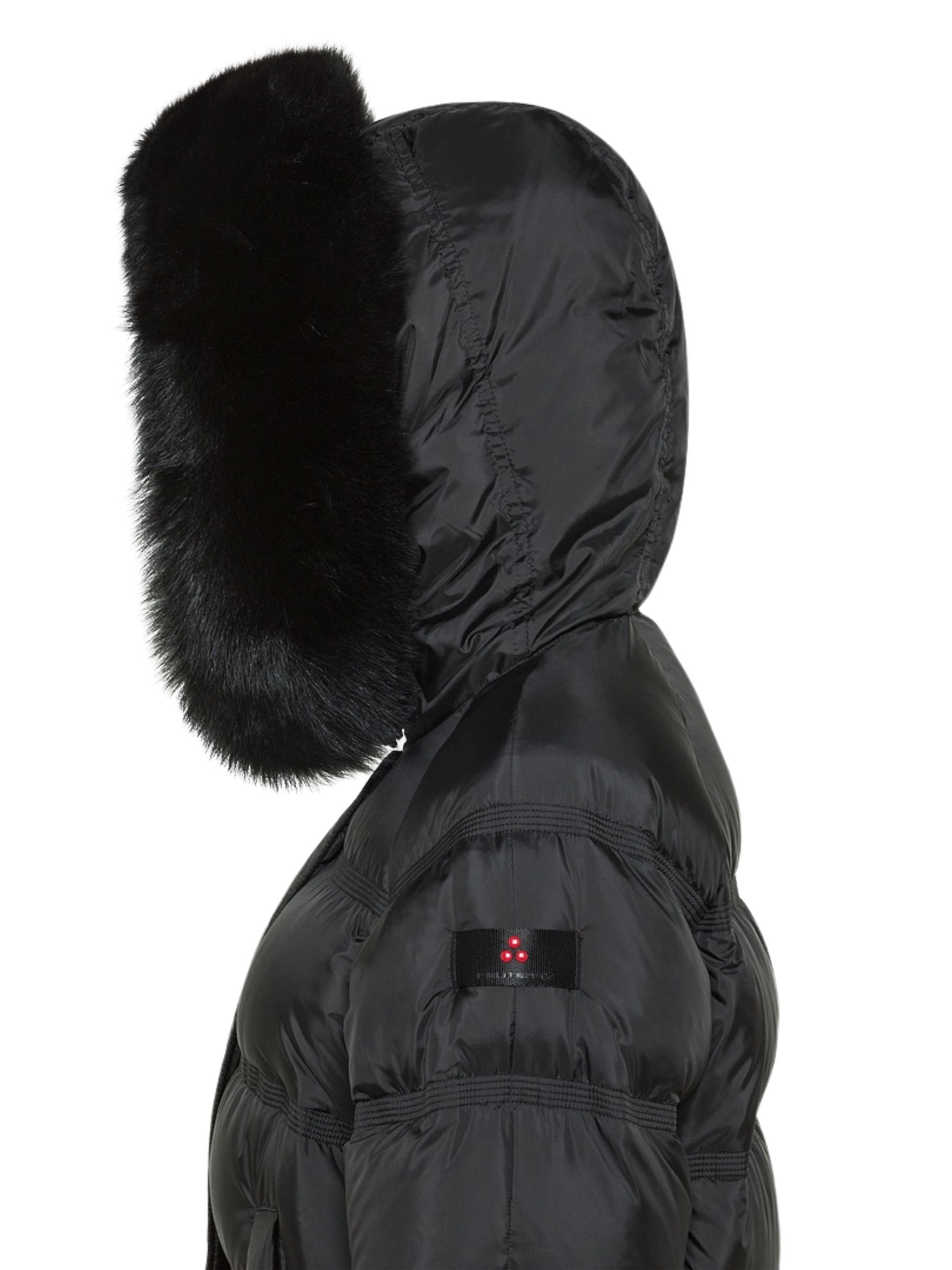 Piumino ad ampie trapunte, dalla mano morbida e dalla struttura super compatta. Limbottitura in piuma doca assicura calore elevato e leggerezza. Regolabile grazie allapertura delle zip laterali, mentre il cappuccio fisso è arricchito da un bordo in pelliccia di volpe staccabile in tono colore. Modello con tasche a filetto, chiusura con patta e bottoni che nasconde una zip a doppio cursore.