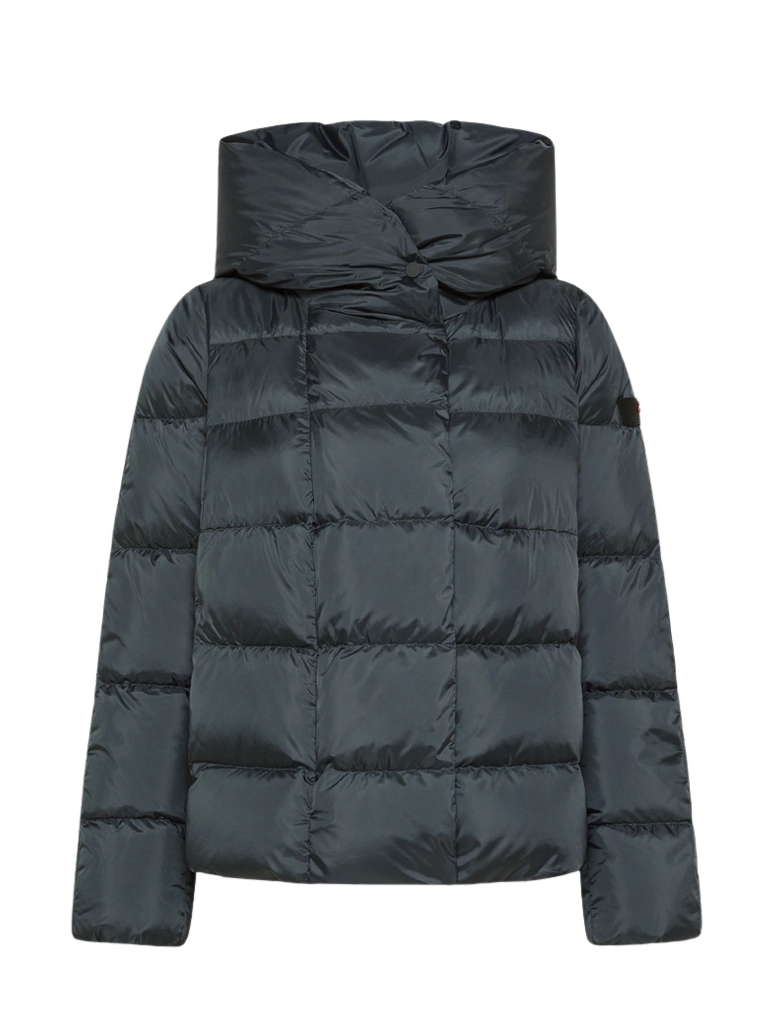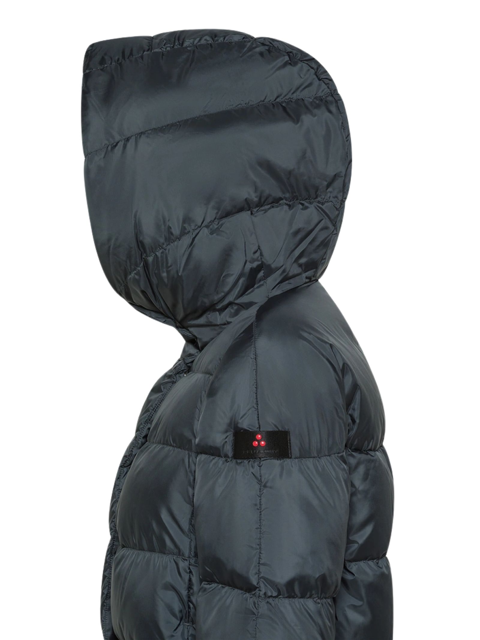 Piumino corto in tessuto superleggero, struttura ultra compatta e finitura semi-opaca. Limbottitura in piuma naturale che garantisce calore e leggerezza, idrorepellente. Full zip centrale e bottoni a pressione nascosti da patta, tasche laterali a scomparsa con bottone singolo a pressione, ampio collo a scialle che avvolge dolcemente proteggendo dalle intemperie e cappuccio fisso.