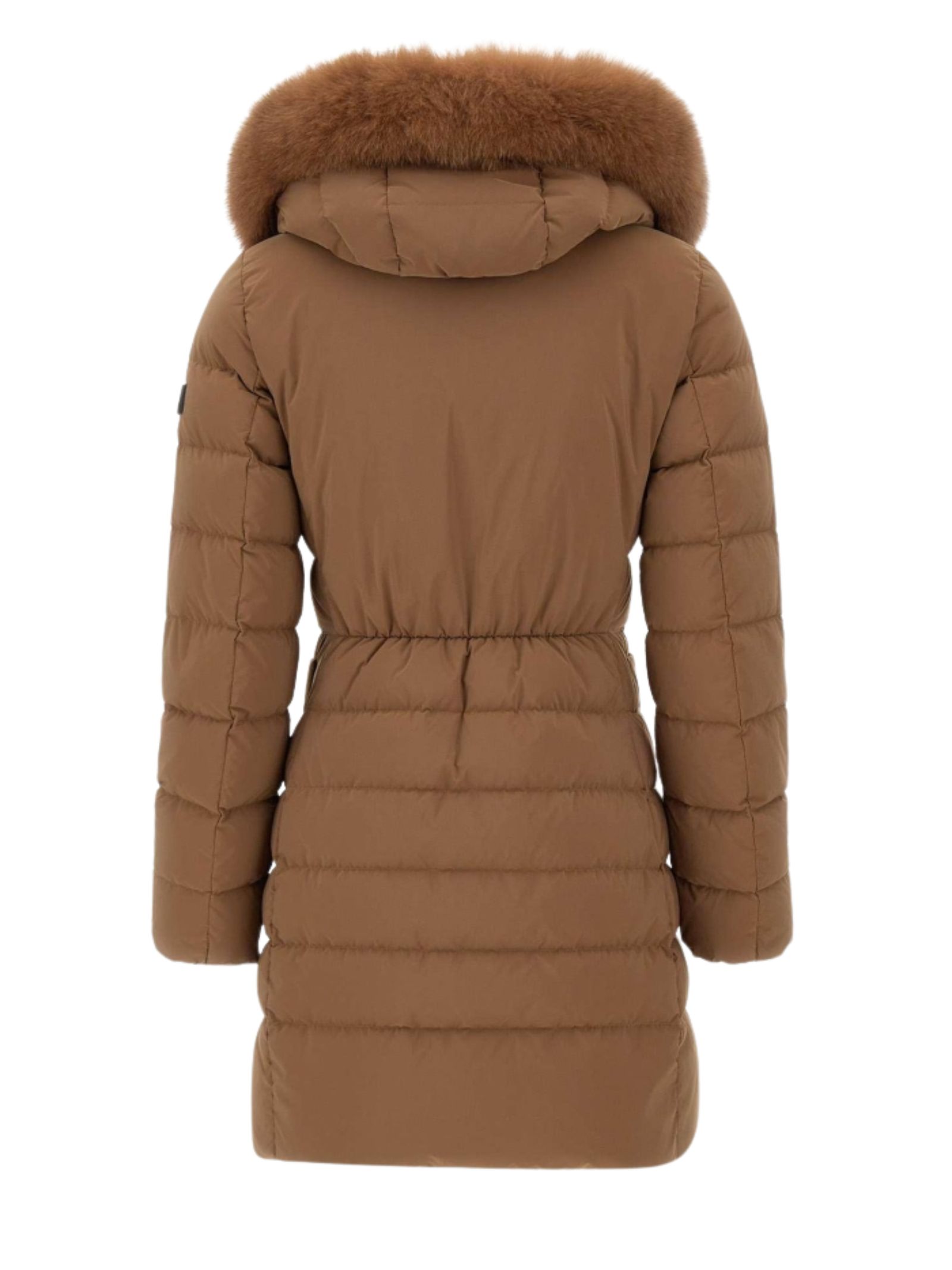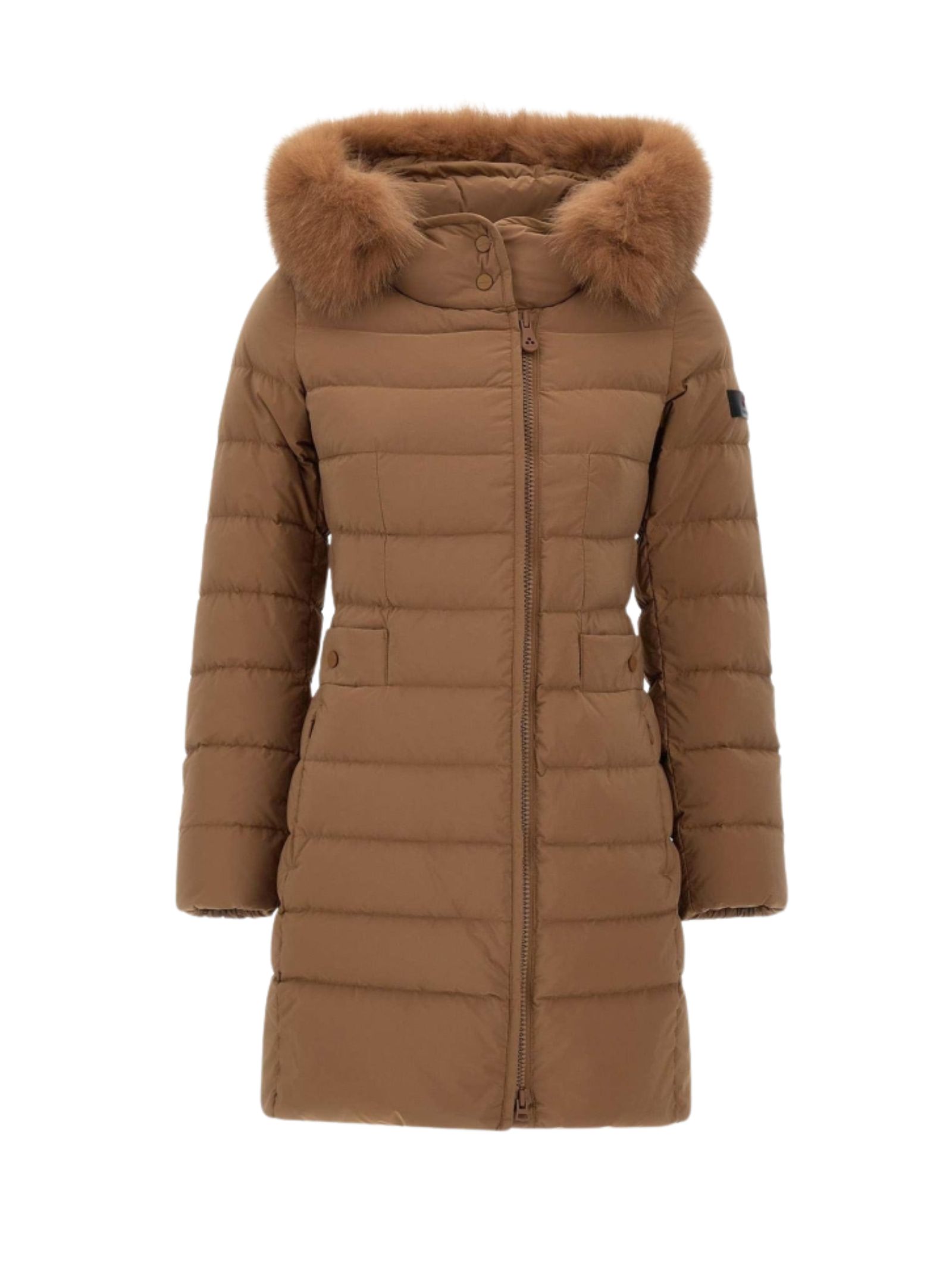 Piumino lungo Peuterey trapuntato in leggero popeline di nylon e microfibra di poliestere, trattato ad alta temperatura per ottenere una mano sostenuta e un tatto polveroso. Limbottitura in piuma naturale assicura protezione termica con leggerezza. Il design è definito da una zip centrale a doppio cursore, collo avvolgente con bottoni a pressione tono su tono e cappuccio con bordo in pelliccia di volpe, removibile.