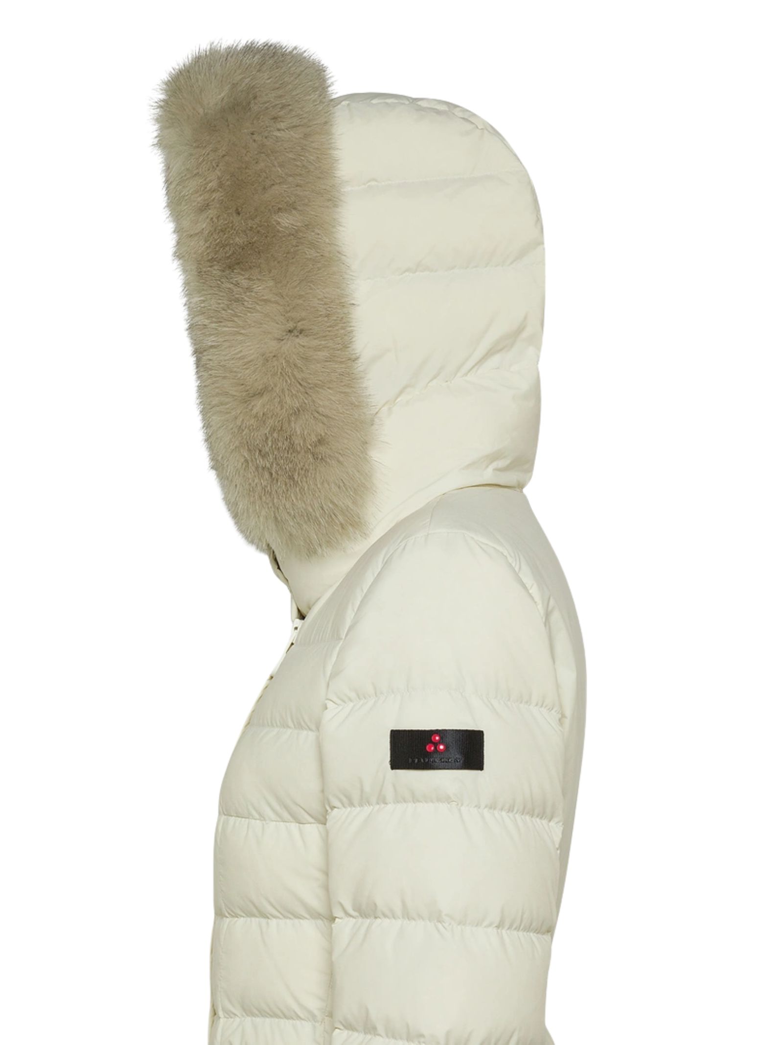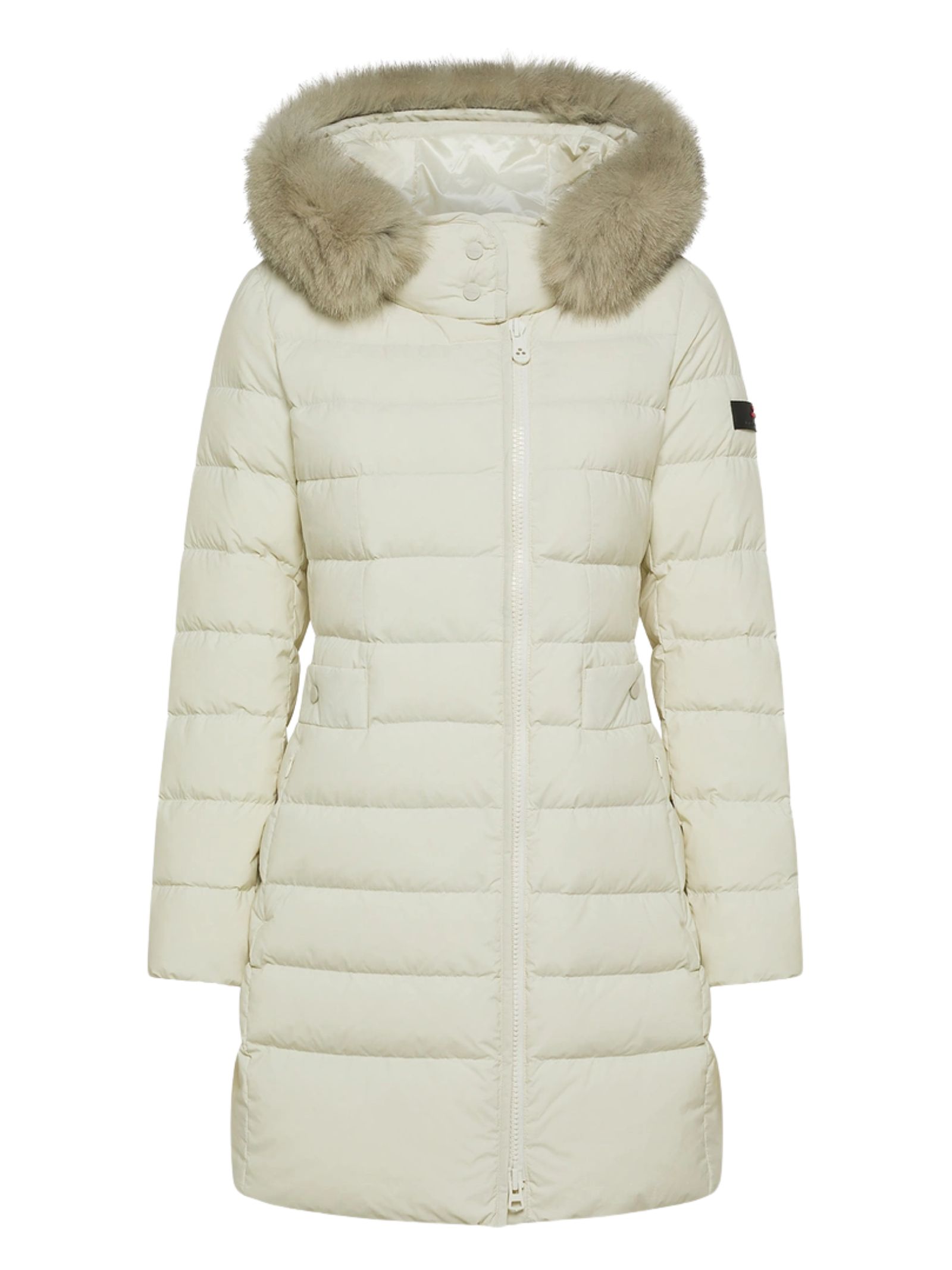Piumino lungo Peuterey trapuntato in leggero popeline di nylon e microfibra di poliestere, trattato ad alta temperatura per ottenere una mano sostenuta e un tatto polveroso. Limbottitura in piuma naturale assicura protezione termica con leggerezza. Il design è definito da una zip centrale a doppio cursore, collo avvolgente con bottoni a pressione tono su tono e cappuccio con bordo in pelliccia di volpe, removibile.
