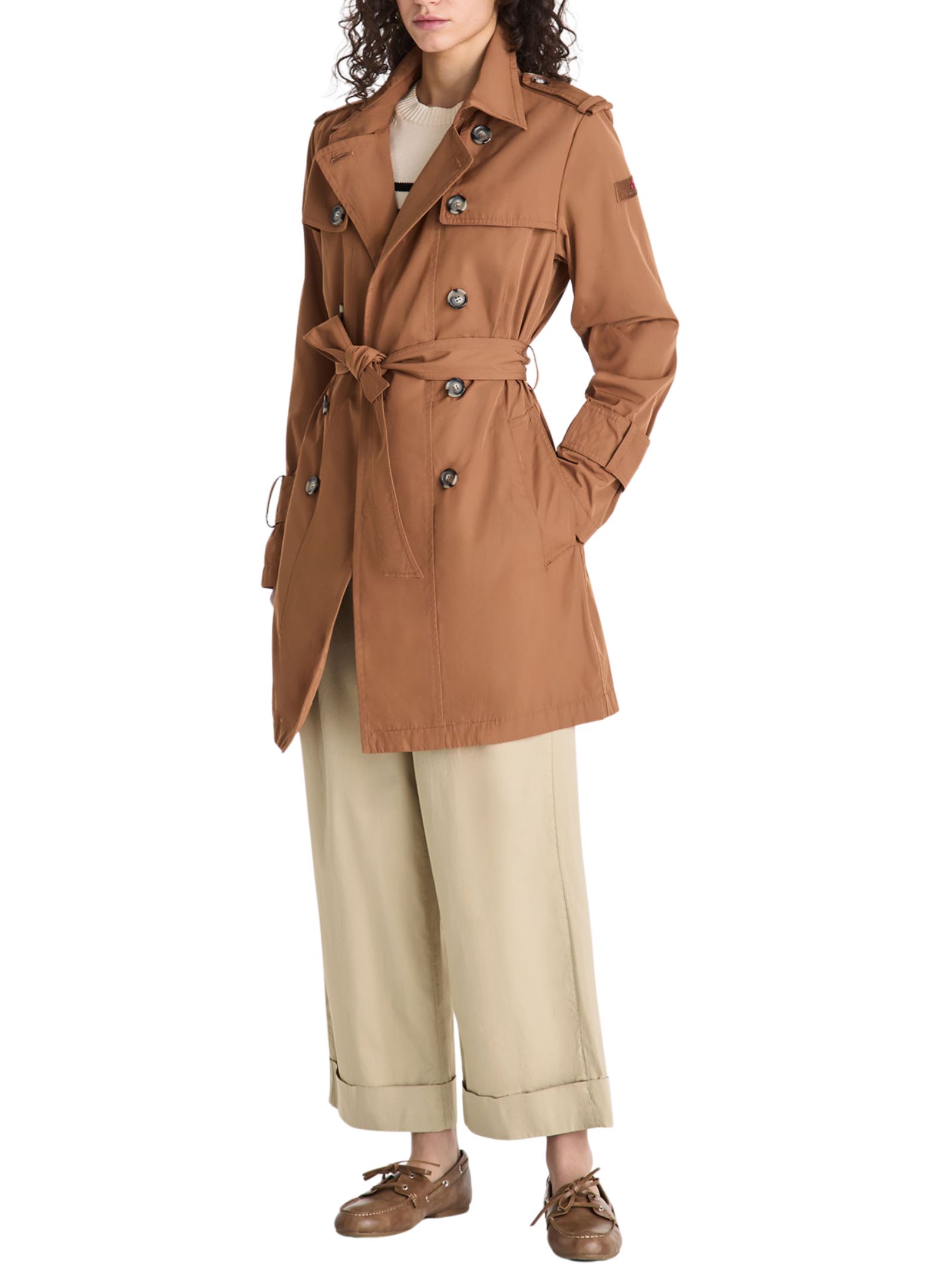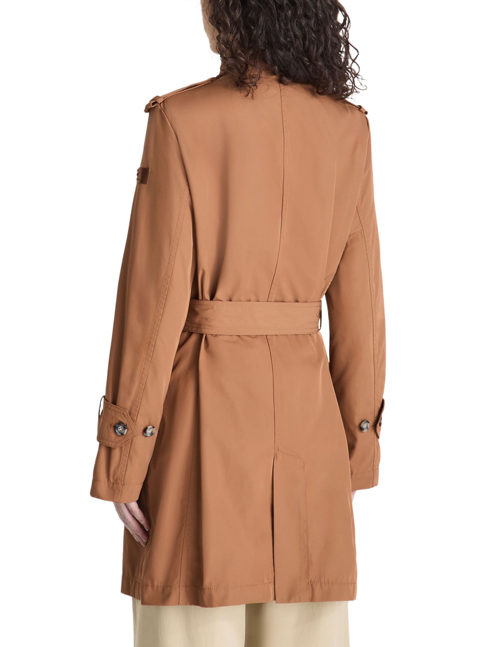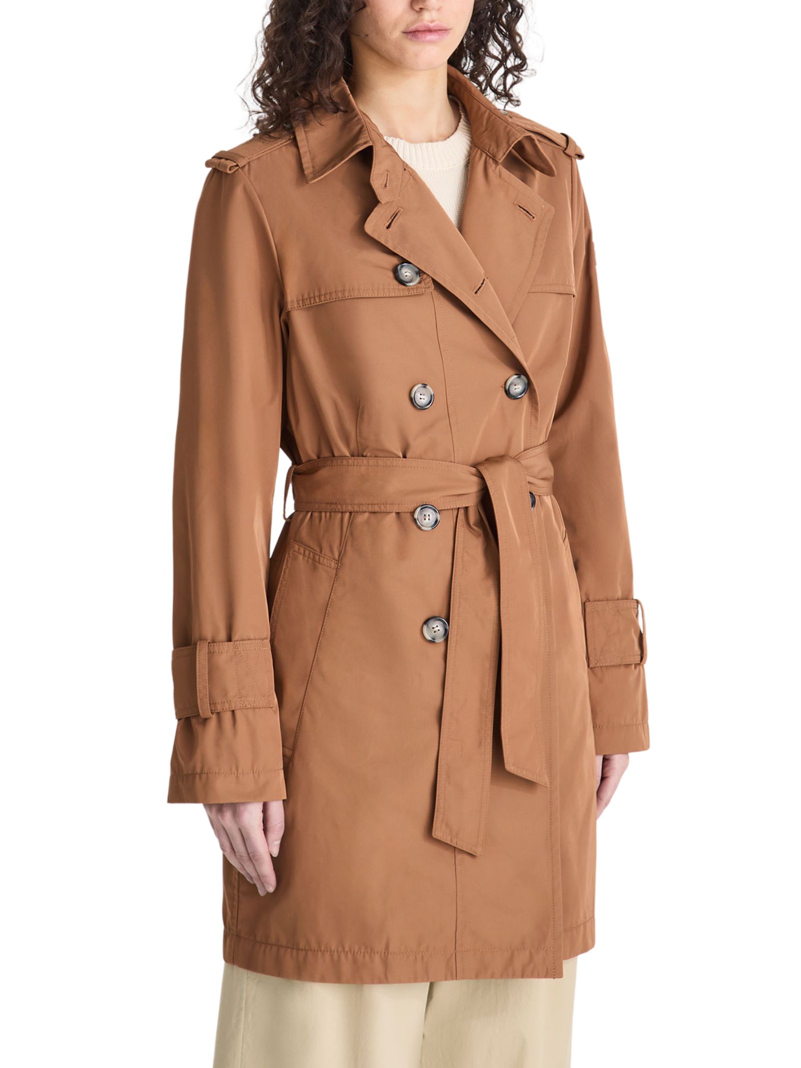 Trench doppiopetto in taffetà micro twill di poliestere, dal look tecnico ed elegante. Il design, femminile e raffinato, è valorizzato da dettagli classici come bottoni effetto corno, spalline, patta sul petto, ampie tasche laterali e cintura regolabile in vita. Dal fit regolare, è un capo versatile che unisce stile senza tempo e funzionalità. Idrorepellente e trattato senza PFC, offre protezione dalla pioggia leggera nel rispetto dell'ambiente.