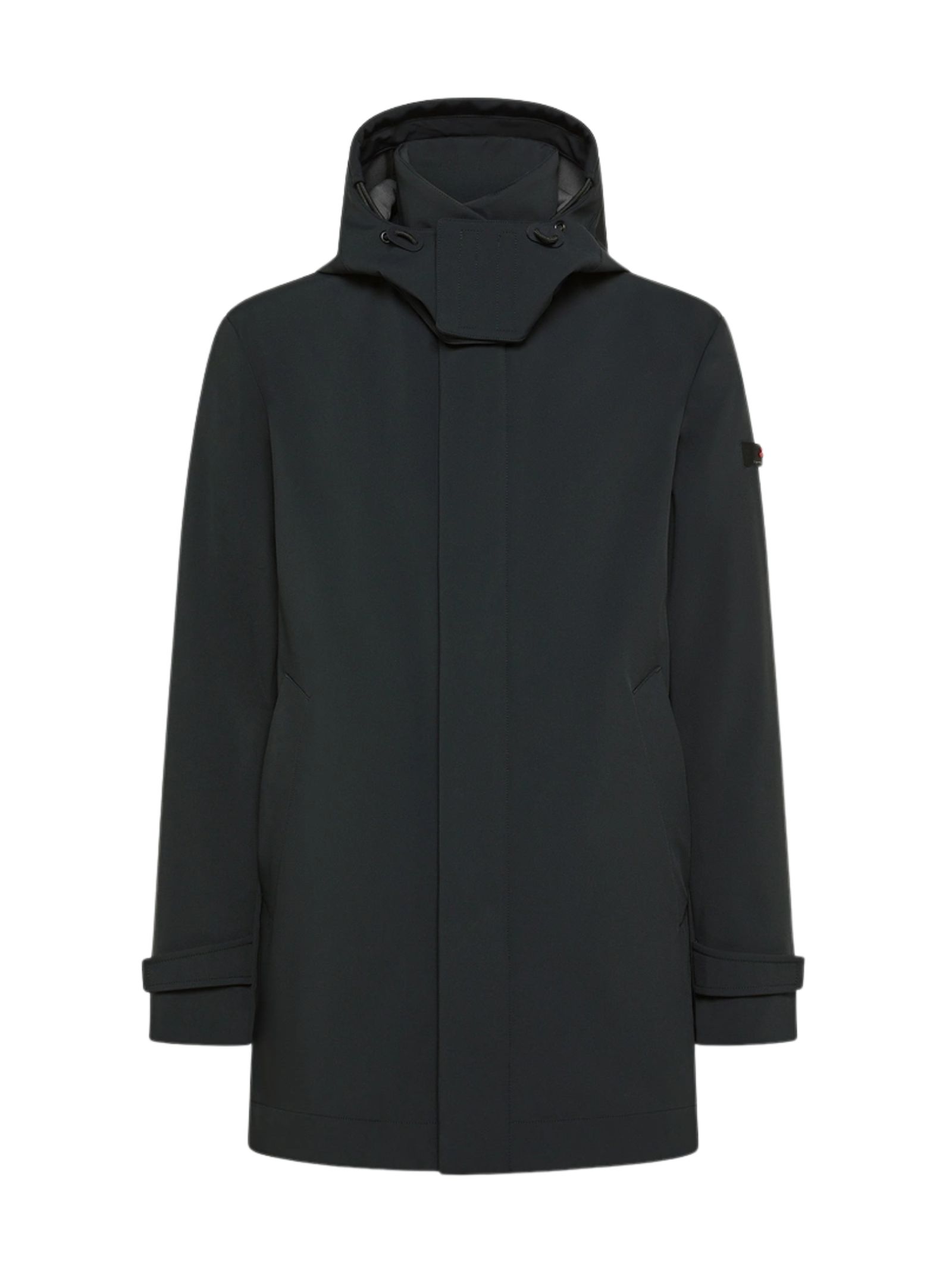 Trench liscio Peuterey di colore blu a tre strati; tela di nylon stretch sull'esterno, leggera membrana che protegge dagli agenti atmosferici ed è rifinita da una rete interna in jersey. Idrorepellente, vestibilità regular e linee eleganti, questo capospalla rappresenta uno dei bestseller di Peuterey. Cappuccio staccabile a collo alto con catarifrangente e coulisse. Collo a camicia, da portare anche rialzato, con bavero antivento con chiusura a strappo. Chiusura con zip nascosta a doppio cursore e bottoni a pressione.