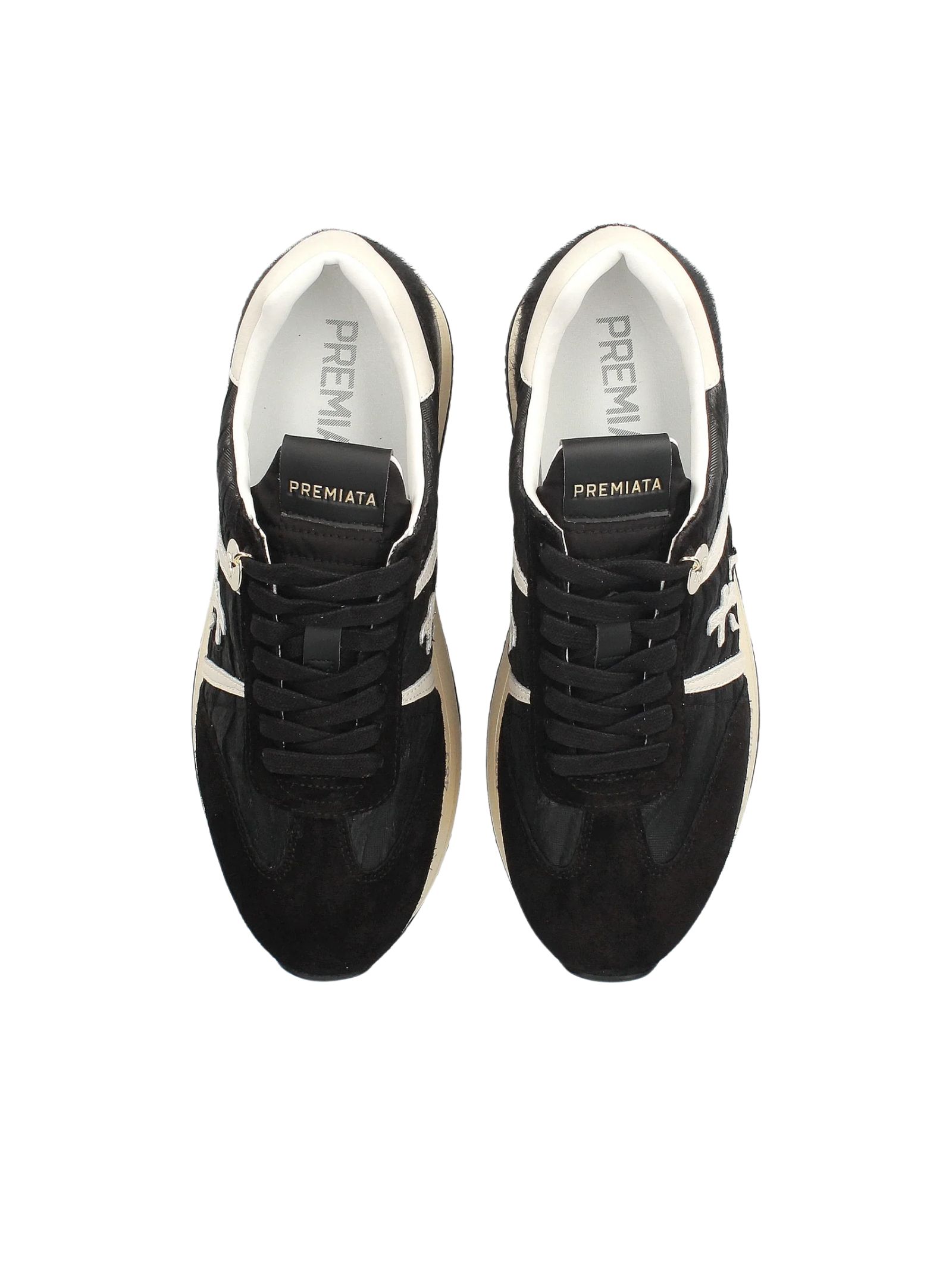 Sneakers Premiata con tomaia in pelle scamosciata e tessuto tecnico. Logo Premiata sui lati. Fondo in gomma da 4cm e suola Platform.