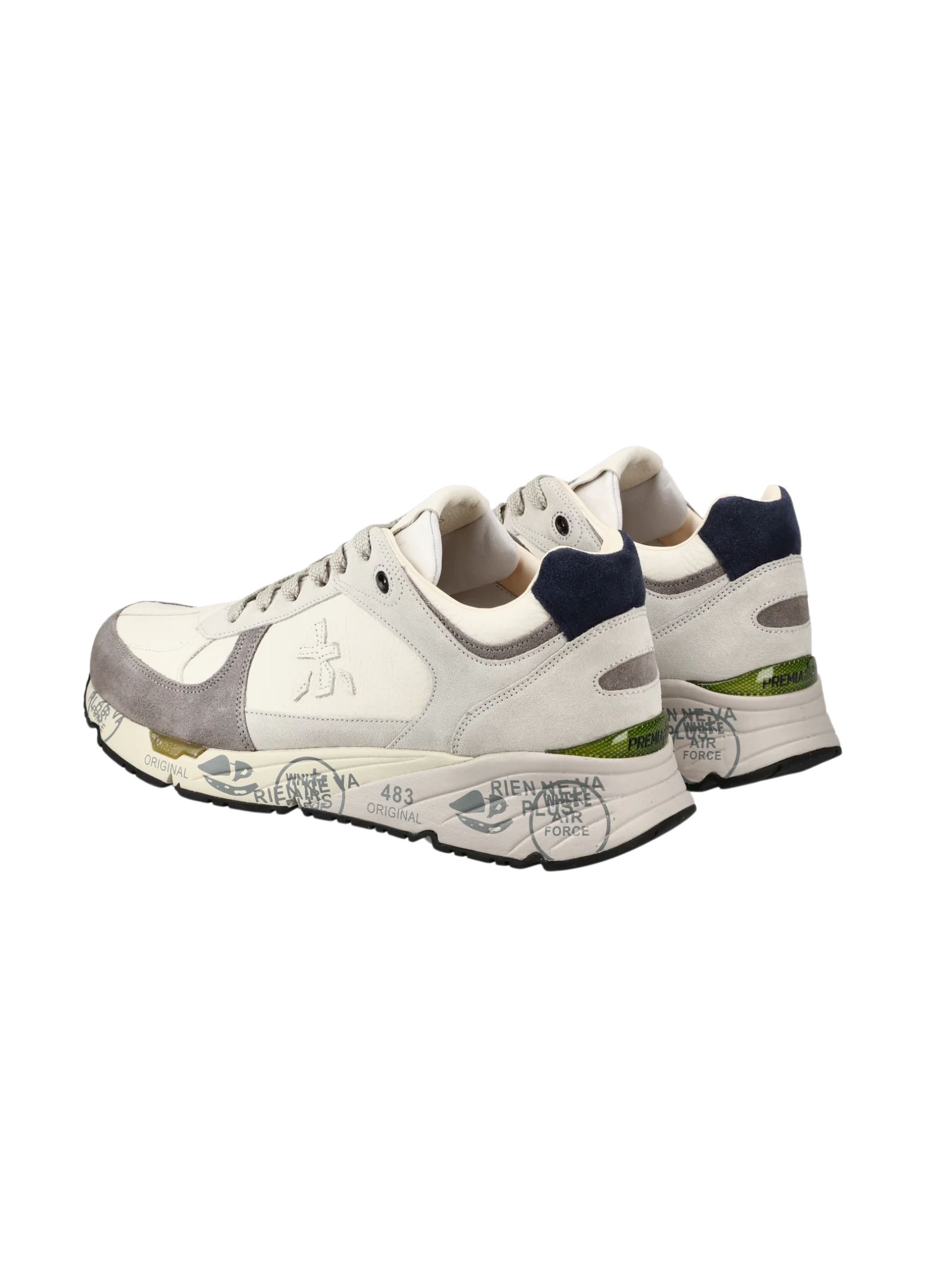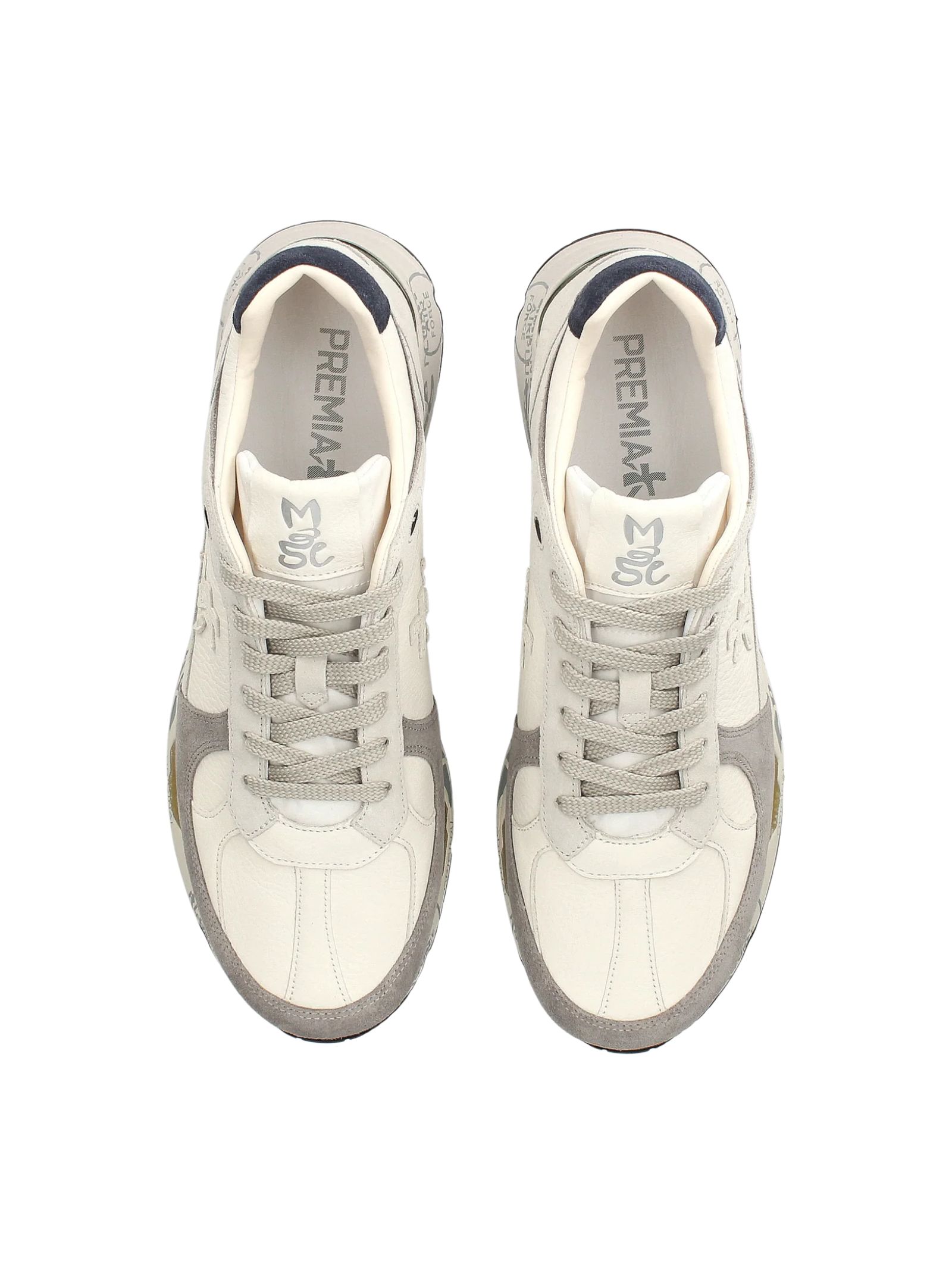 Sneakers Premiata in pelle e pelle scamosciata. Logo tono su tono laterale e timbri distintivi del brand sulla suola. Modello MASE iconico Premiata, con scritta distintiva sulla linguetta.