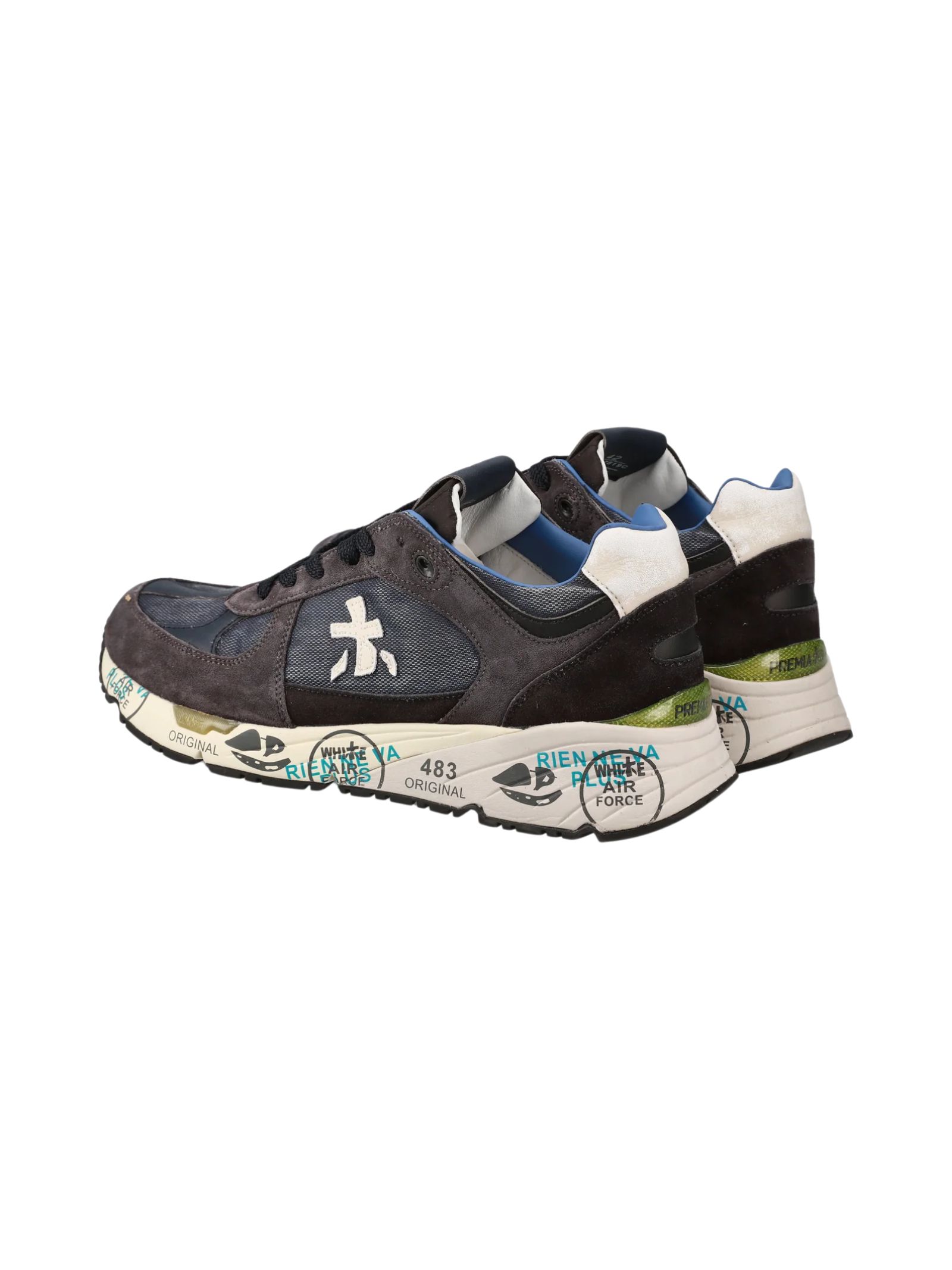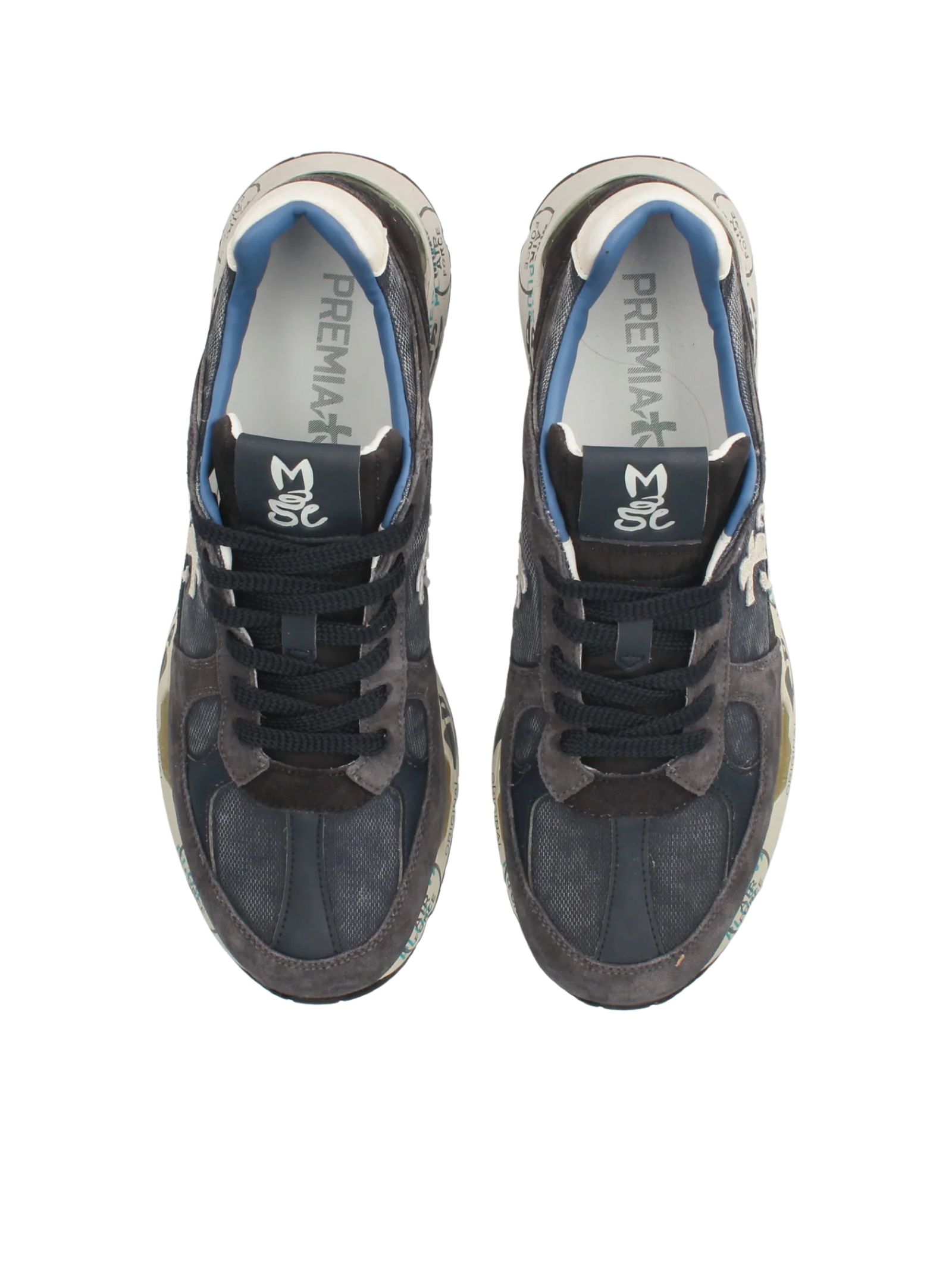 Sneakers Premiata in tessuto e pelle scamosciata. Logo laterale e timbri distintivi del brand sulla suola. Modello MASE iconico Premiata, con scritta distintiva sulla linguetta.