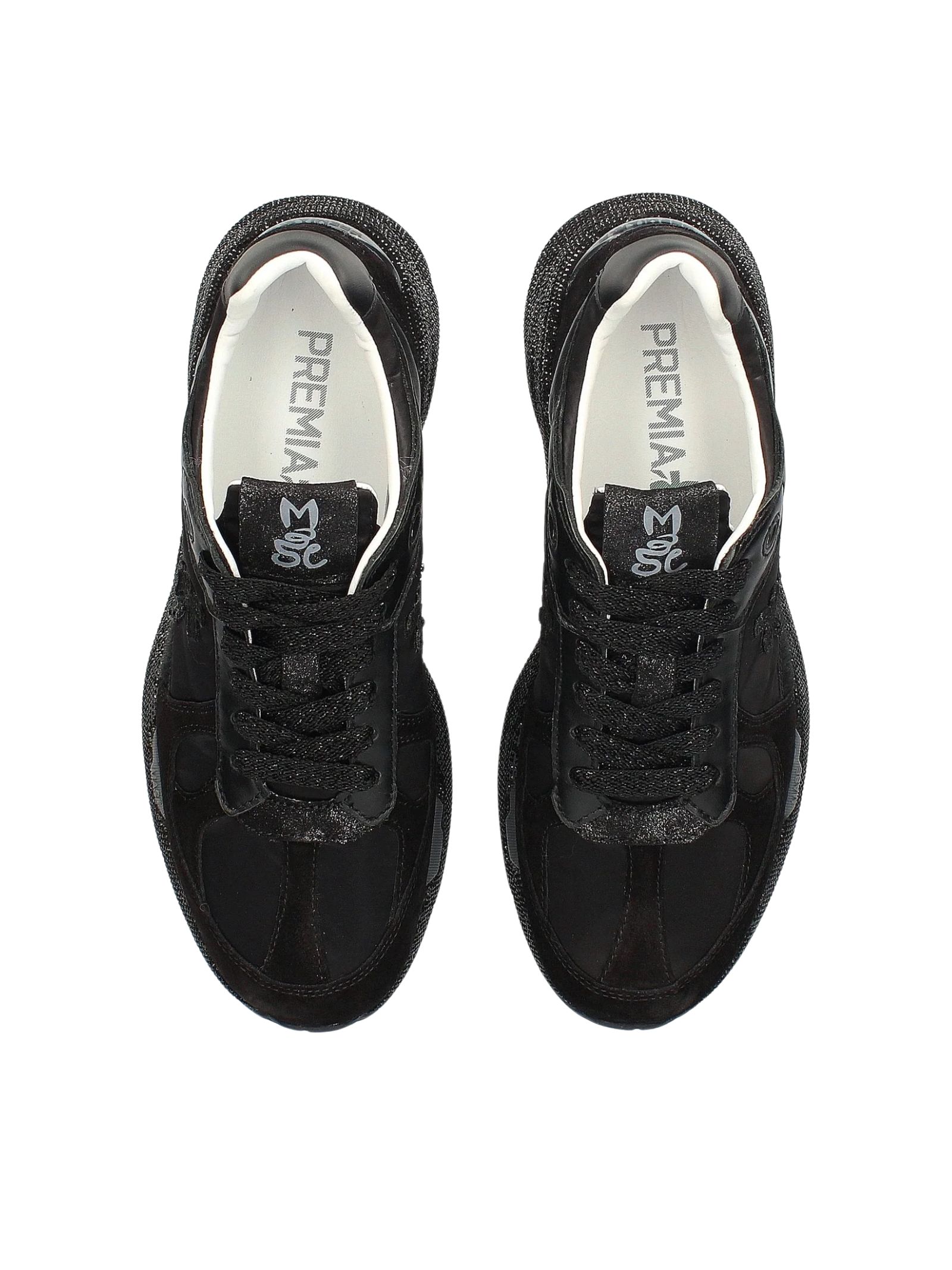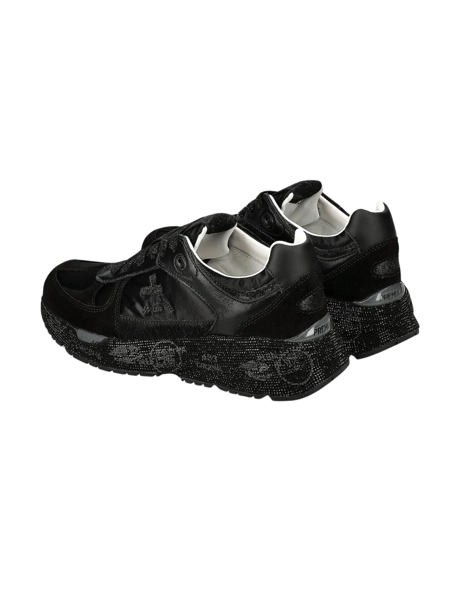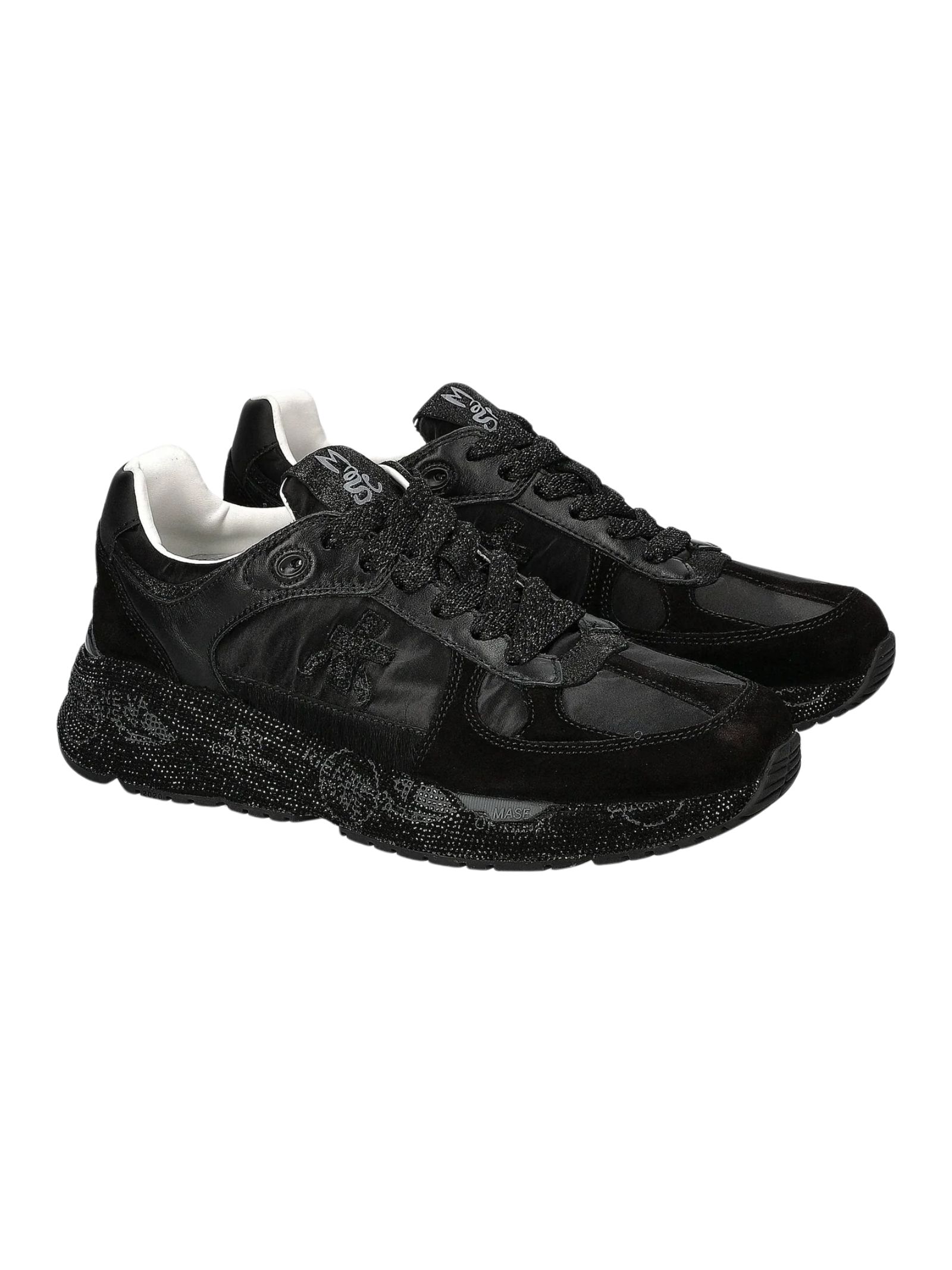 Sneakers Premiata total black in pelle e pelle scamosciata. Logo tono su tono laterale e timbri distintivi del brand sulla suola. Modello MASE iconico Premiata, con scritta distintiva sulla linguetta.