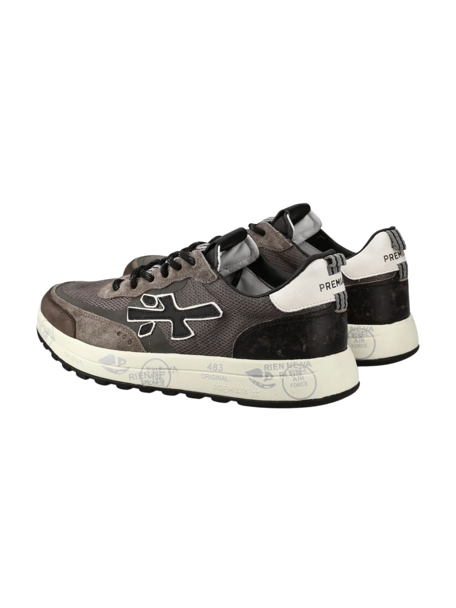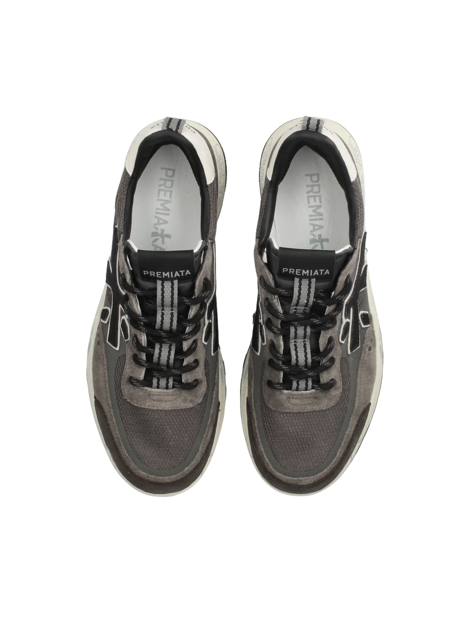 Sneakers Premiata in stile running in pelle scamosciata e tessuto. Logo laterale e timbri distintivi del brand sulla suola.