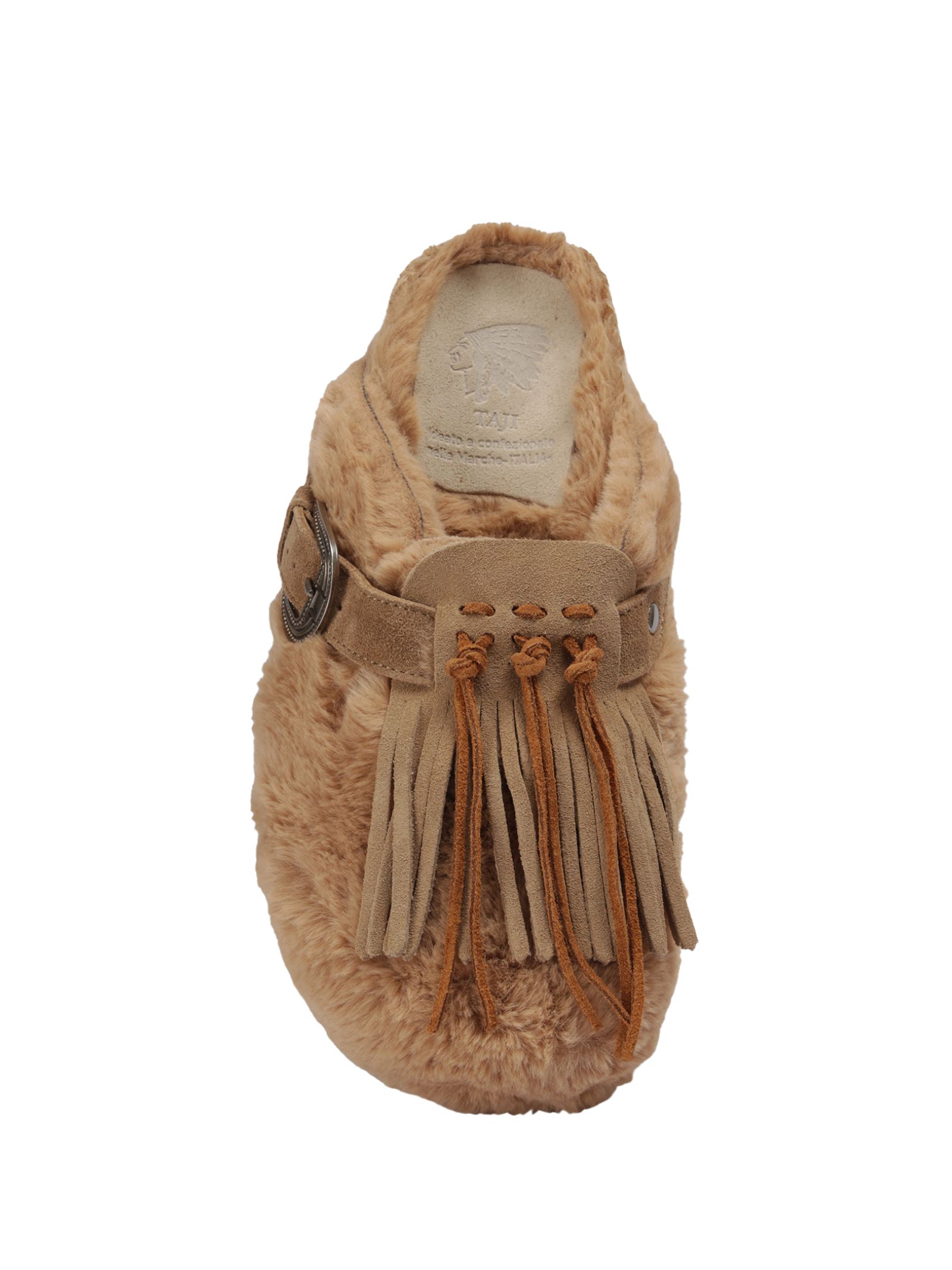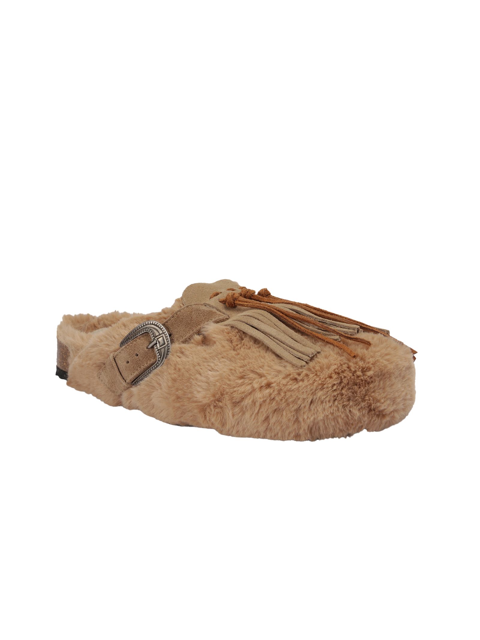 Sabot Taji con fibbia singola e frangia removibile, realizzati con tomaia e suola anatomica rivestite in morbida eco-pelliccia beige.