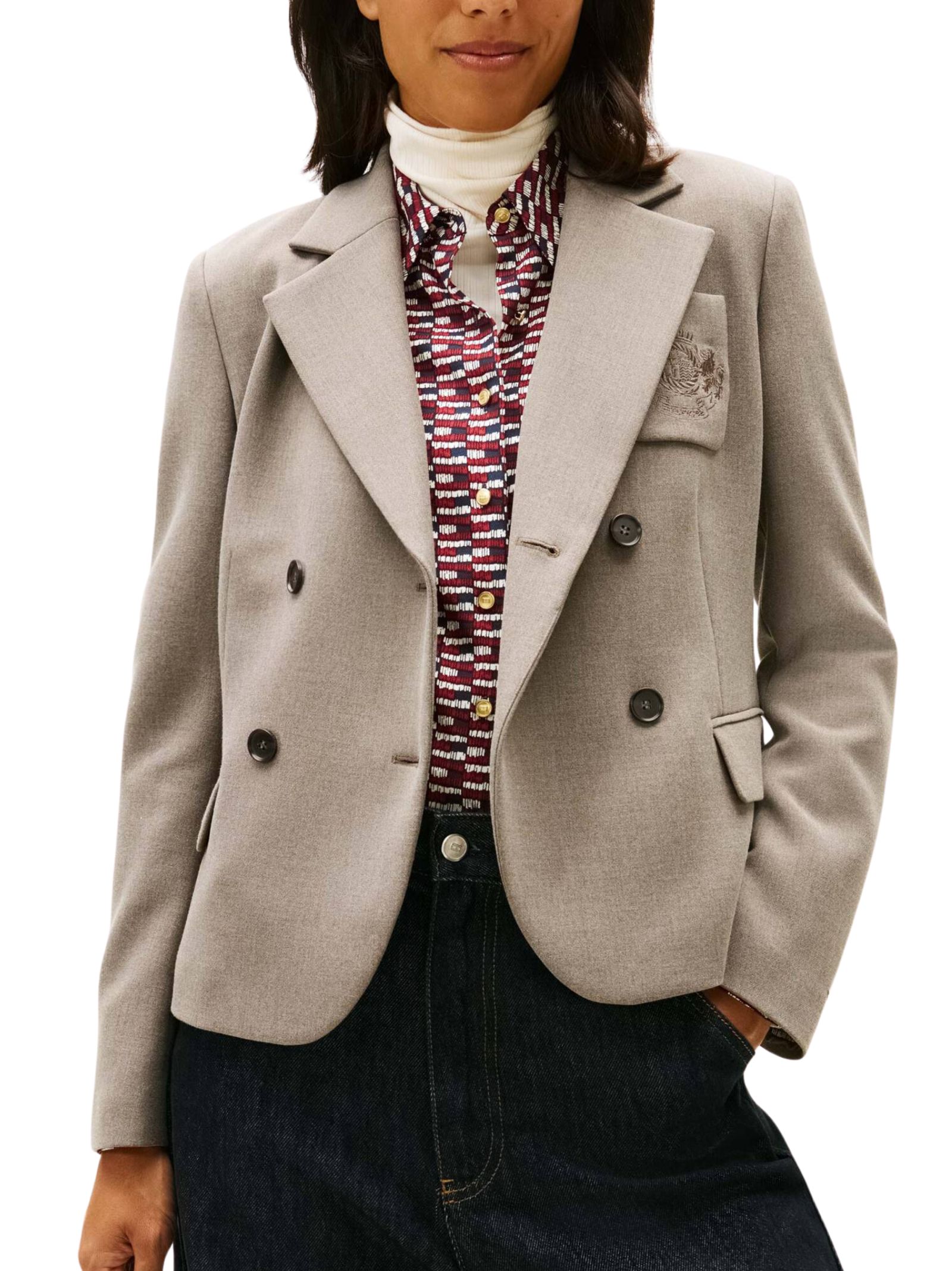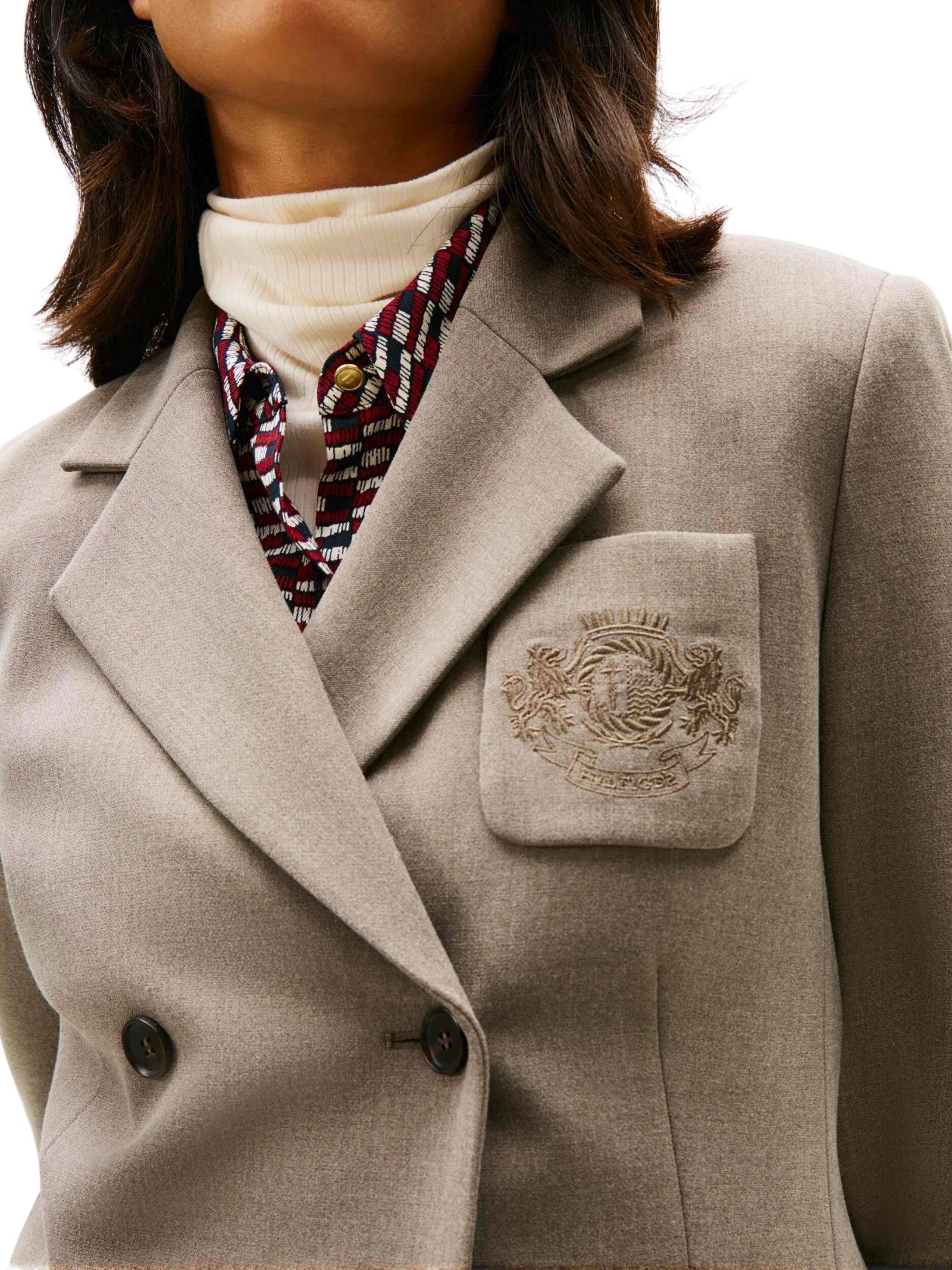 Giacca Tommy Hilfiger realizzata in tessuto a tinta unita con poliestere che assicura maggiore resistenza alle sgualciture; presenta una vestibilità dritta, struttura foderata con spalline imbottite, chiusura a bottoni con dettagli decorativi, tasche applicate e taschino sul petto; il modello contiene fibre riciclate e le taglie indicate sono europee, mentre quelle riportate sulle etichette possono differire per conversione; materiale: 68% poliestere, 28% viscosa e 4% elastan.