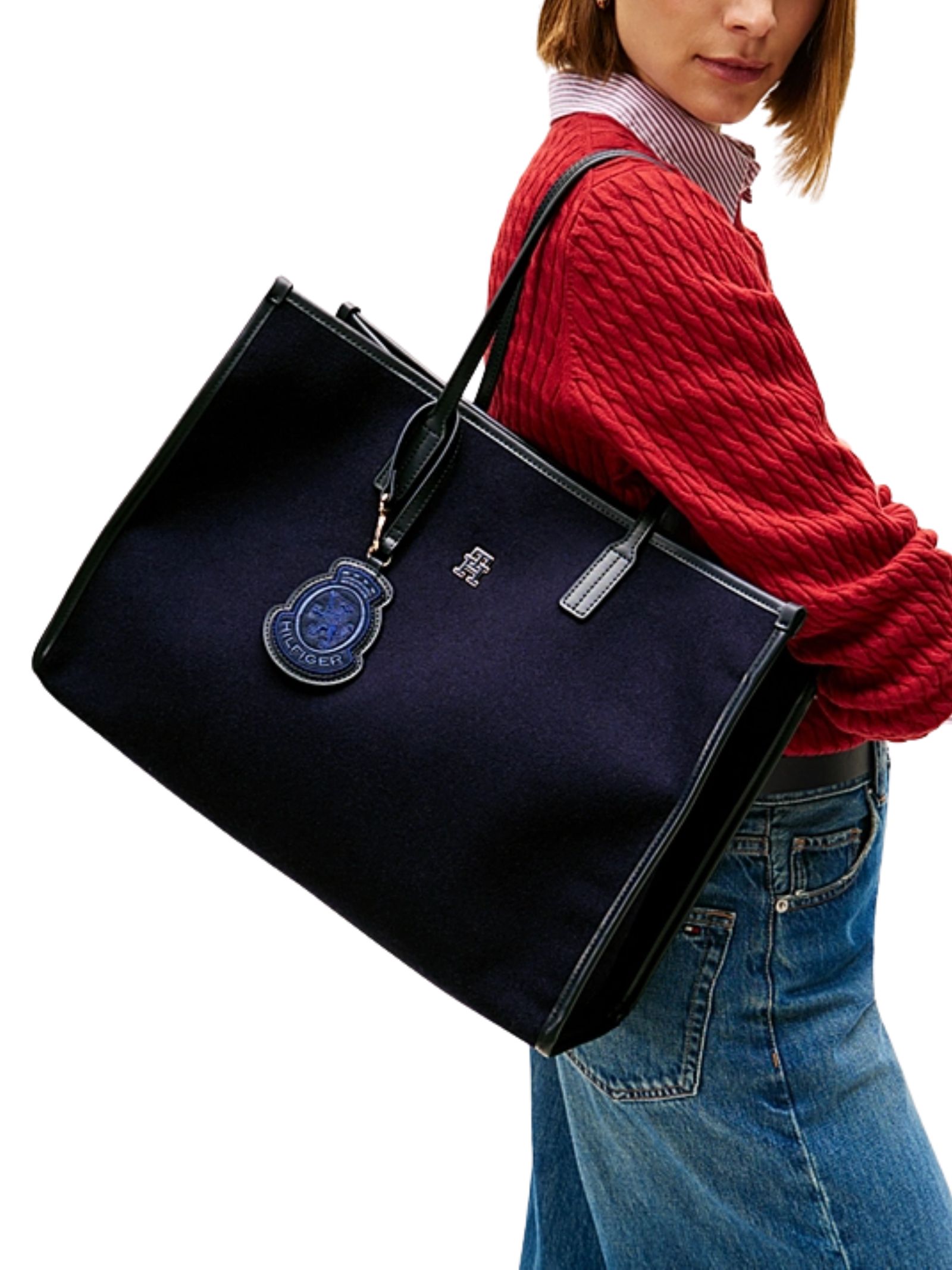 Borsa tote Tommy Hilfiger con dettagli metallizzati e al charm staccabile con stemma TH. Tessuto effetto lana. Dimensioni 43 x 17,5 x 31 cm. Capienza: 23l. Composizione: 100% poliuretano