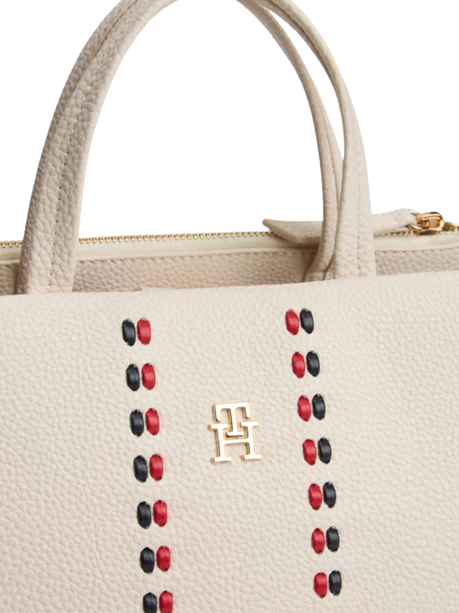 Elegante borsa di color panna da donna Tommy Hilfiger, con finitura goffrata e chiusura magnetica. Offre due opzioni di trasporto: doppia maniglia sulla parte superiore e tracolla pieghevole. Ha uno spazio unico con una tasca esterna con cerniera, un dettaglio del nastro distintivo sul davanti e la targa monogramma TH. Dimensioni: 29 x 16 x 23 cm, capacità 7 L. Realizzata al 100% in poliuretano. Marchio Tommy Hilfiger.