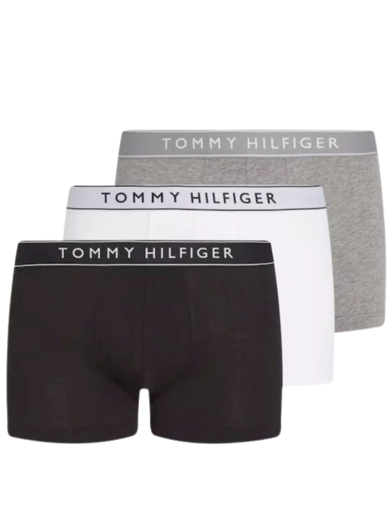 Confezione da 3 boxer Tommy Hilfiger nei colori nero, grigio scuro e bianco, in cotone riciclato elasticizzato (95% cotone, 5% elastan) per comfort e vestibilità quotidiana.