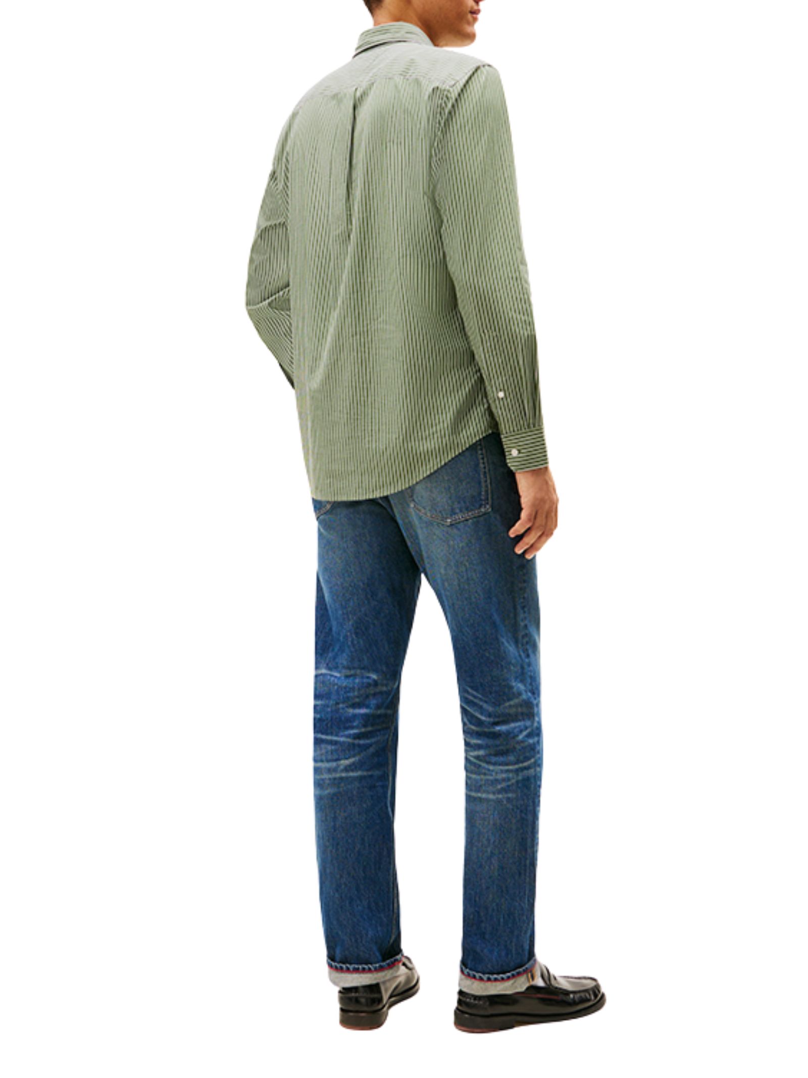 Camicia regular fit in tessuto stretch a quattro direzioni dal gusto sofisticato, realizzata in popeline di puro cotone manopesca con tecnologia Flex e motivo gessato all over, caratterizzata da colletto button down, polsini arrotondati con bottone, piega centrale sul retro e dettagli iconici Tommy Hilfiger con nastro interno al collo e bandierina ricamata sul petto. 100% cotone.