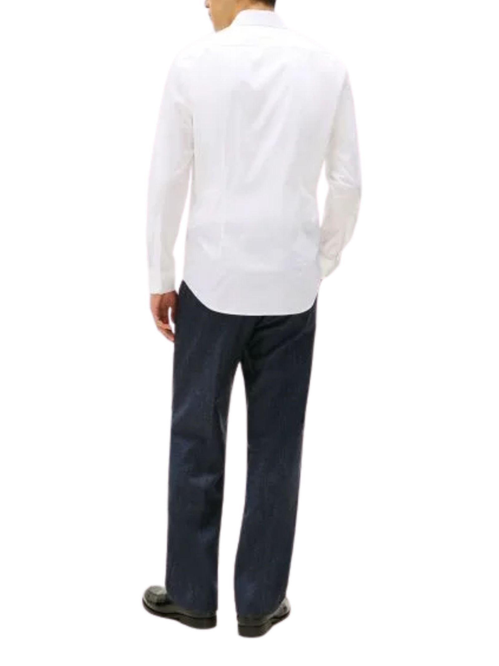 Camicia bianca slim fit in popeline elasticizzato a 4 direzioni, dal taglio pulito e impeccabile, ideale per il guardaroba elegante; realizzata con tecnologia Flex per un comfort superiore, presenta colletto semi-diffuso, polsini a due bottoni con taglio a mitra, marchio Tommy Hilfiger e ricamo della bandiera sul petto. Composizione: 98% cotone, 2% elastan.