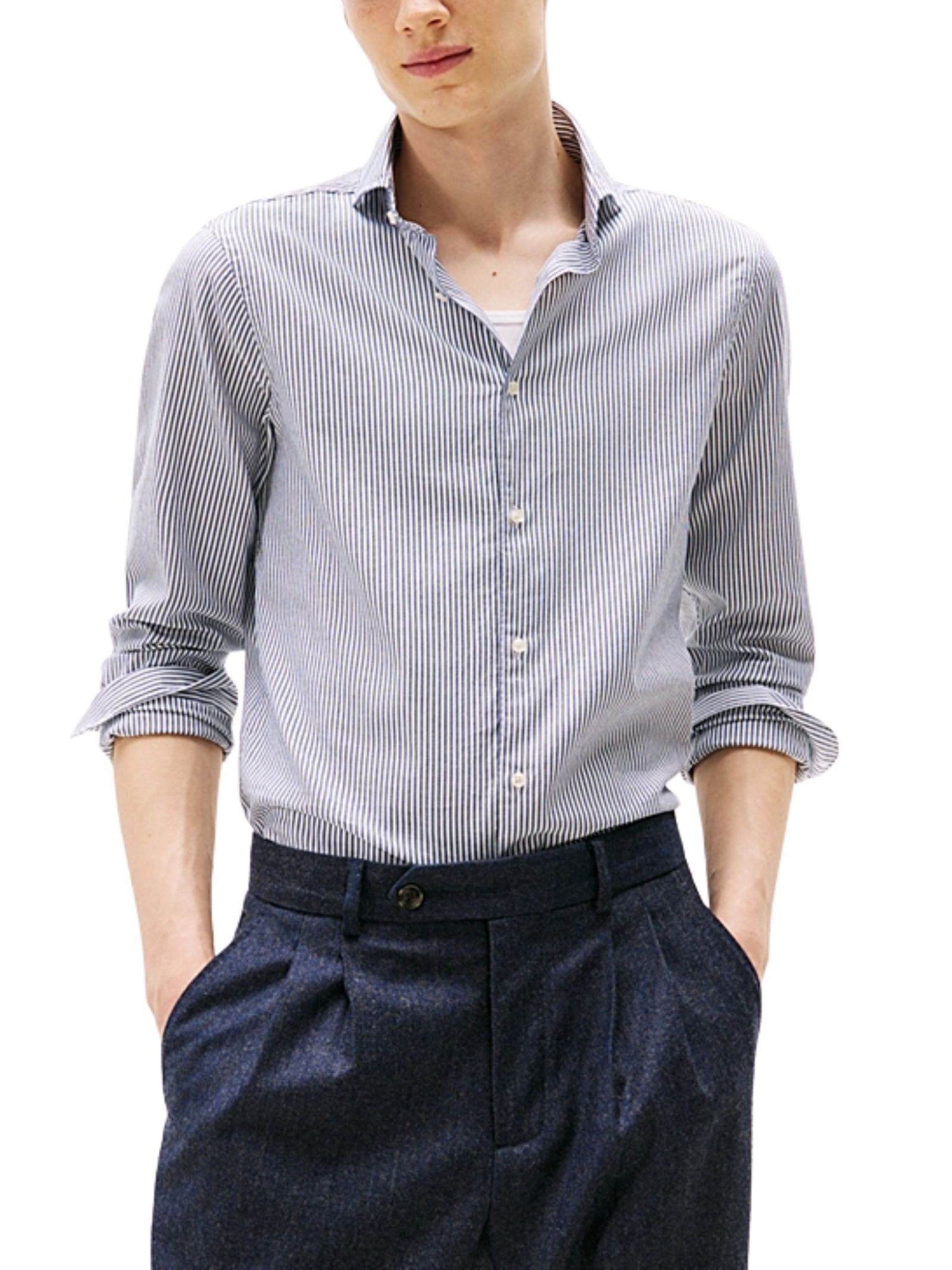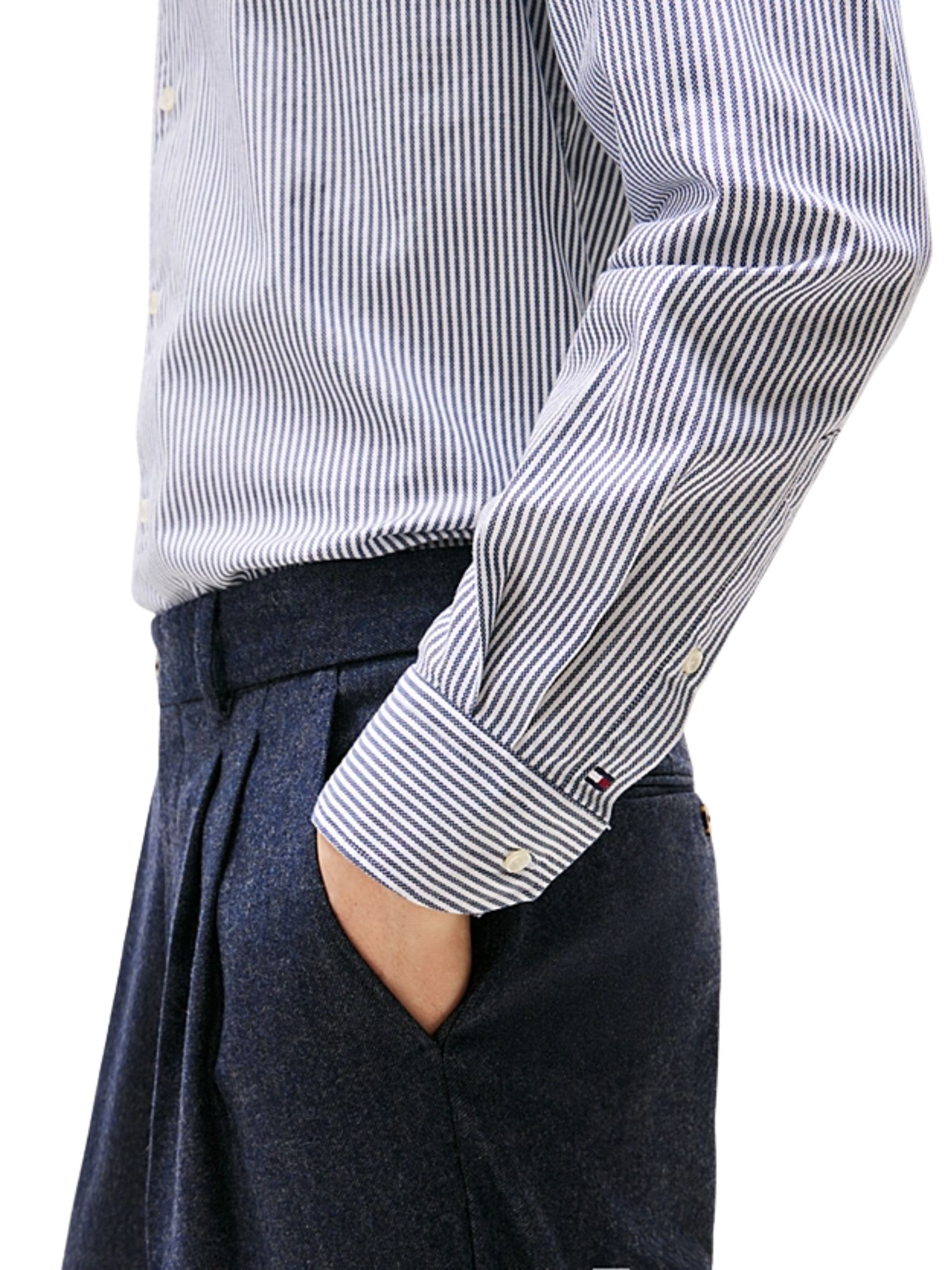 Camicia slim fit in puro cotone Oxford a righe Ithaca, bianche e celesti, caratterizzata da pieghe sul retro che ne accentuano il taglio aderente e da dettagli iconici Tommy Hilfiger; dotata di colletto alla francese, polsini smussati con due bottoni, branding distintivo e bandierina ricamata sul polsino. Realizzata al 100% in cotone.