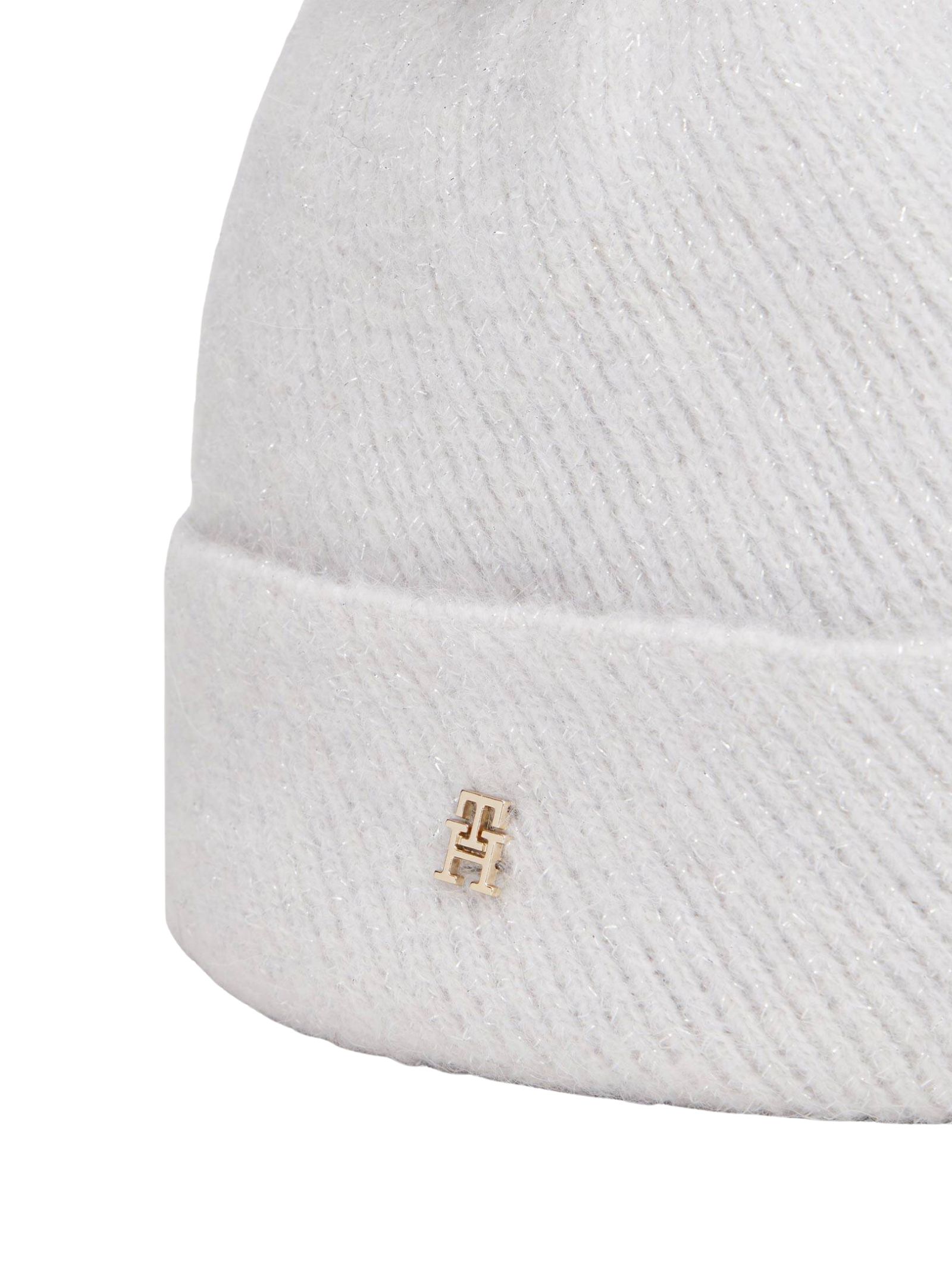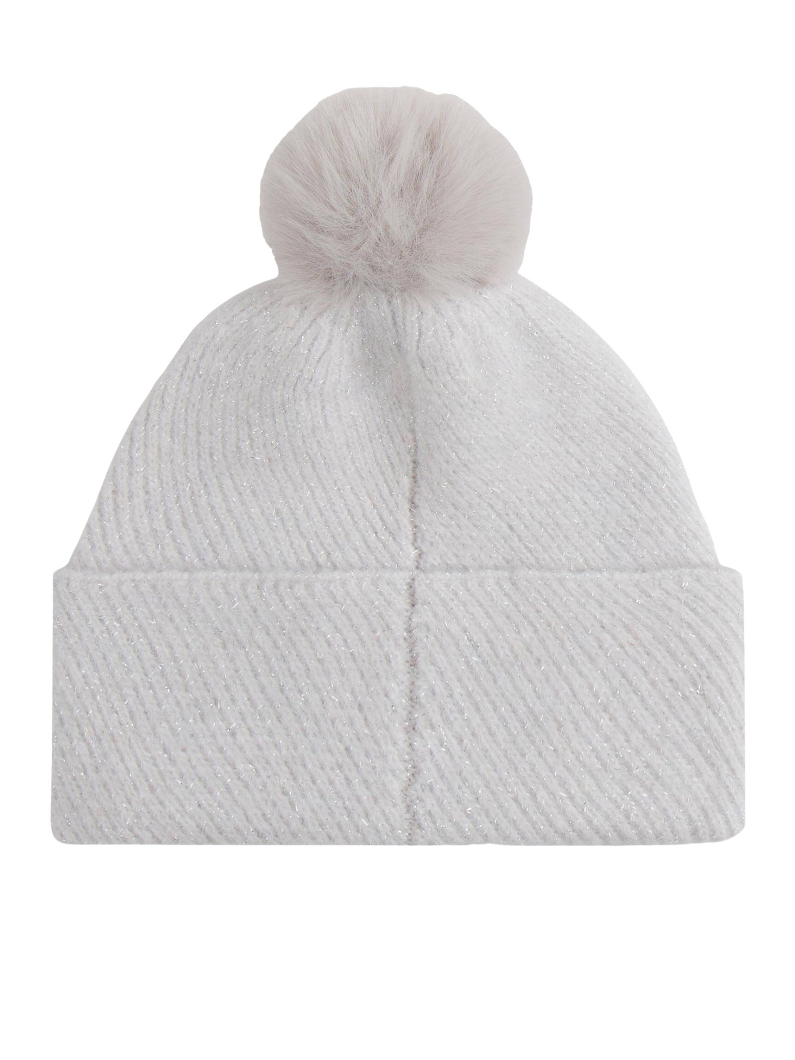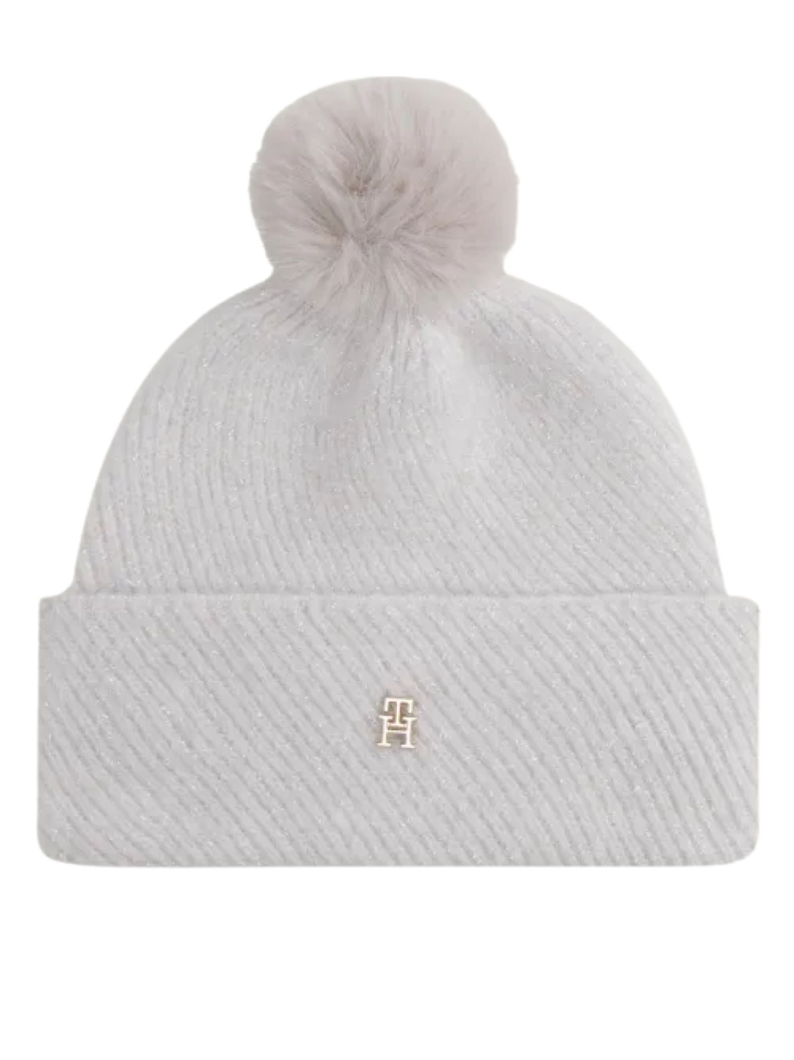 Cappellino con pompon in colore grigio, realizzato in misto fibre composto da 53% poliestere, 17% lana, 14% alpaca, 4% spandex e 3% altre fibre.