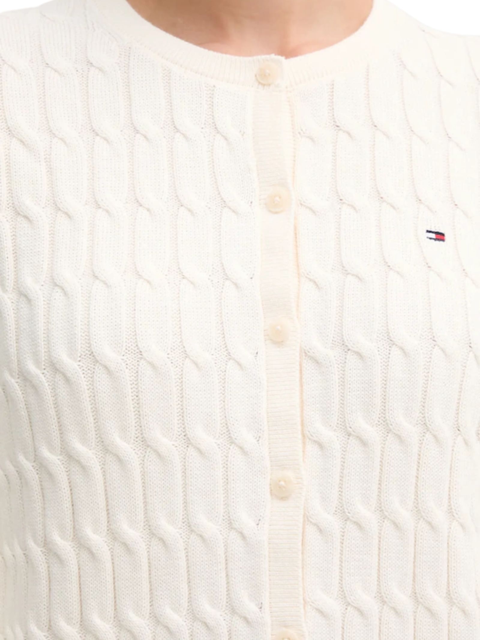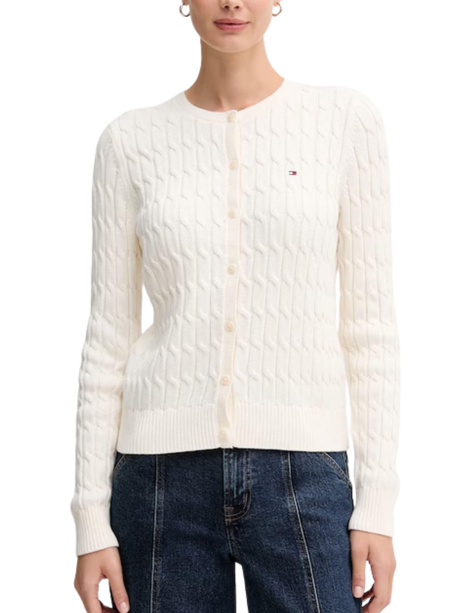 Cardigan Tommy Hilfiger in maglia di cotone di medio peso, caratterizzato da un taglio sottile che valorizza la silhouette. Versatile e adatto a look eleganti o casual, presenta chiusura frontale con bottoni per una vestibilità pratica e confortevole. Rifinito con lavorazione a trecce. 100% Cotone