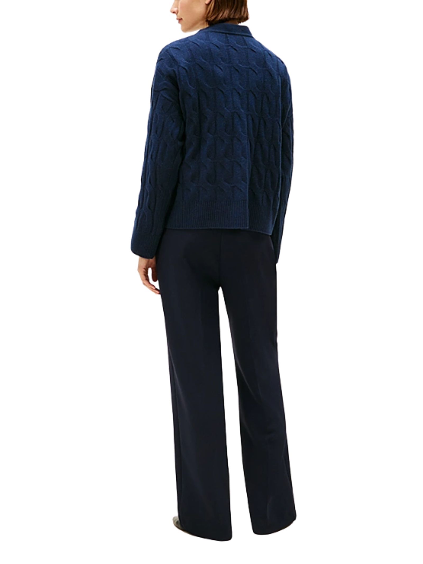 Cardigan oversize blu in morbidissima maglia intrecciata di pura lana, perfetto per look a strati. Realizzato al 100% in lana, presenta una maglia intrecciata all over, bottoni dorati con bandierina Tommy Hilfiger in rilievo, scollatura a V, chiusura con bottoni e due tasche applicate sul davanti. Collo, abbottonatura, polsini e fondo sono a coste. Il branding Tommy Hilfiger è valorizzato dalla bandierina ricamata sul petto. Vestibilità oversize con spalle scese; la modella è alta 176 cm e indossa la taglia S.