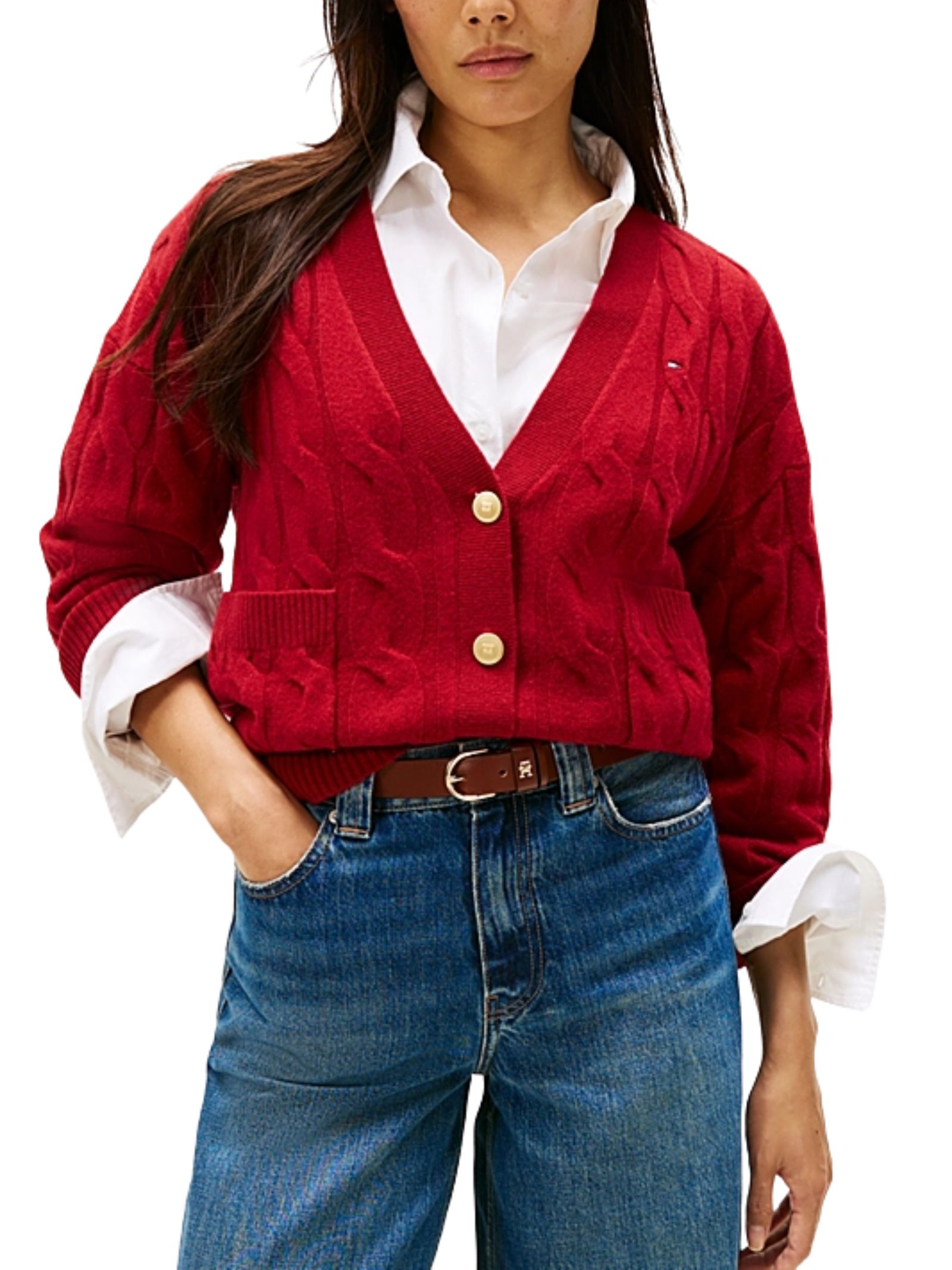 Cardigan oversize rosso in morbidissima maglia intrecciata di pura lana, perfetto per look a strati. Realizzato al 100% in lana, presenta una maglia intrecciata all over, bottoni dorati con bandierina Tommy Hilfiger in rilievo, scollatura a V, chiusura con bottoni e due tasche applicate sul davanti. Collo, abbottonatura, polsini e fondo sono a coste. Il branding Tommy Hilfiger è valorizzato dalla bandierina ricamata sul petto. Vestibilità oversize con spalle scese; la modella è alta 176 cm e indossa la taglia S.
