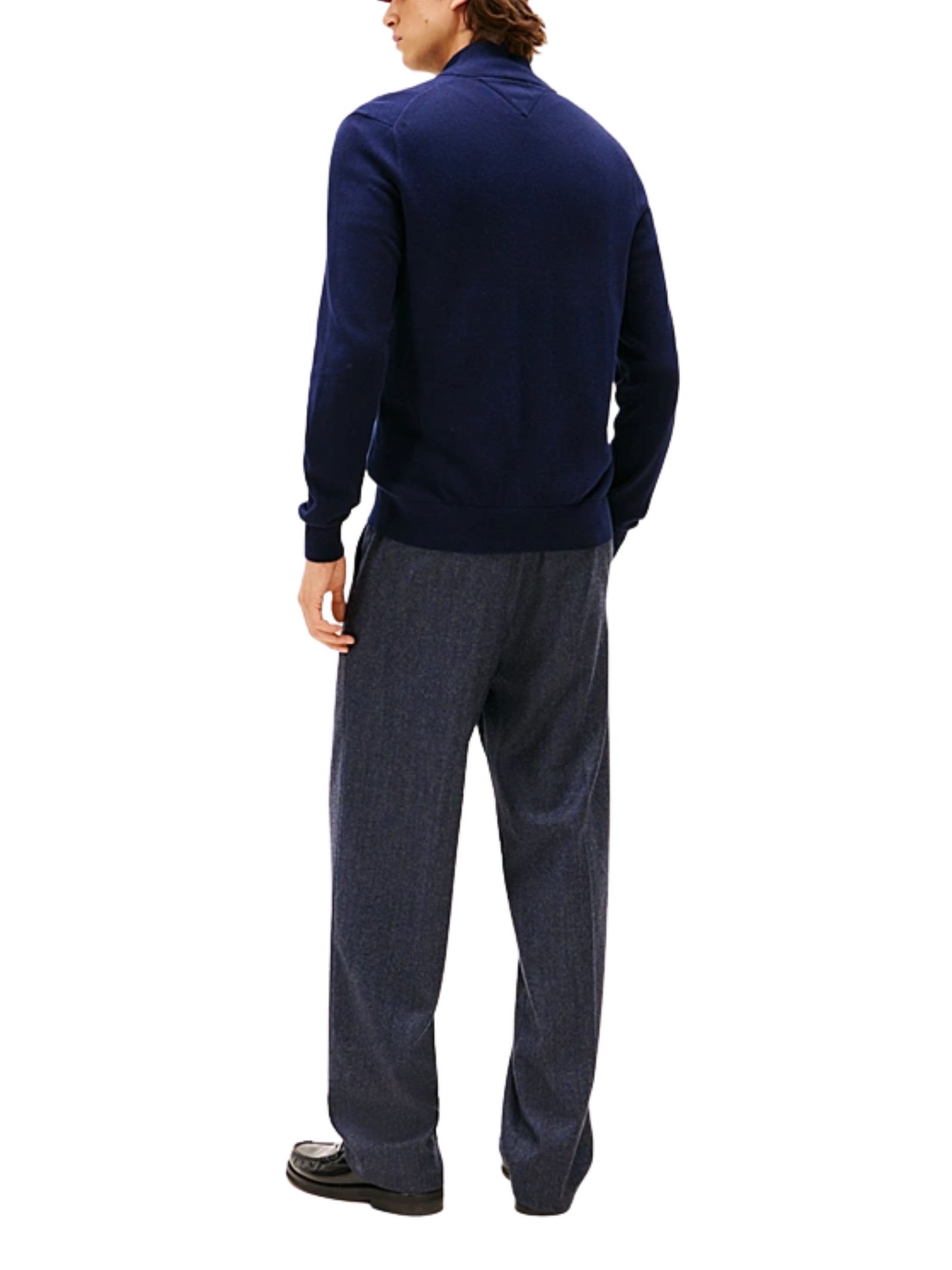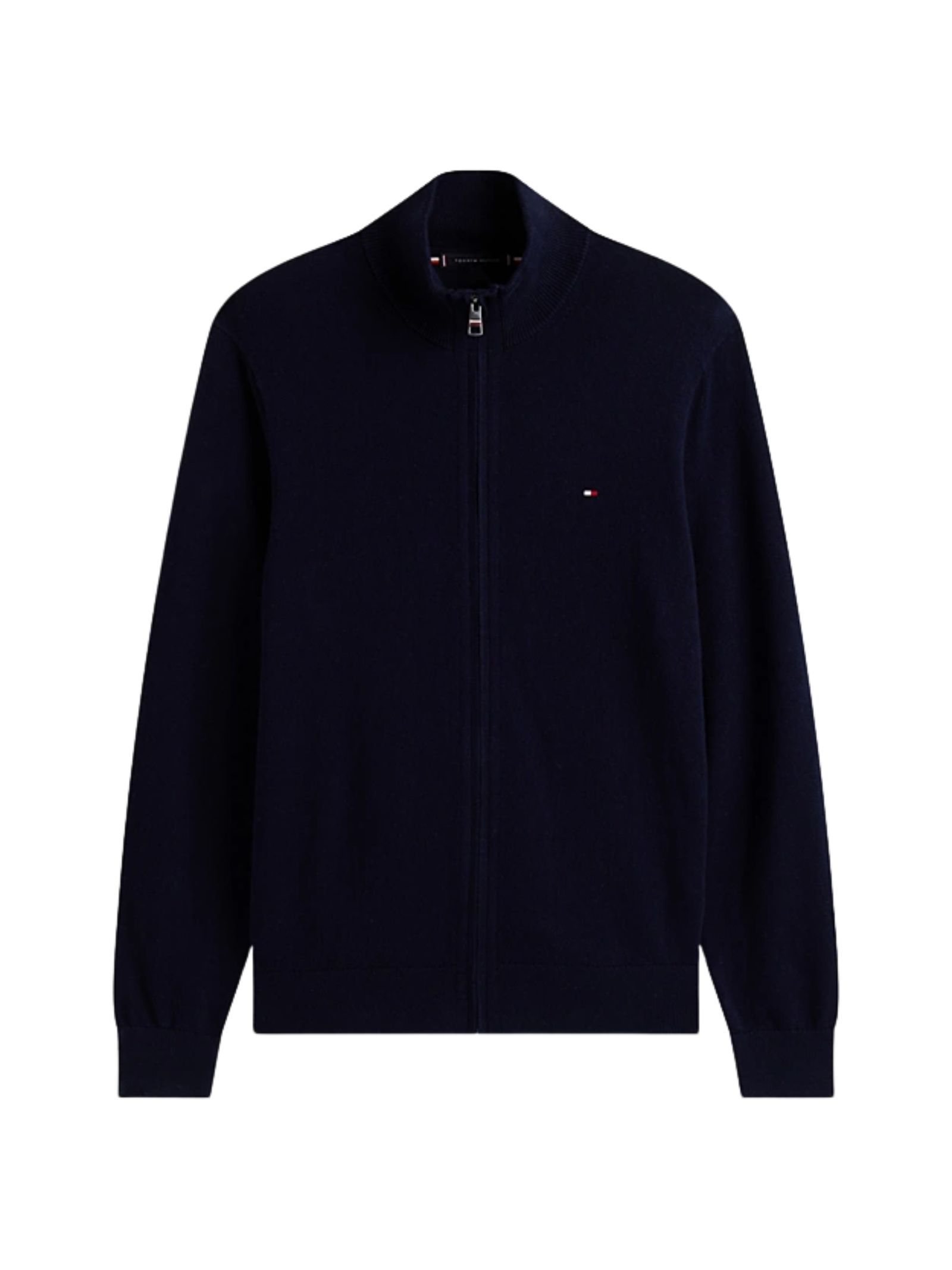 Cardigan blu regular fit con zip integrale, realizzata in morbido misto cotone pima e cashmere per un look raffinato, arricchita dalliconica bandierina ricamata. Presenta collo a lupetto, polsini e fondo a coste, con dettaglio distintivo sul tiretto della zip. Composizione: 95% cotone, 5% cashmere.