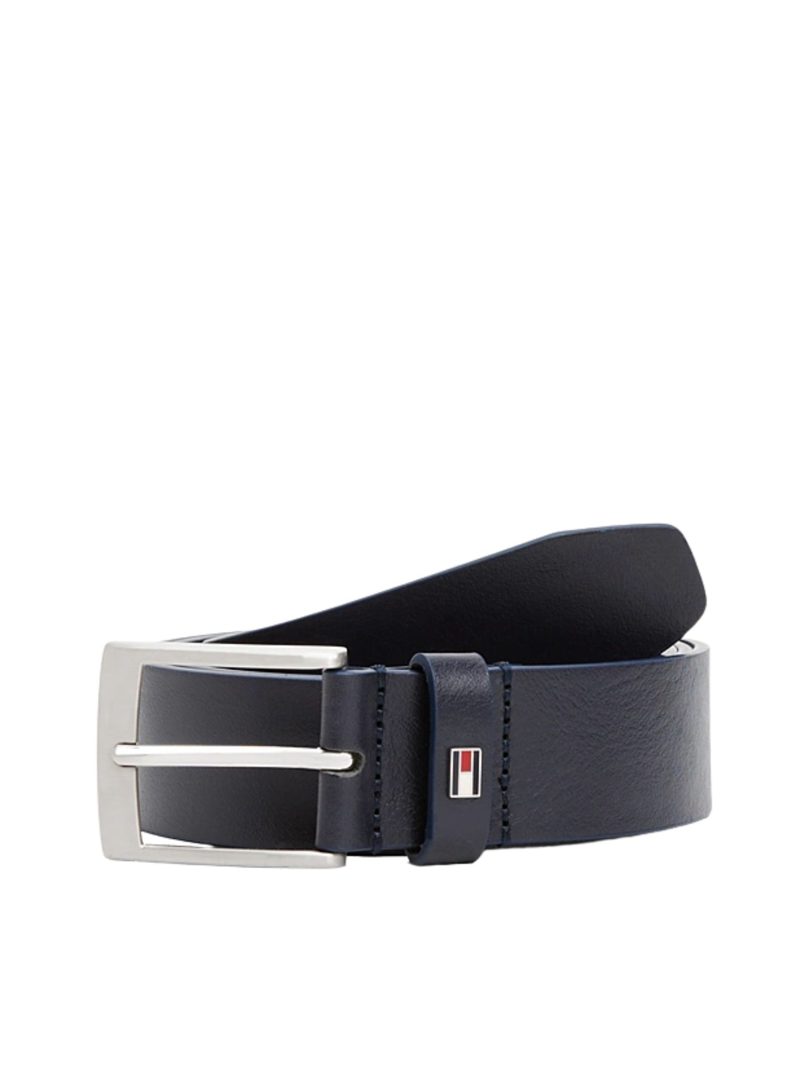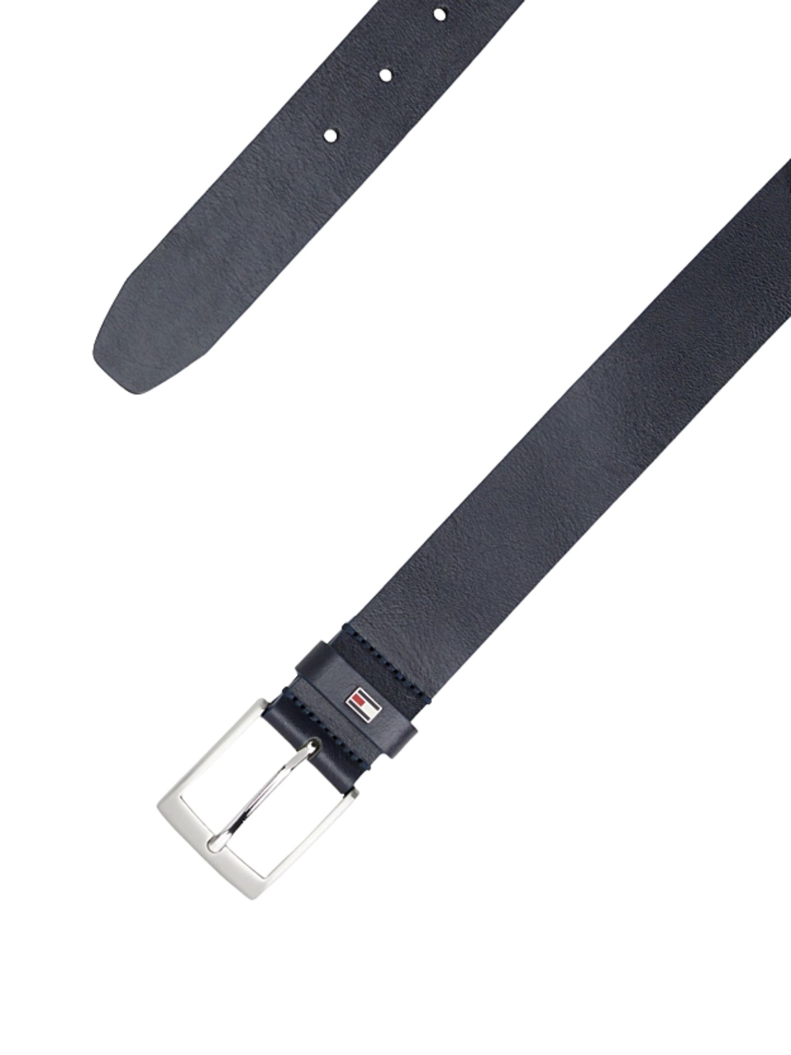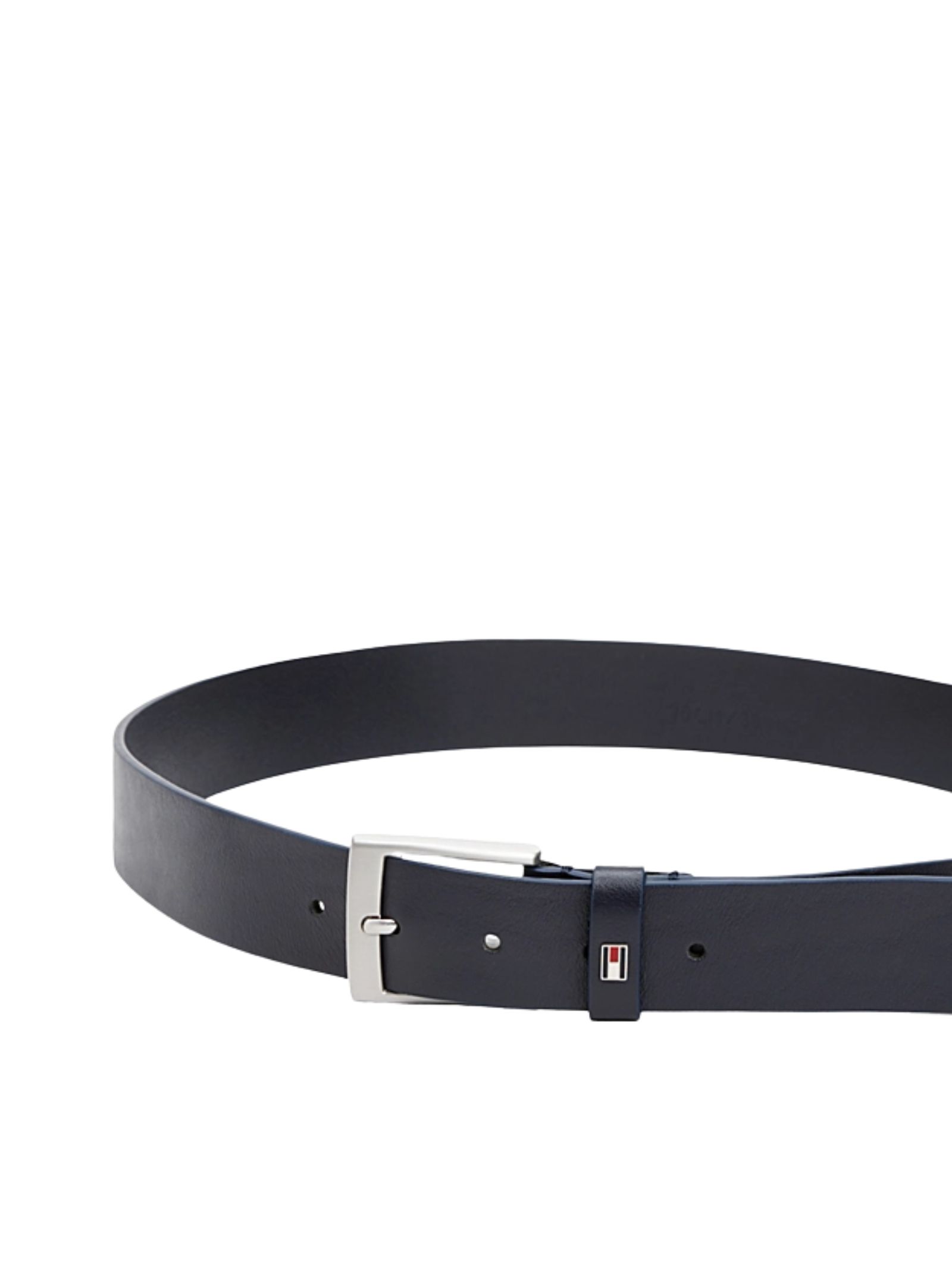 Cintura blu Tommy Hilfiger in pelle con finitura liscia, caratterizzata da fibbia quadrata in metallo spazzolato e bandierina smaltata sul passante. Con una larghezza di 3,5 cm, aggiunge un tocco raffinato a qualsiasi outfit. Composizione: 100% pelle.