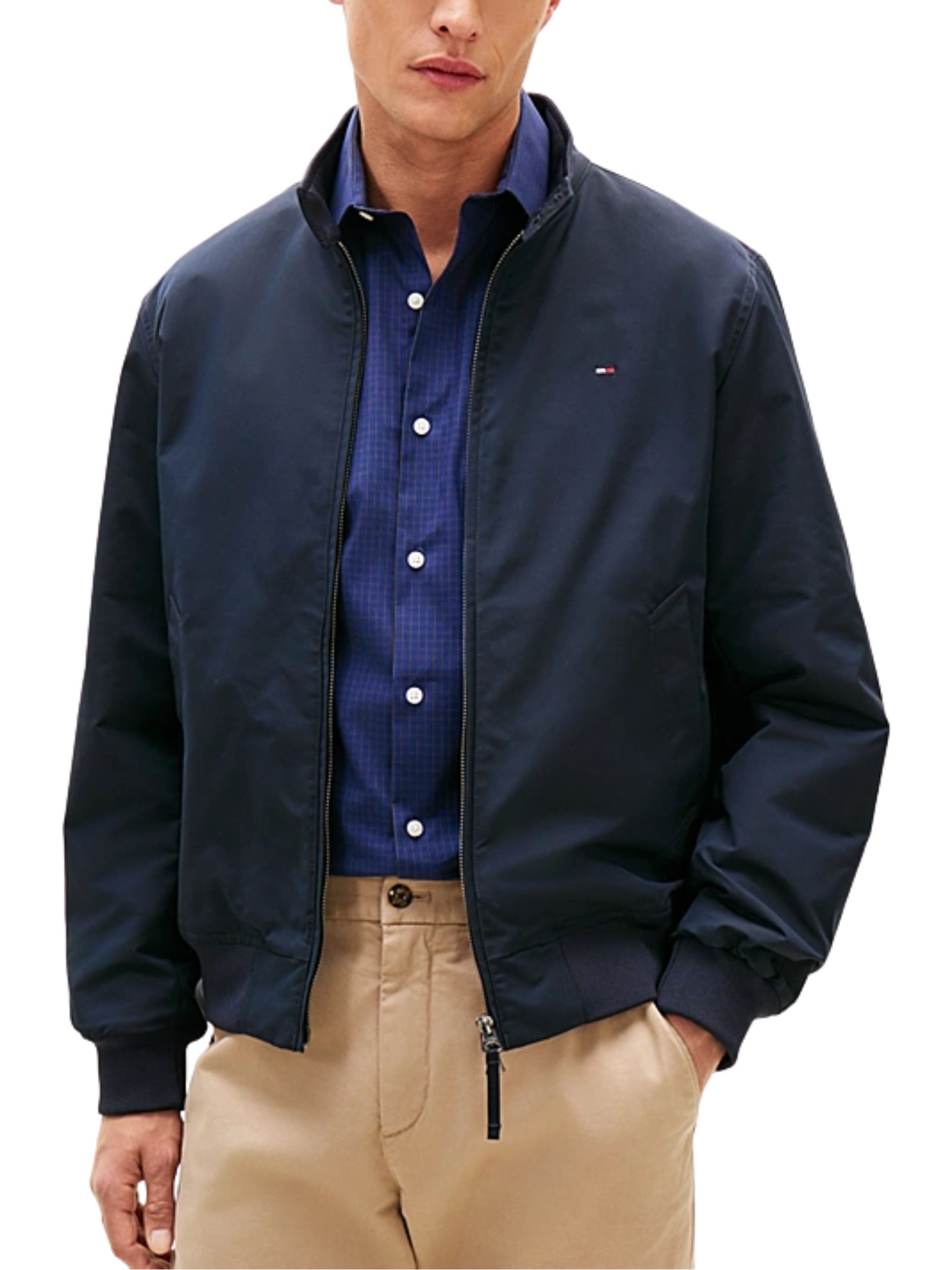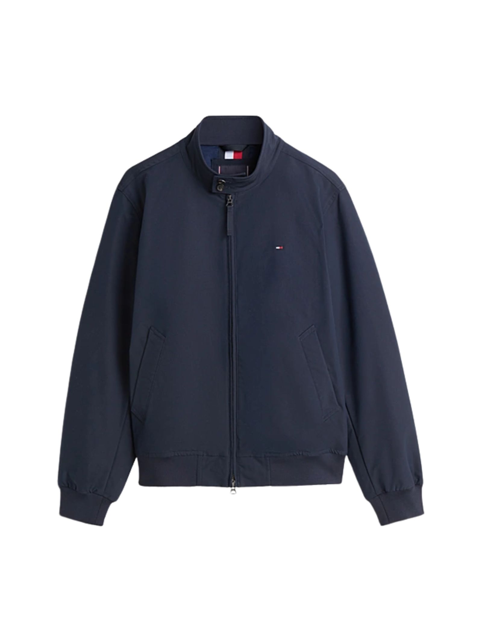 Giacca blu imbottita dal design raffinato con moderno collo a listino, rivisitazione contemporanea di un grande classico, realizzata in tessuto tecnico con imbottitura in poliestere, dotata di collo a listino con bottoni, chiusura con zip a doppio cursore, due tasche ad angolo sul davanti con bottone automatico, fondo e polsini a coste, mantellina sul retro, branding Tommy Hilfiger e bandierina ricamata sul petto, caratterizzata da relaxed fit con spalle leggermente scese; composizione: 54% elastomultiestere e 46% poliestere con interno in cotone.