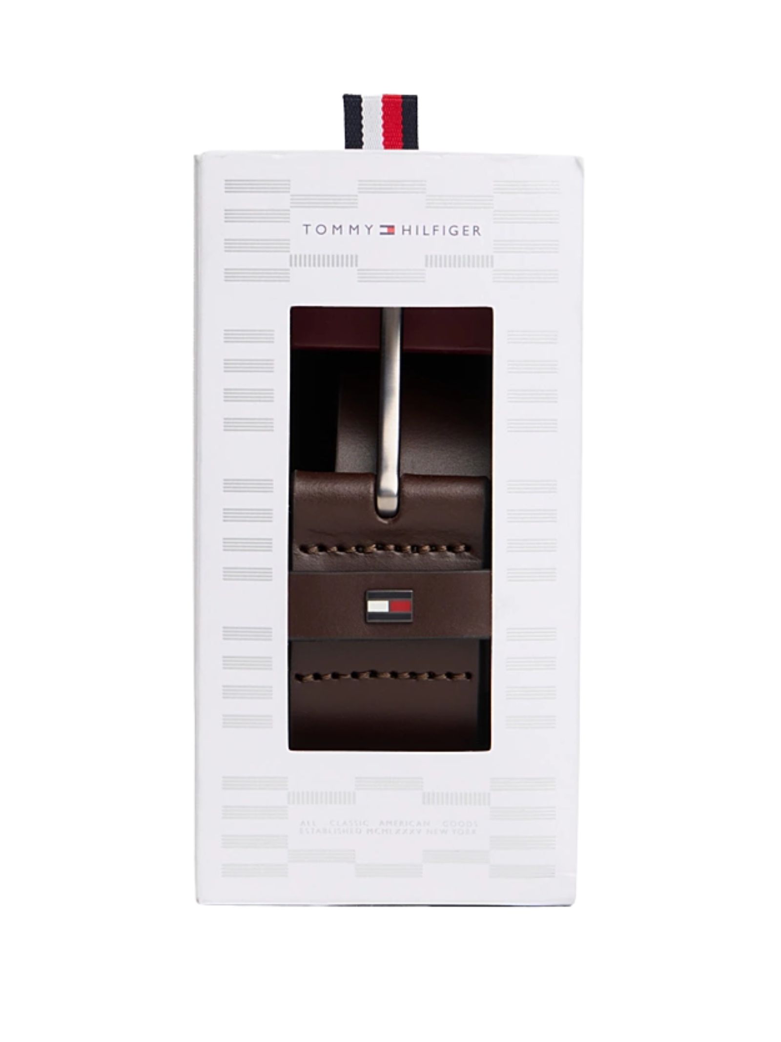 Cintura in pelle liscia con fibbia quadrata in metallo e bandierina smaltata sul passante, presentata in elegante confezione regalo. Larghezza: 4 cm. Composizione: 100% pelle.