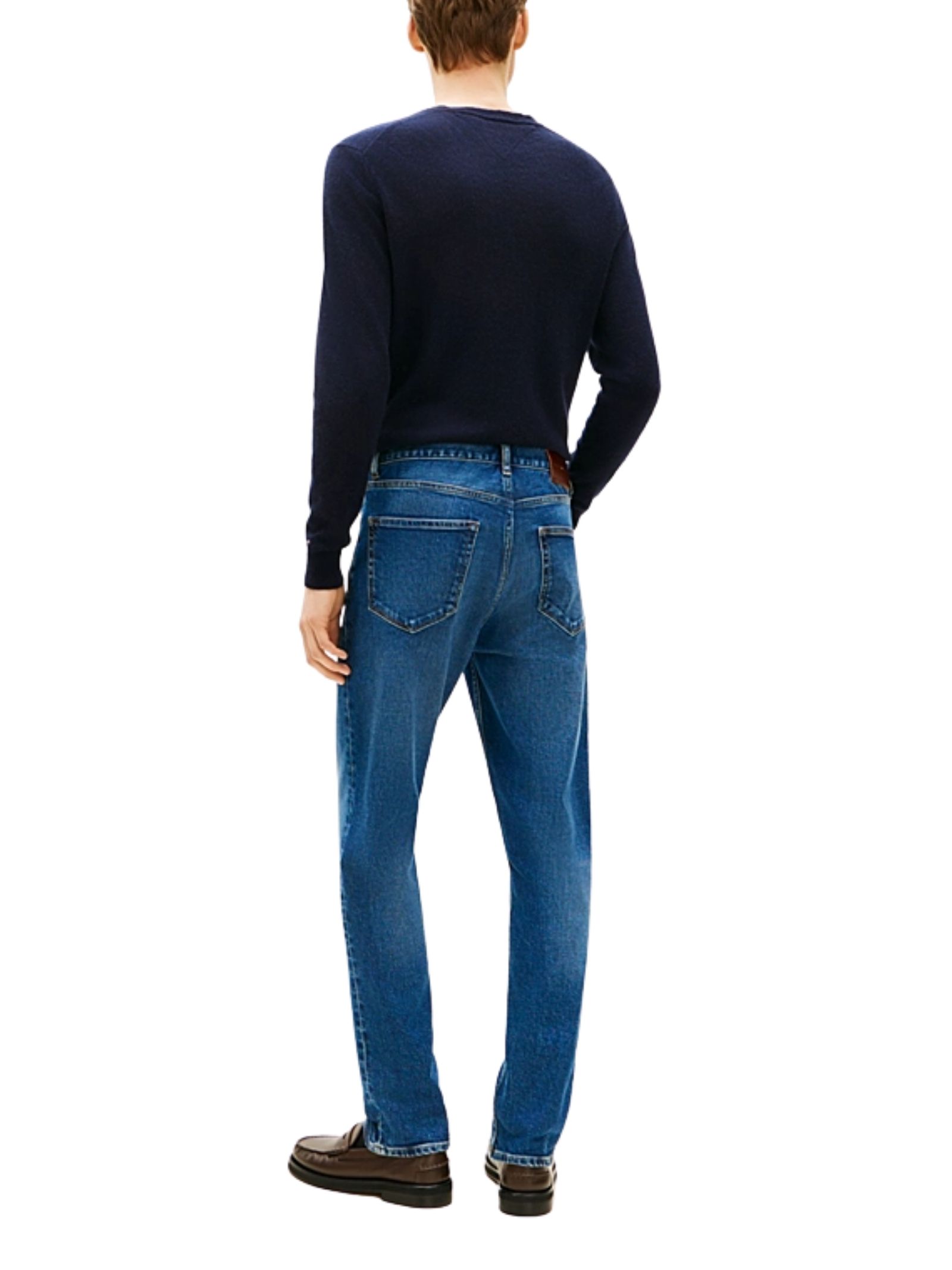Jeans dal taglio dritto con finitura scolorita, must have del weekend per uno stile vissuto dispirazione casual, realizzati in denim di cotone stretch con baffature e scoloriture sul davanti e sul retro, modello cinque tasche con nastro iconico sul taschino portamonete, branding Tommy Hilfiger e bandierina ricamata sulla tasca posteriore, straight fit, in 99% cotone e 1% elastan.